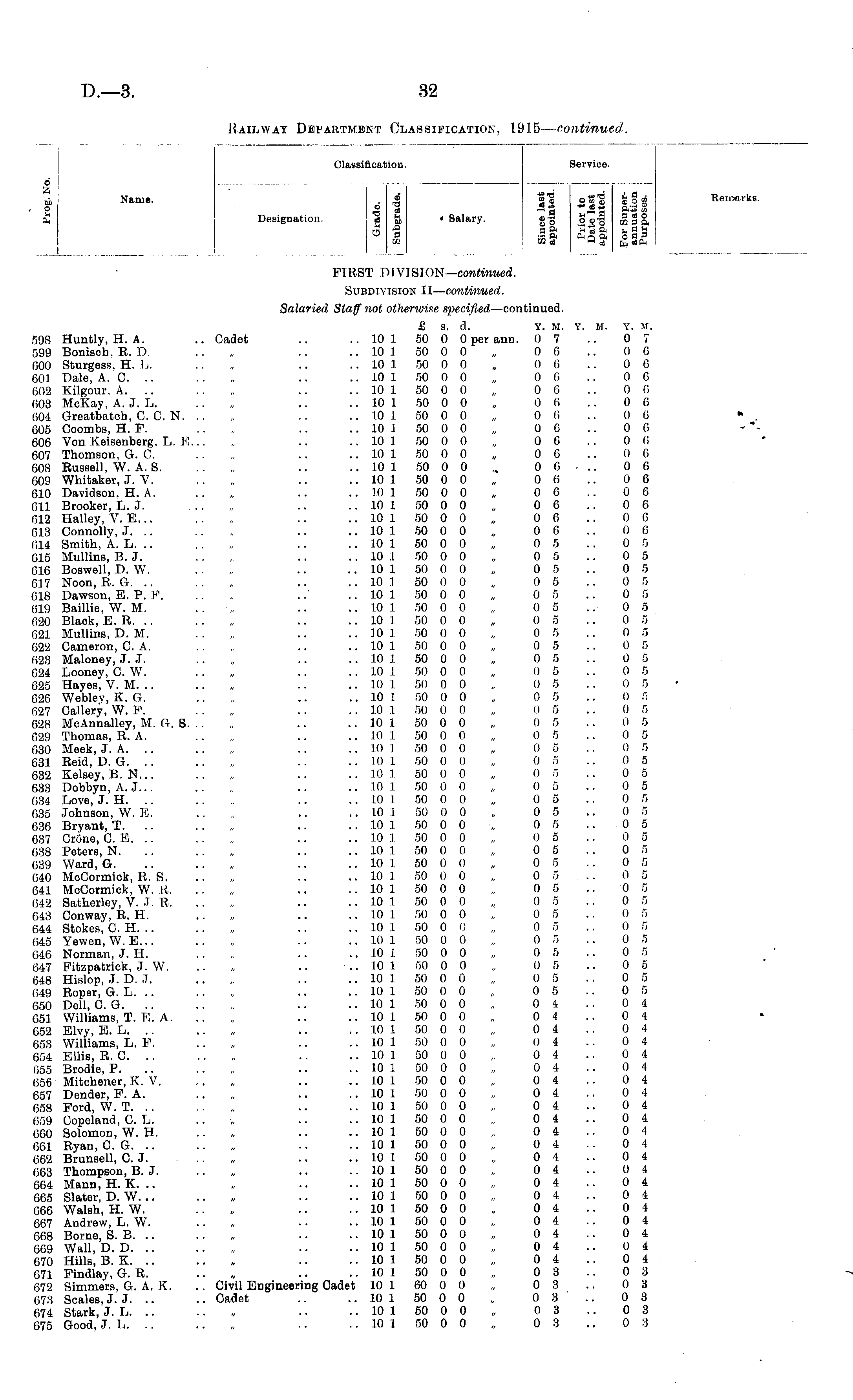 Classification. Service. ti Name. £ ® || o|| g| ® Remarks £ Designation. d & 'Salary. ®-g o u-g map, »§• FIRST D] VISION—continued. Subdivision II—continued. Salaried Staff not otherwise specified—continued. £ a. d. y. M. ¥. M. Y. M. 598 Huntly, H. A. .. Cadet .. .. 10 1 SO 0 Operant!. 0 7 .. 0 7 599 Bonisob, R. D. .. „ .. .. 10 1 50 0 0 „ 0 6 .. 0 G 600 Sturgess, H. L. .. „ .. .. 10 1 50 0 0 „ 0 0 .. 0 6 601 Dale, A. C. .. .. „ .. .. 10 1 50 0 0 „ 0 6 .. 0 6 602 Kilgour, A. .. „ .. .. 10 1 50 0 0 „ 0 6 .. 0 6 603 McKay, A. J. L. .. „ .. .. 10 1 50 0 0 „ 0 6 .. 0 6 604 Greatbatch, C. C. N. .. „ .. .. 10 1 50 0 0 „ 0 6 .. 0 6 605 Coombs, H. P. .. „ .. .,10 1 50 0 0 , 0 6 .. 0 6 606 Von Keisenberg, L, E... „ .. .. 10 1 50 0 0 „ 0 6 .. 0 6 607 Thomson, G. C .. .. 10 1 50 0 0 „ 0 6 .. 0 6 608 Russell, W. A. S .. .. 10 1 50 0 0 „ 0 6 .. 0 6 609 Whitaker, J. V. .. „ .. .. 10 1 50 0 0 „ 0 6 .. 0 6 610 Davidson, H. A. .. „ .. .. 10 1 50 0 0 „ 0 6 .. 0 6 611 Brooker, L. J. .. „ .. .. 10 1 50 0 0 „ 0 6 .. 0 6 612 Halley, V. E... .. „ .. .. 10 1 50 0 0 „ 0 6 .. 0 6 613 Connolly, J. .. .. .. 10 1 50 0 0 „ 0 6 .. 0 6 614 Smith, A. L. .. .. „ .. .. 10 1 50 0 0 „ 0 5 .. 0 5 615 Mullins, B. J. „ .. .. 10 1 50 0 0 „ 0 5 .. 0 5 616 Boswell, D. W. .. „ .. .. 10 1 50 0 0 „ 0 5 .. 0 5 617 Noon, R. G. .. .. „ .. .. 10 1 50 0 0 „ 0 5 .. 0 5 618 Dawson, E. P. F. .. „ .... 10 1 50 0 0 „ 05 .. 05 619 Baillie, W. M. .. •„ .. .. 10 1 50 0 0 „ 0 5 .. 0 5 620 Black, E. R. .. .. „ .. .. 10 1 50 0 0 „ 0 5 .. 0 5 621 Mullins, D. M. .. „ .. .. 10 1 50 0 0 „ 0 5 .. 0 5 622 Cameron, C. A. . . .. .. 10 1 50 0 0 „ 0 5 .. 0 5 623 Maloney, J. J. .. „ .. .. 10 1 50 0 0 „ 0 5 .. 0 5 624 Looney, C. W. .. „ .. .. 10 1 50 0 0 „ 0 5 .. 0 5 625 Hayes, V. M. .. .. „ .. .. 10 1 50 0 0 „ 0 5 .. 0 5 626 Webley, K. G. .. „ .. .. 10 1 50 0 0 „ 0 5 .. 0 5 627 Callery, W. F. .. „ .. ., 10 1 50 0 0 „ 0 5 .. 0 5 628 McAnnalley, M. G. S. .. „ .. .. 10 1 50 0 0 „ 0 5 .. 0 5 629 Thomas, R. A. .. „ .. .. 10 1 50 0 0 „ 0 5 .. 0 5 630 Meek, J. A. .. .. „ .. .. 10 1 50 0 0 „ 0 5 .. 0 5 631 Reid, D. G. .. .. „ .. .. 10 1 50 0 0 „ 0 5 .. 0 5 632 Kelsey, B.N... .. „ .. .. 10 1 50 0 0 „ 0 5 .. 0 5 633 Dobbyn, A. J... .. .. .. 10 1 50 0 0 „ 0 5 .. 0 5 634 Love, J. H. .. .. „ .. .. 10 1 50 0 0 „ 0 5 .. 0 5 635 Johnson, W. E. .. .. ..10 1 50 0 0 „ 05 .. 05 636 Bryant, T. .. „ .. ..10 1 50 0 0 , 0 5 .. 0 5 037 Criine, C. E. .. ,. „ .. .. 10 1 50 0 0 „ 0 5 .. 0 5 638 Peters, N. .. .. „ .. .. 10 1 50 0 0 „ 0 5 .. 0 5 639 Ward, G. .. .. „ .. .. 10 1 50 0 0 „ 0 5 .. 0 5 640 MoCormick, R. S .. .. 10 1 50 0 0 „ 0 5 .. 0 5 641 McCormiok, W. K .. .. 10 1 50 0 0 „ 0 5 .. 0 5 642 Satherley, V. J. R .. .. 10 1 50 0 0 „ 0 5 .. 0 5 643 Conway, R. H. .. „ .. .. 10 1 50 0 0 „ 0 5 .. 0 5 644 Stokes, C. H. .. .. „ .. .. 10 1 50 0 0 „ 0 5 .. 0 5 645 Yewen, W. E... .. „ .. .. 10 1 50 0 0 „ 0 5 .. 0 5 646 Norman, J. H. .. „ .. .. 10 1 50 0 0 „ 0 5 .. 0 5 647 Fitzpatriok, J. W. .. „ .. .. 10 1 50 0 0 „ 0 5 .. 0 5 648 Hislop, J. D. J. .. „ .. .. 10 1 50 0 0 „ 0 5 .. 0 5 049 Roper, G. L. .. .. „ .. .. 10 1 50 0 0 „ 0 5 .. 0 5 650 Dell, C. G. .. .. „ .. .. 10 1 50 0 0 „ 0 4 .. 0 4 651 Williams, T. E. A. .. .. .. 10 1 50 0 0 0 4 .. 0 4 652 Elvy, E. L. .. .. „ .. .. 10 1 50 0 0 „ 0 4 .. 0 4 653 Williams, L. F. .. „ .. .. 10 1 50 0 0 „ 0 4 .. 0 4 654 Ellis, R. C. .. .. „ .. .. 10 1 50 0 0 „ 0 4 .. 0 4 655 Brodie, P .. .. 10 1 50 0 0 0 4 .. 0 4 656 Mitchener, K. V. .. „ .. .. 10 1 50 0 0 „ 0 4 .. 0 4 657 Dender, F. A. .. „ .. .. 10 1 50 0 0 „ 0 4 .. 0 4 658 Ford, W. T. .. „ .. .. 10 1 50 0 0 „ 0 4 .. 0 4 659 Copeland, C. L. .. „ .. .. 10 1 50 0 0 „ 0 4 .. 0 4 660 Solomon, W. H. .. „ .. .. 10 1 50 0 0 „ 0 4 .. 0 4 661 Ryan, C. G. .. .. „ .. .. 10 1 50 0 0 „ 0 4 .. 0 4 662 Brunsell, C. J. „ .. .. 10 1 50 0 0 „ 0 4 .. 0 4 663 Thompson, B. J. .. „ .. .. 10 1 50 0 0 „ 0 4 .. 0 4 664 Mann, H. K. .. „ .. .. 10 1 50 0 0 „ 0 4 .. 0 4 665 Slater, D. W .. .. 10 1 50 0 0 „ 0 4 .. 0 4 666 Walsh, H. W. .. „ .. .. 10 1 50 0 0 „ 0 4 .. 0 4 667 Andrew, L. W. .. „ .. .. 10 1 50 0 0 „ 0 4 .. 0 4 668 Borne, S. B .. .. 10 1 50 0 0 „ 0 4 .. 0 4 669 Wall, D. D .. .. 10 1 50 0 0 „ 0 4 .. 0 4 670 Hills, B. K. .. .. „ .. .. 10 1 50 0 0 „ 0 4 .. 0 4 671 Findlay, G. R. .. „ .. .. 10 1 50 0 0 „ 0 3 .. 0 3 672 Simmers, G. A. K. .. Civil Engineering Cadet 10 1 60 0 0 „ 0 3 .. 0 3 673 Scales, J. J. .. .. Cadet .. .. 10 1 50 0 0 „ 0 3 .. 0 3 674 Stark, J. L. .. .. „ .. .. 10 1 50 0 0 „ 0 3 .. 0 3 675 Good, J. L. ., .. „ .. .. 10 1 50 0 0 „ 0 3 .. 0 3