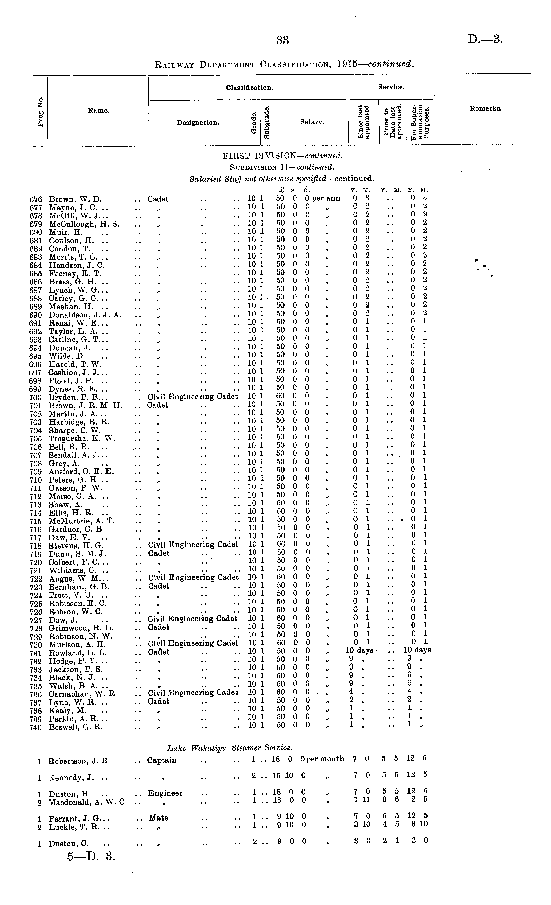 Classification. Service. 0 * Name. ® llslllls Remarks. £ Designation. a S Salary. ®5 o®o o> sa 03 -=o.fi<Qftoa 3 FIRST DIVISION—continued. Subdivision II—continued. Salaried Staff not otherwise specified—continued. £ s. d. Y. M. Y. M. Y. M. 676 Brown, W. D. .. Cadet .. ..10 1 50 0 0 per ann. 03 .. 03 677 Mayne, J. C .. .. 10 1 50 0 0 „ 0 2 .. 0 2 678 McGill, W. J... .. „ .. .. 10 1 50 0 0 „ 0 2 .. 0 2 679 McCullougb, H. S. .. „ .. .. 10 1 50 0 0 „ 0 2 .. 0 2 680 Muir, H. .. .. „ .. .. 10 1 50 0 0 „ 0 2 .. 0 2 681 Coulson, H. .. .. „ .. .. 10 1 50 0 0 „ 0 2 .. 0 2 682 Condon, T. .. „ .. .. 10 1 50 0 0 „ 0 2 .. 0 2 683 Morris, T. C .. .. 10 1 50 0 0 „ 0 2 .. 0 2 684 Hendren, J. O. .. „ .. .. 10 1 50 0 0 „ 0 2 .. 0 2 685 Feeney, E. T. .. „ .. .. 10 1 50 0 0 , 0 2 .. 0 2 686 Brass, G. H. ., .. „ .. .. 10 1 50 0 0 „ 0 2 .. 0 2 687 Lynoh, W. G. .. .. „ .. .. 10 1 50 0 0 „ 0 2 .. 0 2 688 Carley, G. C. .. .. „ .. .. 10 1 50 0 0 „ 0 2 .. 0 2 689 Meehan, H. .. .. „ .. .. 10 1 50 0 0 „ 0 2 .. 0 2 690 Donaldson, J. J. A. „ .. .. 10 1 50 0 0 „ 0 2 .. 0 2 691 Renai, W. E. .. .. „ .. .. 10 1 50 0 0 „ 0 1 .. 0 1 692 Taylor, L. A. .. .. „ .. 10 1 50 0 0 „ 0 1 .. 0 1 693 Carline, G. T... .. „ .. .. 10 1 50 0 0 „ 0 1 .. 0 1 694 Dunoan, J. .. „ ■ • .. 10 1 50 0 0 „ 0 1 .. 0 .1 695 Wilde, D. .. .. „ .. .. 10 1 50 0 0 „ 0 1 .. 0 1 696 Harold, T. W. .. „ .. .. 10 1 50 0 0 „ 0 1 .. 0 1 697 Cashion, J. J... .. „ .. .. 10 1 50 0 0 „ 0 1 .. 0 1 698 Flood, J. P. .. .. „ .. .. 10 1 50 0 0 „ 0 1 .. 0 1 699 Dynes, RE... .. „ .. .. 10 1 50 0 0 „ 0 1 .. 0 1 700 Bryden, P. B... .. Civil Engineering Cadet 10 1 60 0 0 „ 0 1 .. 0 1 701 Brown, J. R. M. H. .. Cadet .. .. 10 1 50 0 0 „ 0 1 .. 0 1 702 Martin, J. A. .. .. „ .. .. 10 1 50 0 0 „ 0 1 .. 0 1 703 Harbidge, R. R. .. » .. .. 10 1 50 0 0 „ 0 1 .. 0 1 704 Sharpe, C. W. .. „ • • .. 10 1 50 0 0 „ 0 1 .. 0 1 705 Tregurtha, K. W. .. „ .. .. 10 1 50 0 0 „ 0 1 .. 0 1 706 Bell, R. B. .. ... „ .. .. 10 1 50 0 0 „ 0 1 .. 0 1 707 Sendall, A. J. .. .. „ .. .. 10 1 50 0 0 „ 0 1 .. 0 1 708 Grey, A. .. .. ,, • • .. 10 1 50 0 0 „ 0 1 .. 0 1 709 Ansford, C. E. E. .. „ .. .. 10 1 50 0 0 „ 0 1 .. 0 1 710 Peters, G. H. .. .. „ .. .. 10 1 50 0 0 „ 0 1 .. 0 1 711 Gasson, P. W. .. ,, • • .. 10 1 50 0 0 „ 0 1 .. 0 1 712 Morse, G. A. .. .. „ • • .. 10 1 50 0 0 „ 0 1 .. 0 1 713 Shaw, A. .. .. „ • • .. 10 1 50 0 0 „ 0 1 .. 0 1 714 Ellis, H. R. .. .. „ .. .. 10 1 50 0 0 „ 0 1 .. 0 1 715 McMurtrie, A. T. .. „ .. .. 10 1 50 0 0 „ 0 1 • 0 1 716 Gardner, C. B. .. „ •. .. 10 1 50 0 0 „ 0 1 .. 0 1 717 Gaw, E. V. .. .. „ • ■ .. 10 1 50 0 0 „ 0 1 .. 0 1 718 Stevens, H. G. .. Civil Engineering Cadet 10 1 60 0 0 „ 0 1 .. 0 1 719 Dunn, S. M. J. .. Cadet .. .. 10 1 50 0 0 „ 0 1 .. 0 1 720 Colbert, F. C. .. .. „ . • ' 10 1 50 0 0 „ 0 1 .. 0 1 721 Williams, C. .. .. „ • • .. 10 1 50 0 0 „ 0 1 .. 0 1 722 Angus, W. M... .. Civil Engineering Cadet 10 1 60 0 0 „ 0 1 .. 0 1 723 Bernhard, G. B. .. Cadet ■. 10 1 50 0 0 „ 0 1 .. 0 1 724 Trott, V. U. .. .. . • • .. 10 1 50 0 0 „ 0 1 .. 0 1 725 Robieson, E. C. .. •• .. 10 1 50 0 0 „ 0 1 .. 0 1 726 Robaon, W. C. .. » • • .. 10 1 50 0 0 „ } " ? , 727 Dow, J. .. •. Civil Engineering Cadet 10 1 60 0 0 „ 0 1 .. 0 1 728 Grimwood, R. L. .. Cadet .. .. 10 1 50 0 0 „ 0 1 .. 0 1 729 Robinson, N. W. .. „ • ■ .. 10 1 50 0 0 „ 0 1 .. 0 1 730 Murison, A. H. .. Civil Engineering Cadet 10 1 60 0 0 „ 0 1 .. 0 1 731 Rowland, L. L. .. Cadet .. .. 10 1 50 0 0 „ 10 days .. 10 days 732 Hodge, F. T. .. .. „ • • .. 10 1 50 0 0 „ 9 „ .. 9 „ 733 Jaokson, T. S. .. „ •• .. 10 1 50 0 0 „ 9 „ .. 9 „ 734 Black, N. J. .. .. „ .. 10 1 50 0 0 „ 9 , .. 9 „ 735 Walsh, B. A... .. „ ■■ .. 10 1 50 0 0 „ 9 „ .. 9 „ 736 Carnachan, W. R. .. Civil Engineering Cadet 10 1 60 0 0 . „ 4 „ .. 4 „ 737 Lyne, W. R. .. .. Cadet .. .. 10 1 50 0 0 „ 2 „ .. 2 „ 738 Kealy, M. .. .. „ •• ■ • 10 1 50 0 0 „ 1 „ .. 1 „ 739 Parkin, A. R. .. .. ,, • • .. 10 1 50 0 0 „ 1 „ .. l „ 740 BoBwell, G. R. .. » •• .. 10 1 50 0 0 „ 1 „ .. 1 „ Lake Wakatipu Steamer Service. 1 Robertson, 3. B. .. Captain .. .. 1 .. 18 0 Opermonth 7 0 5 5 12 5 1 Kennedy, J. .. .. „ ■ ■ .. 2 .. 15 10 0 „ 7 0 5 5 12 5 1 Duston, H. .. .. Engineer .. 1 .. 18 0 0 „ 7 0 5 5 12 5 2 Macdonald, A. W. C. .. „ • ■ • ■ 1 .. 18 0 0 „ 1 11 0 6 1 Farrant, J. G... .. Mate .. .. 1 .. 9 10 0 „ 7 0 5 5 12 5 2 Luckie, T. R. .. .. „ •. .. 1 .. 9 10 0 » 3 10 4 5 3 10 1 Duston, C •• .. 2 .. 9 0 0 „ 3 0 2 1 3 0