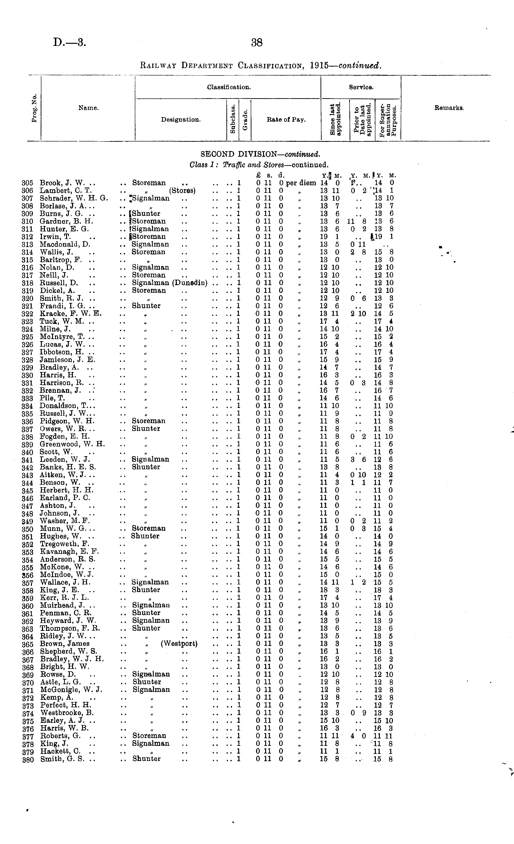 Classification. Service. o £ . . I , ab Name. ® . nl S§m Remarks. O 03 Cl M £ Designation. o « Rate of Pay. g-g §©'§ S § a 3 r h W SS" a °9n 3 02 o3 W cS fq cfiPn SECOND DIVISION—continued. Class 1: Traffic and Stores—continued. £ s. d. y| m, ,y. M J Y. m. 305 Brook, J. W. .. .. Storeman .. .... 1 0 11 0 per diem 14 0 S3.. 14 0 306 Lambert, 0. T. .. „ (Storos) .... 1 0 11 0 „ 13 11 0 2 "14 1 307 Sohrader, W. H. G. .. .. .... 1 0 11 0 „ 13 10 .. 13 10 308 Borlase, J. A. .. .. „ .. .... 1 0 11 0 „ 13 7 13 7 309 Burns, J. G. .. .. .... 1 0 11 0 „ 13 6 .. 13 6 310 Gardner, B. H. .. JStoreman .. .. .. 1 0 11 0 „ 13 6 11 8 13 6 311 Hunter, E. G. .. {Signalman .. .... 1 0 11 0 , 13 6 0 2 13 8 312 Irwin, T. .. .. .. .... 1 0 11 0 „ 191 .. $,19 1 313 Macdonald,D. .. Signalman .. .... 1 0 11 0 „ 13 5 0 11 .. . 314 Wallis, J. .. .. Storeman .. .... 1 0110 „ 13 0 2 8 15 8 315 Barltrop, F. .. .. „ .. .... 1 0 11 0 „ 13 0 .. 13 0 316 Nolan, D. .. .. Signalman .. .... 1 0 11 0 „ 12 10 .. 12 10 317 Neill, J. .. .. Storeman .. .... 1 0 11 0 „ 12 10 .. 12 10 318 Bussell, D. .. .. Signalman (Dunedio) .... 1 0110 „ 12 10 .. 12 10 319 Diokel, A. .. .. Storeman .. .... 1 0 11 0 „ 12 10 .. 12 10 320 Smith, B. J. .. .. „ .. .... 1 0 11 0 „ 12 9 0 6 13 3 321 Frandi, I. G. .. .. Shunter .. .... 1 0 11 0 „ 12 6 .. 12 6 322 Kraoke, F. W. E. .. . .. .... 1 0 11 0 „ 13 11 2 10 14 5 323 Tuck, W. M. .. .. „ .. .... 1 0 11 0 „ 17 4 .. 17 4 324 Milne, J. .. .. „ ... .... 1 0 11 0 „ 14 10 ..14 10 325 Melntyre, T. .. .. „ .. .... 1 0 11 0 „ 15 2 .. 15 2 326 Luoas, J. W. .. .. „ .. .... 1 0 11 0 16 4 .. 16 4 327 Ibbotson, H. .. .. „ .. .... 1 0 11 0 „ 17 4 .. 174 328 Jamieson, J. E. .. „ .. .... 1 0 11 0 „ 15 9 .. 15 9 329 Bradley, A. .. .. „ .. .... 1 0110 „ 14 7 .. 14 7 330 Harris, H. .. .. „ .. .... 1 0 11 0 , 16 3 .. 16 3 331 HarriBon, B. .. .. „ .. .... 1 0 11 0 „ 14 5 0 3 14 8 332 Brennan, J. ..' .. , .. .... 1 0 11 0 „ 16 7 .. 16 7 333 Pile, T. .. .. . .. .... 1 0 11 0 „ 14 6 .. 14 6 334 Donaldson, T... .. „ .. .... 1 0 11 0 „ 1110 ..1110 335 Bussell, J. W... .. . .. .... 1 0 11 0 „ 11 9 .. 11 9 336 Pidgeon, W. H. .. Storeman ,. .... 1 0 11 0 „ 11 8 .. 11 8 337 Owers, W. B. .. .. Shunter .. .... 1 0110 „ 11 8 .. 11 8 338 Fogden, E. H. .. „ .. .... 1 0110 „ 11 8 0 2 11 10 339 Greenwood, W. H. .. „ .. .... 1 0 11 0 „ 11 6 11 6 340 Soott, W. .. .. „ .. .... 1 0110 „ 116 11 6 341 Leeden, W.J. .. Signalman .. .... 1 0110 „ 11 5 3 6 12 6 342 Banks, H. E. S. .. Shunter .. .... 1 0 11 0 „ 13 8 .. 13 8 343 Aitken, W. J. .. .. „ .. .... 1 0110 „ 11 4 0 10 12 2 344 Benson, W. .. .. „ .. .... 1 0 11 0 „ 11 3 1 1 11 7 345 Herbert, H. H. ... „ .. .... 1 0 11 0 „ 11 0 11 0 346 Earland, P. C. .. „ .. .... 1 0 11 0 „ 11 0 11 0 347 Ashton, J. .. .. „ .. .... 1 0 11 0 „ 11 0 11 0 348 Johnson, J. .. „ .. .... 1 0110 „ 110 11 0 349 Washer, M. F. .. „ .. .... 1 0 11 0 „ 11 0 0 2 11 2 350 Munn, W. G. .. .. Storeman .. .... 1 0 11 0 „ 15 1 0 3 15 4 351 Hughes, W. .. .. Shunter .. .... 1 0 11 0 „ 14 0 .. 14 0 352 Tregoweth, F. .. „ .. .... 1 0 11 0 „ 14 9 14 9 353 Kavanagh, E. F. .. „ .. .... 1 0 11 0 „ 14 6 .. 14 6 354 Anderson, B. S. .. „ .. .... 1 0 11 0 „ 15 5 15 5 355 MoKone, W. .. .. . .. .... 1 0 11 0 „ 14 6 .. 14 6 856 Molndoe, W.J. .. „ .. .... 1 0110 „ 15 0 15 0 357 Wallace, J. H. .. Signalman .. .... 1 0 11 0 „ 14 11 1 2 15 5 358 King, J. E. .. .. Shunter .. .... 1 0 11 0 „ 18 3 .. 18 3 359 Kerr, R. J. L. .. , .. .... 1 0 11 0 „ 17 4 17 4 360 Muirhead, J. .. .. Signalman .. .... 1 0 11 0 „ 13 10 .. 13 10 361 Penman, C. B. .. Shunter .. .... 1 0 11 0 „ 14 5 .. 14 5 362 Heyward, J. W. .. Signalman .. .... 1 0 11 0 „ 13 9 .. 13 9 363 Thompson, F. B. .. Shunter .. .... 1 0110 „ 13 6 .. 13 6 364 Ridley, J. W. .. .. „ .. .... 1 0110 „ 13 5 13 5 365 Brown, James .. „ (Westport) .... 1 0 11 0 „ 13 3 .. 13 3 366 Shepherd, W. S. .. „ .. .... 1 0110 „ 16 1 16 1 367 Bradley, W. J. H. .. „ .. .... 1 0 11 0 „ 16 2 .. 16 2 368 Bright, H. W. .. „ .. .... 1 0 11 0 „ 13 0 13 0 369 Rowse, D. .. .. Signalman .. .... 1 0 11 0 ,, 12 10 .. 12 10 370 Astle, L. G. .. .. Shunter .. .... 1 0 11 0 „ 12 8 .. 12 8 371 McGonigle, W. J. .. Signalman .. .... 1 0110 „ 12 8 .. 128 372 Kemp, A. .. .. „ .. .... 1 0 11 0 „ 12 8 12 8 373 Perfect, H. H. .. „ .. .... 1 0110 „ 12 7 .. 12 7 374 WeBtbrooke, B. .. „ .. .... 1 0 11 0 „ 13 3 0 9 13 3 375 Earley, A. J. .. .. „ .. .... 1 0 11 0 „ 15 10 15 10 376 Harris, W. B. .. „ .. .. .. 1 0 11 0 „ 16 3 16 3 377 Boberts, G. .. .. Storeman .. .... 1 0 11 0 „ 11 11 4 0 11 11 378 King, J. .. .. Signalman .. .... 1 0110 ,, 118 .. 118 379 Hackett, C. .. .. „ .. .... 1 0 11 0 „ 111 ..111 380 Smith, G. S. .. .. Shunter .. .... 1 0 11 0 „ 15 8 .. 15 8