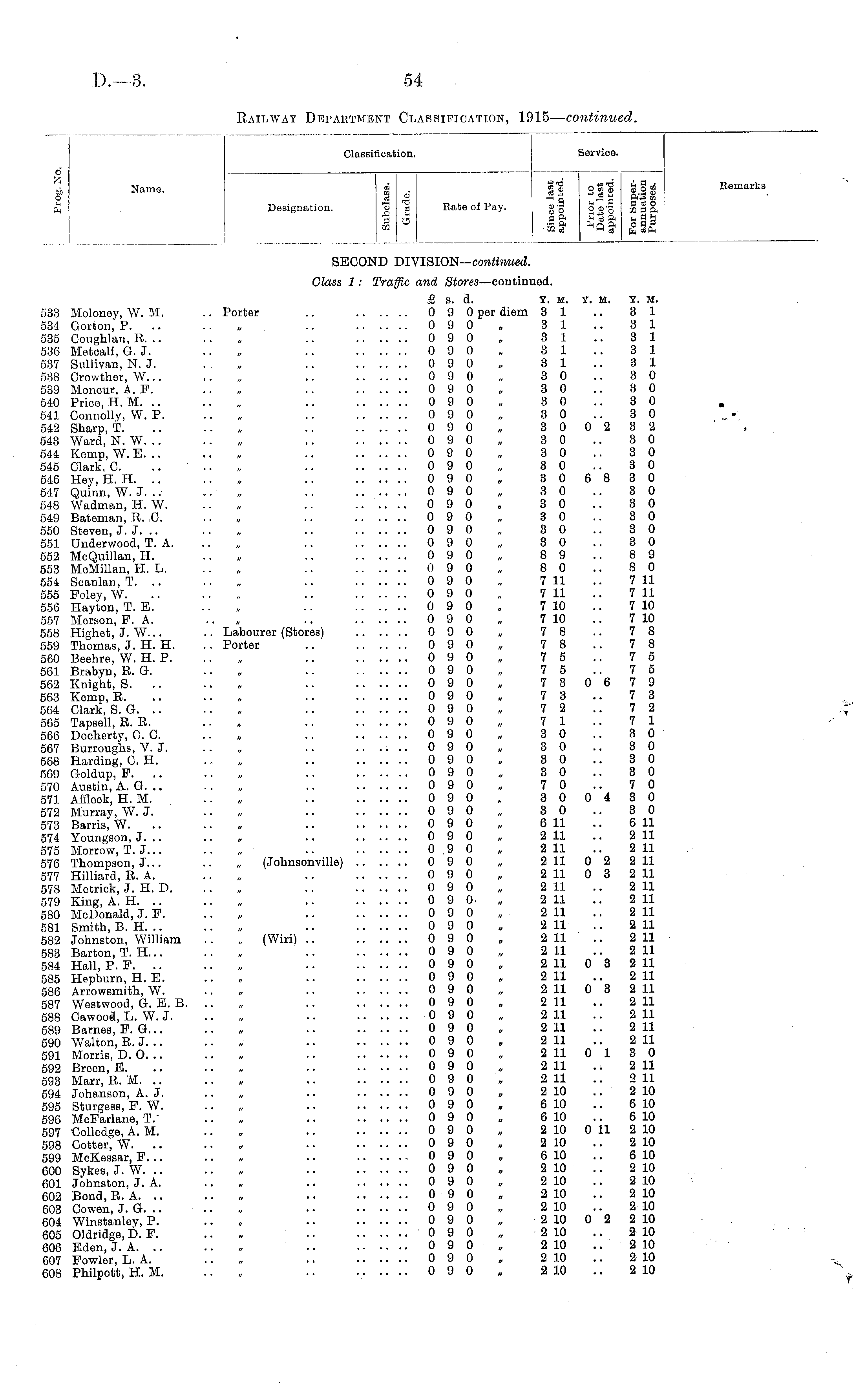 Classification. Service, o" rf, Name. g 11 8.2$ Remarks 9 4H fO rtg ftpdl £ Designation. « <a Bate of Pay. «•£ o «•§ 5s a a ffl aft I 02 -n j ft ° 9^ c6 H cj c6H SECOND DIVISION—continued. Class 1 : Traffic and Stores —continued. £ s. d. Y. M. Y. M. Y. M. 533 Moloney, W. M. .. Porter .. 0 9 0 per diem 3 1 .. 3 1 534 Gorton, P. .. „ .. 0 9 0 „ 3 1 .. 3 1 535 ConghS tin. R. .. .. „ .. 090 „ 31 .. 31 536 Metcalf, G. J. .. „ .. 0 9 0 „ 3 1 .. 3 1 537 Sullivan, N. J. . . ,, .. 0 9 0 „ 3 1 .. 3 1 538 Crowther, W... .. „ .. 090 „ 30 .. 30 539 Moneur, A. P. .. „ .. 0 9 0 „ 3 0 .. 3 0 540 Price, H. M. .. .. „ .. ...... 0 9 0 „ 30 .. 30 541 Connolly, W. P. .. „ .. 0 9 0 „ 3 0 .. 3 0 542 Sharp, T. .. .. „ .. 0 9 0 „ 3 0 0 2 3 2 543 Ward, N. W. .. .. . .. 0 9 0 » 3 0 .. 3 0 544 Kemp, W. E. .. .. » .. 0 9 0 „ 3 0 .. 3 0 545 Clark, C. .. .. „ .. 0 9 0 „ 3 0 .. 3 0 546 Hey, H. H. .. .. „ .. 0 9 0 . 3 0 6 8 3 0 547 Quinn, W. J- .. . • „ .. 0 9 0 „ 3 0 .. 3 0 548 Wadman, H. W. .. „ .. 0 9 0 . 3 0 .. 3 0 549 Bateman, R. ,0. .. » .. 0 9 0 „ 3 0 .. 3 0 550 Steven, J. J. .. .. „ .. 0 9 0 „ 3 0 .. 3 0 551 Underwood, T. A. .. „ .. 0 9 0 „ 3 0 .. 3 0 552 MoQuillan, H. .. „ .. 0 9 0 „ 8 9 .. 8 9 553 McMillan, H. L. .. „ .. 0 9 0 „ 8 0 .. 8 0 554 Seanlan, T. .. „ .. 0 9 0 „ 7 11 .. 7 11 555 Foley, W. .. .. „ .. 0 9 0 „ 7 11 .. 7 11 556 Hayton, T. E. .. „ .. 0 9 0 „ 7 10 .. 7 10 557 Merson, P. A. „ .. 0 9 0 „ 7 10 .. 7 10 558 Highet, J. W... .. Labourer (Stores) 090 „ 78 .. 78 559 Thomas, J. H. H. .. Porter .. 090 „ 78 .. 78 560 Beehre, W. H. P. .. ,, .. 0 9 0 „ 7 5 .. 7 5 561 Brabyn, R. G. .. „ ■■ 0 9 0 „ 7 5 .. 7 5 562 Knight, S. .. .. . .. 0 9 0 „ 7 3 0 6 7 9 563 Kemp, R. .. .. „ ■ ■ 090 „ 73 .. 73 564 Clark, S. G. .. .. ,, .. 0 9 0 „ 7 2 .. 7 2 565 Tapsell, R. R. .. » .. 0 9 0 „ 7 1 .. 7 1 566 Doeherty, C. C. .. „ .. 0 9 0 „ 3 0 .. 3 0 567 Burroughs, V. J. . - „ .. ...... 0 9 0 „ 30 .. 30 568 Harding, C. H. .. „ .. 0 9 0 „ 3 0 .. 3 0 569 Goldup, F. .. . .. 0 9 0 „ 3 0 .. 3 0 570 Austin, A. G. .. .. „ .. 0 9 0 „ 7 0 .. 7 0 571 Affleck, H. M. .. . .. 0 9 0 . 3 0 0 4 3 0 572 Murray, W. J. .. „ .. 0 9 0 „ 3 0 .. 3 0 573 Barris, W. .. .. „ .. 0 9 0 „ 6 11 .. 6 11 574 Youngson, J. .. .. „ .. 0 9 0 „ 2 11 .. 2 11 575 Morrow, T. J... „ •• 0 9 0 „ 2 11 .. 2 11 576 Thompson, J... .. „ (Johnsonville) 090 „ 2 11 02 2 11 577 Hilliard, R. A. .. „ .. 0 9 0 „ 2 11 0 3 2 11 578 Metrick, J. H. D. .. „ .. 0 9 0 „ 2 11 .. 2 11 579 King, A. H. .. .. „ .. 0 9 0 •„ 2 11 .. 2 11 580 McDonald, J. F. .. „ .. 0 9 0 „ 2 11 .. 2 11 581 Smith, B. H. .. .. „ .. 0 9 0 „ 2 11 .. 2 11 582 Johnston, William .. „ (Wiri) .. 0 9 0 „ 2 11 .. 2 11 583 Barton, T. H... .. „ .. 0 9 0 „ 2 11 .. 2 11 584 Hall, P. F. .. .. „ .. 0 9 0 . 2 11 0 3 2 11 585 Hepburn, H. E. .. „ .. 0 9 0 „ 2 11 .. 2 11 586 Arrowsmitli, W. .. „ .. 0 9 0 „ 2 11 0 3 2 11 587 Westwood, G. E. B. .. „ .. 0 9 0 „ 2 11 .. 2 11 588 Cawood, L. W. J. .. „ •. 0 9 0 „ 2 11 .. 2 11 589 Barnes, F. G... .. „ .. 0 9 0 „ 2 11 .. 2 11 590 Walton, R. J. .. .. „ .. 0 9 0 „ 2 11 .. 2 11 591 Morris, D. O. .. .. „ ■ • 0 9 0 „ 2 11 0 1 3 0 592 Breen, E. .. .. „ . • 0 9 0 „ 2 11 .; 2 11 593 Marr, R. M. .. .. „ .. 0 9 0 , 2 11 .. 2 11 594 Johanson, A.J. .. „ .. 0 9 0 „ 2 10 .. 2 10 595 Sturgess, F. W. .. „ 0 9 0 „ 6 10 .. 6 10 596 McFarlane, T." .. „ .. 0 9 0 „ 6 10 .. 6 10 597 Oolledge, A. M. .. „ ■. 0 9 0 „ 2 10 0 11 2 10 598 Cotter, W. .. .. . 0 9 0 „ 2 10 .. 2 10 599 MoKessar, F. .. .. „ .. 0 9 0 „ 6 10 .. 6 10 600 Sykes, J. W. .. .. „ 0 9 0 . 2 10 .. 2 10 601 Johnston, J. A. .. „ .. 0 9 0 „ 2 10 .. 2 10 602 Bond, R. A. .. .. , 0 9 0 „ 2 10 .. 2 10 603 Cowen, J. G. .. .. ■ 0 9 0 „ 2 10 .. 2 10 604 Winstanley, P. .. ,, .. 0 9 0 „ 2 10 0 2 2 10 605 Oldridge, D. F. .. „ ■ ■ 0 9 0 „ 2 10 .. 2 10 606 Eden, J. A. .. .. „ .. 0 9 0 „ 2 10 .. 2 10 607 Fowler, L. A. .. „ .. 0 9 0 „ 2 10 .. 2 10 608 Philpott, H. M. .. . .. 0 9 0 „ 2 10 .. 2 10