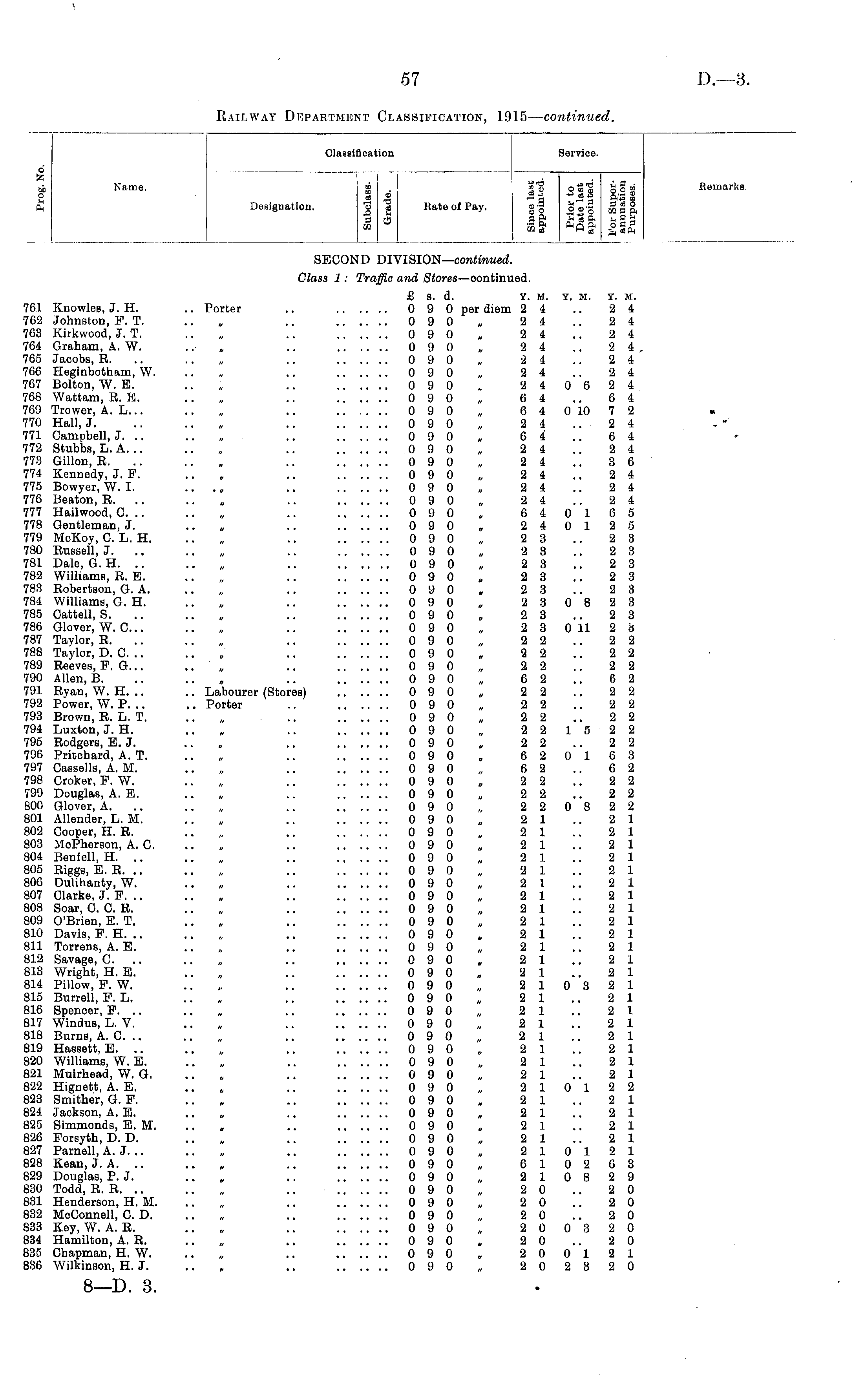 Classification Service. © ti Name. « . 5® 0 »® jo" Remarks. S ® BSS Cm Designation. o <a Rate of Pay. g'g § ®-g m s a ® aS 1 ggS SECOND DIVISION —continued. Class 1 : Traffic and Stores —continued. £ s. d. Y. m. v. M. Y. M. 761 Knowles, J. H. .. Porter .. 0 9 0 per diem 2 4 .. 2 4 762 Johnston, F. T. .. „ .. 090 „ 24 .. 24 763 Kirkwood, J. T. .. „ .. 090 „ 24 .. 24 764 Graham, A. W. „ .. 0 9 0 „ 2 4 .. 2 4, 765 Jacobs, R. .. .. „ .. 0 9 0 „ 2 4 .. 2 4 766 Heginbotham, W. .. „ .. 090 „ 24 .. 24 767 Bolton, W. E. .. „ .. 090 „ 240624 768 Wattam, R. E. .. „ .. 090 „ 64 .. 64 769 Trower, A. L... .. „ .. .. .... 0 9 0 „ 6 4 0 10 7 2 770 Hall, J. .. .. „ .. 0 9 0 „ 2 4 .. 2 4 771 Campbell, J. .. .. „ .. 0 9 0 „ 6 4 .. 6 4 772 Stubbs, L. A. .. .. „ .. 0 9 0 „ 2 4 .. 2 4 773 Gillon, R. .. .. „ .. 0 9 0 „ 2 4 .. 3 6 774 Kennedy, J. F. .. „ .. 090 „ 24 .. 24 775 Bowyer, W. I. ...» .. 0 9 0 „ 24 .. 24 776 Beaton, R. .. „ .. 0 9 0 „ 2 4 .. 2 4 777 Hailwood, C. .. .. „ .. 0 9 0 „ 6 4 0 1 6 5 778 Gentleman, J. .. „ .. 090 „ 240125 779 McKoy, C. L. H. .. „ .. 0 9 0 „ 2 3 .. 2 3 780 Russell, J. .. „ .. 0 9 0 „ 2 3 .. 2 3 781 Dale, G.H. .. .. „ .. 090 „ 23 .. 23 782 WilliamB, R. E. .. „ .. 0 9 0 „ 2 3 .. 2 3 783 Robertson, G. A. .. „ .. 0 9 0 „ 2 3 .. 2 3 784 Williams, G. H. .. „ .. 0 9 0 „ 2 3 0 8 2 3 785 Cattell, S. .. .. „ .. 0 9 0 „ 2 3 .. 2 3 786 Glover, W. C... .. „ .. 0 9 0 „ 2 3 0 11 2 3 787 Taylor, R. .. „ .. 0 9 0 2 2 .. 2 2 788 Taylor, D. C. .. .. „ .. 0 9 0 . 2 2 .. 2 2 789 Reeves, E.G... .. „ .. 0 9 0 „ 2 2 .. 2 2 790 Allen, B. .. .. „ .. 0 9 0 „ 6 2 .. 6 2 791 Ryan, W. H. .. .. Labourer (Stores) 090 „ 22 .. 22 792 Power, W. P. .. .. Porter 090 „ 22 .. 22 793 Brown, R. L. T. .. „ .. 0 9 0 „ 2 2 .. 2 2 794 Luxton, J. H. .. „ .. 090 „ 221522 795 Rodgers, E. J. .. „ .. 090 „ 22 .. 22 796 Pritohard, A. T. .. „ .. 0 9 0 „ 6 2 0 1 6 3 797 Cassells, A. M. .. „ .. 0 9 0 „ 6 2 .. 6 2 798 Croker, E. W. .. „ .. 0 9 0 „ 2 2 .. 2 2 799 Douglas, A. E. .. „ .. 090 „ 22 .. 22 800 Glover, A. .. „ .. 0 9 0 „ 2 2 0 8 2 2 801 Allender, L. M. .. „ .. 090 „ 21 .. 21 802 Cooper, H. R. .. „ .. 0 9 0 „ 2 1 .. 2 1 803 MoPherson, A. C. .. „ .. 0 9 0 „ 2 1 .. 2 1 804 Benfell, H. .. .. „ .. 0 9 0 „ 2 1 .. 2 1 805 Riggs, E. R. .. .. „ .. 0 9 0 „ 2 1 .. 2 1 806 Dulihanty, W. .. „ .. 090 „ 21 .. 21 807 Clarke, J. F. .. .. „ .. 0 9 0 „ 2 1 .. 2 1 808 Soar, C. C. R. .. „ .. 0 9 0 „ 2 1 .. 2 1 809 O'Brien, E. T. .. „ .. 0 9 0 „ 2 1 .. 2 1 810 Davis, F. H. .. .. „ .. 0 9 0 „ 2 1 .. 2 1 811 Torrens, A. E. .. „ .. 0 9 0 „ 2 1 .. 2 1 812 Savage, C. .. „ .. 090 „ 21 .. 21 813 Wright, H. E. .. „ 0 9 0 „ 2 1 .. 2 1 814 Pillow, F. W. .. .. 0 9 0 „ 2 1 0 3 2 1 815 Burrell, F. L. .. „ .. 0 9 0 „ 2 1 .. 2 1 816 Spencer, F. .. .. „ .. 0 9 0 „ 2 1 .. 2 1 817 Windus, L. V. .. „ .. 0 9 0 „ 2 1 .. 2 1 818 Burns, A. C. .. .. „ .. 0 9 0 „ 2 1 .. 2 1 819 Hassett, E. .. „ .. 0 9 0 „ 2 1 .. 2 1 820 Williams, W. E. .. „ .. 0 9 0 „ 2 1 .. 2 1 821 Muirhead, W. G, .. „ .. 090 „ 21 .. 21 822 Hignett, A. E. .. „ .. 090 „ 210122 823 Smither, G. F. .. „ .. 0 9 0 , 2 1 .. 2 1 824 Jackson, A. E. .. „ .. 090 „ 21 .. 21 825 Simmonds, E. M. .. „ .. 090 „ 21 .. 21 826 Forsyth, D. D. .. „ .. 090 „ 21 .. 21 827 Parnell, A. J. .. .. „ .. 090 „ 210121 828 Kean, J. A. .. .. „ .. 0 9 0 „ 6 1 0 2 6 3 829 Douglas, P. J. .. „ .. 090 „ 210829 830 Todd, R. R. .. .. „ .. 0 9 0 „ 2 0 .. 2 0 831 Henderson, H. M. .. „ .. 0 9 0 „ 2 0 .. 2 0 832 MoConnell, C. D. .. „ .. 0 9 0 „ 2 0 .. 2 0 833 Key, W. A. R. .. „ .. 0 9 0 „ 2 0 0 3 2 0 834 Hamilton, A. R. .. „ .. 0 9 0 „ 2 0 .. 2 0 835 Chapman, H. W. .. „ .. 0 9 0 „ 2 0 0 1 2 1 836 Wilkinson, H. J. .. „ .. 090 „ 202320