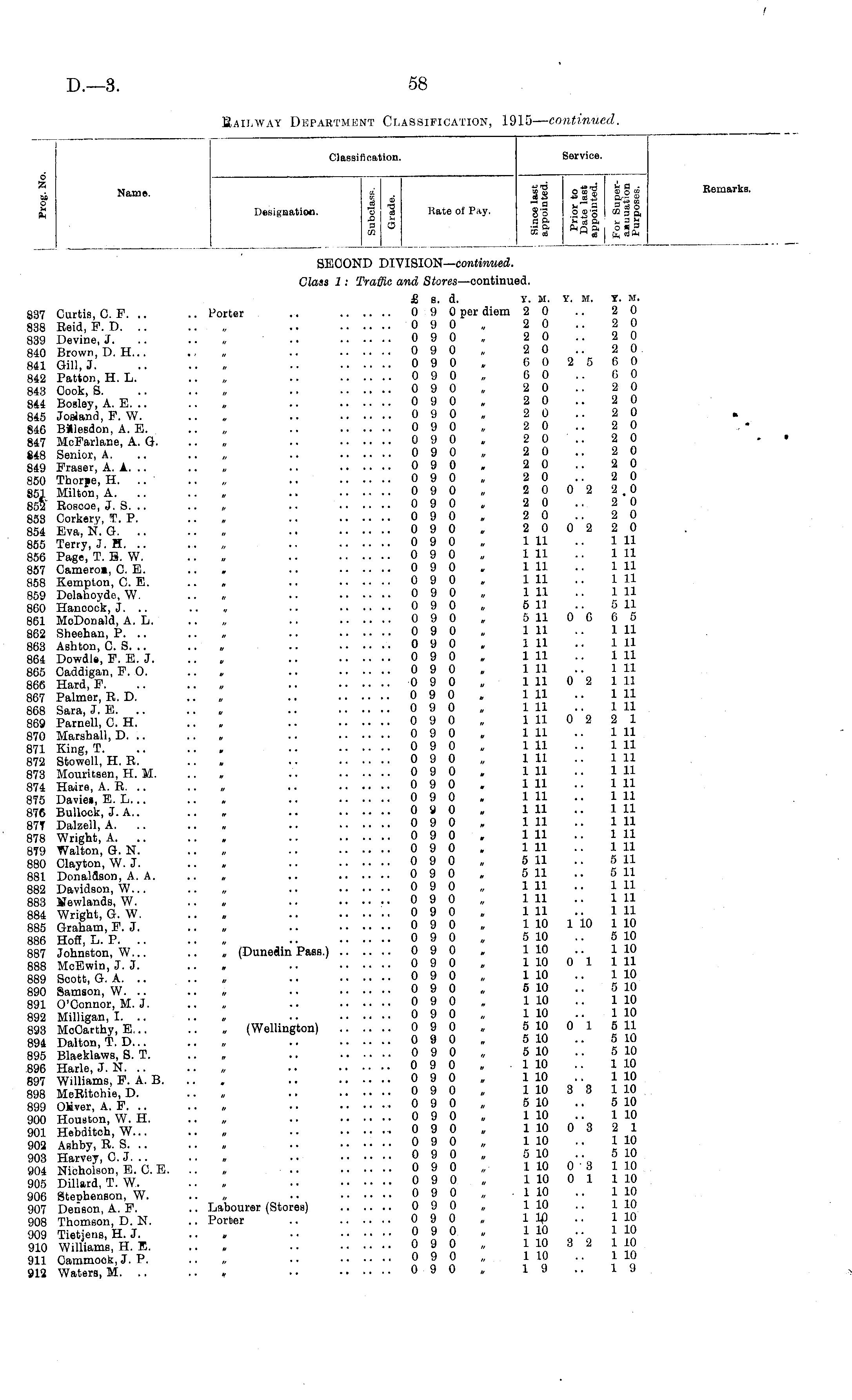 Classification. Service. o | Name. g £ If °1| |ll Remarks. £ Designation. "3 a Bate ol Pay. g-g o «■§ ® 3 a I 5 Is 1 1 I Is SECOND DIVISION —continued. Class 1: Traffic and Stores —continued. £, s. d. Y. M. v. M. T. M. 837 Curtis, C. P. .. .. Porter .. 0 9 0 per diem 2 0 .. 2 0 838 Reid, F. D. .. .. . .. 0 9 0 „ 2 0 .. 2 0 839 Devine, J. .. .. „ • • 090 „ 20 .. 20 840 Brown, D. H... .. . .. 090 . 20 .. 20 841 Gill, J. .. .. . .. 090 „ 602560 842 Patton, H. L. .. „ 090 „ 60 .. 60 843 Cook, S. .. .. , .. 0 9 0 . 2 0 .. 2 0 844 Bosley, A. E. .. .. „ .. 090 „ 20 .. 20 845 Joaiand, P. W. .. .. 0 9 0 20.. 20 » 846 BMesdon, A. E. .. „ .. 090 . 20 .. 20 847 McFarlane, A. G. .. „ 0 9 0 . 2 0 .. 2 0 848 Senior, A. .. .. „ .. 0 9 0 „ 2 0 .. 2 0 849 Fraser, A. A. .. .. „ .. 090 . 20 .. 20 850 Thorpe, H. .. .. „ .. 0 9 0 „ 2 0 .. 2 0 851 Milton, A . 0 9 0 „ 2 0 0 2 2 .0 852 Roseoe, J. S. .. .. „ ■ ■ 0 9 0 , 2 0 .. 2 0 853 Corkery, T. P. .. » .. 090 „ 20 .. 20 854 Eva, N. G. .. .. . .. 0 9 0 , 2 0 0 2 2 0 855 Terry, J. H. .. .. „ .. 0 9 0 „ 111 .. Ill 856 Pago, T. B. W. .. , .. 0 9 0 „ 1 11 .. Ill 857 Camero», O. E. .. , .. 0 9 0 „ 1 11 .. Ill 858 Kempton, C. E. .. „ .. 0 9 0 „ 1 11 .. 1 11 859 Delahoyde, W. .. „ .. 0 9 0 „ 111 .. Ill 860 Hanooek, j. .. .. „ .. 0 9 0 „ 5 11 .. 5 11 861 MoDonald, A. L. .. „ .. 0 9 0 , 5 11 0 6 6 5 862 Sheehan, I?. .. .. , ■ ■ 0 9 0 „ 111 .. Ill 863 Ashton, C. S. .. .. „ .. 090 , 111 .. Ill 864 Dowdle, F. E. J. .. , .. 0 9 0 . Ill .. Ill 865 Caddigan, P. O. .. . 0 9 0 . 1 11 .. 1 11 866 Hard, P . 0 9 0 „ 1 11 0 2 1 11 867 Palmer, R. D. .. , 0 9 0 „ 1 11 .. 1 11 868 Sara, J. E , .. 0 9 0 , 111 .. 1 11 869 Parnell, C. H. .. . 0 9 0 . 1 11 0 2 2 1 870 Marshall, D. .. .. , 0 9 0 . 1 11 .. 1 11 871 King, T. .. .. . .. 0 9 0 „ 1 11 .. Ill 872 Stowell, H. R. ... 0 9 0 „ 1 11 .. 1 11 873 Mouritsen, H. M. .. . 0 9 0 . 1 11 .. 1 11 874 Haire, A. R. .. .. . .. 0 9 0 . Ill .. Ill 875 Daviei, E. L... .. . .. 0 9 0 . Ill .. 1 11 876 Bullock,-J. A.. .. „ .. 0 9 0 . Ill .. Ill 87T Dalzell, A. .. .. , .. 0 9 0 . 1 11 .. 1 11 878 Wright, A. .. .. . .. 0 9 0 . Ill .. Ill 879 Walton, G. N. .. „ 0 9 0 . Ill .. Ill 880 Clayton, W. J. .. « 0 9 0 . 5 11 .. 5 11 881 Donaldson, A. A. .. * .. 0 9 0 * 5 11 .. 5 11 882 Davidson, W... .. „ .. 0 9 0 „ 1 11 .. 1 11 883 SJewlands, W. .. „ ■ ■ 0 9 0 „ 1 11 .. 1 11 884 Wright, G. W. .. „ 0 9 0 , 111 .. Ill 885 Graham, F. J. .. „ 0 9 0 „ 1 10 1 10 1 10 886 Hofl, L. P , 0 9 0 , 5 10 .. 5 10 887 Johnston, W... .. , (Dunedin Pass.) 0 9 0 . 1 10 .. 1 10 888 MoEwin, J. J. .. . •• 0 9 0 „ 1 10 0 1 1 11 889 Scott, G. A. .. .. „ .. 0 9 0 , 1 10 .. 1 10 890 Samson, W 0 9 0 „ 5 10 .. 5 10 891 O'Connor, M. J. .. „ .. 0 9 0 , 1 10 .. 1 10 892 Milligan, I. .. .. , .. 0 9 0 „ 1 10 1 10 893 MoCarthy, E... .. „ (Wellington) 090 „ 5 10 01 5 11 894 Dalton, T. D . 0 9 0 . 5 10 .. 5 10 895 Blaeklaws, S. T. .. „ .. 0 9 0 „ 5 10 .. 5 10 £96 Harle, J. N. .. .. „ .. 0 9 0 . 1 10 .. 1 10 897 Williams, F. A. B. .. , .. 0 9 0 „ 1 10 .. 1 10 898 MoRitchie, D. .. . 0 9 0 » H2 8 3 899 Oliver, A. F. .. .. » • • 0 9 0 „ 5 10 .. 5 10 900 Houston, W. H. .. „ .. 0 9 0 „ 1 10 .. 1 10 901 Hebditch, W , 0 9 0 , 1 10 0 3 2 1 902 Ashby, R. S. .. .. » ■ • Son " r i n " r In 90S HarveT C J .. .. » • • 0 9 0 „ 5 10 .. 5 10 904 Nicholson,' E. C. E. .. „ 0 9 0 „ 1 10 0 3 1 10 905 Dillard, T. W. .. . 0 9 ° " 01 906 SteDhenson, W. .. ,, • • 0 9 0 „ 1 10 .. 1 10 907 Denson, A. F. .. Labourer (Stores) 0 9 0 „ 1 .10 .. 1 10 908 Thomson, D. N. .. Porter .. 090 „ lip .. 110 909 Tietjens, H. J. .. . 0 9 0 „ •• 910 Williams, H. E. .. . 0 9 0 , 1 10 3 2 1 10 911 Cammock, J. P. .. „ •. 0 9 0 „ 1 10 .. 1 10 912 Waters, M. .. .. . .. 090 . 19 .. 19