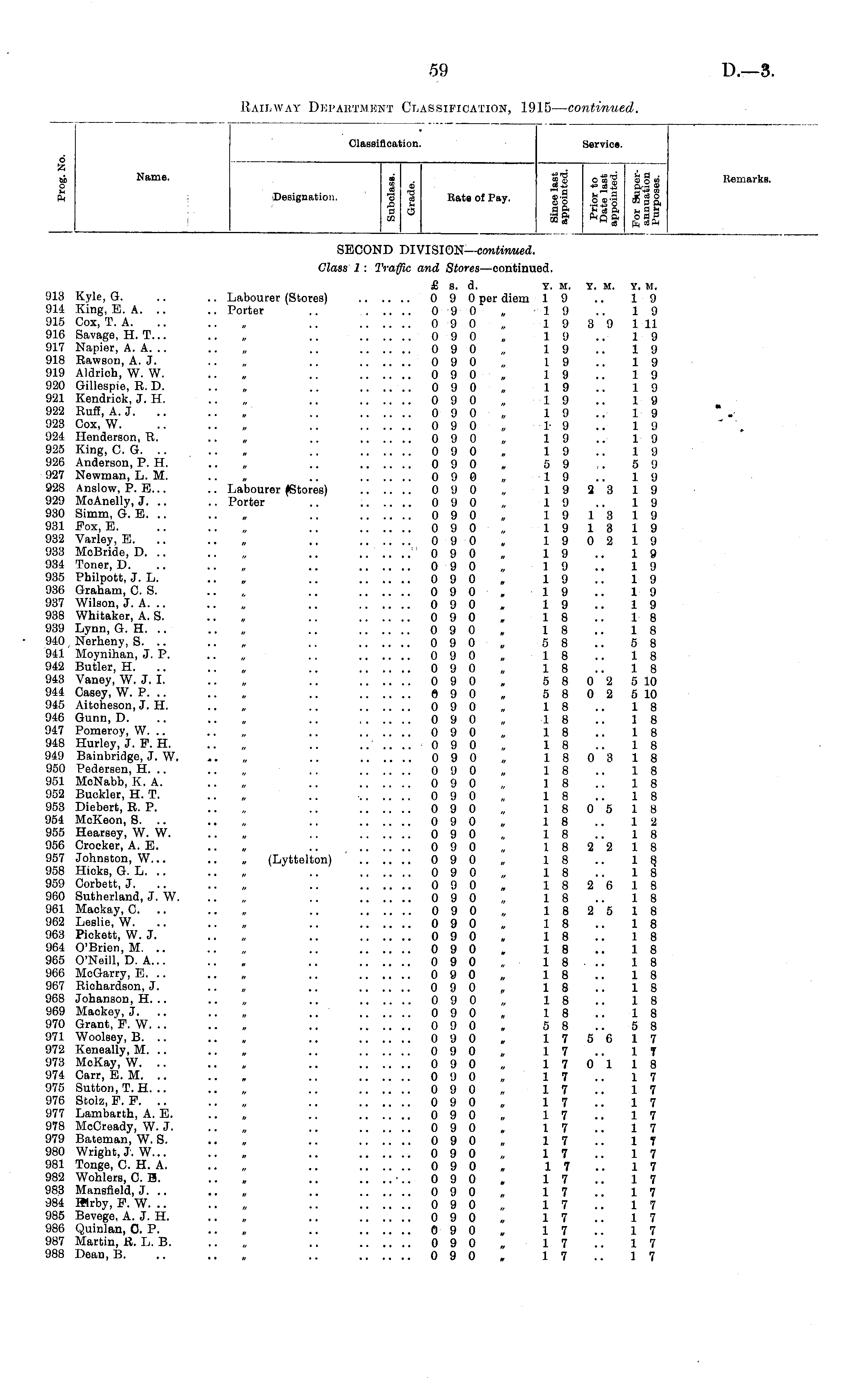 Classification. Service. o • tib Name. E . Remarks. O <D -M ■♦=> cfl 4S Pc-H ® £ iDesignation. | 1 Rate of Pay. ®| g®.§ rg| g, 20 .9 & ft 2 is ® °g£ SECOND DIVISION—continued. Class 1 : Traffic and Stores—continued. £ s. d. y. m. y, m. y. u. 913 Kyle, G. .. .. Labourer (Stores) 0 9 0 per diem 19 .. 19 914 King, E. A. .. .. Porter .. 0 9 0 „ 19 .. 19 915 Cox, T. A. .. .. , .. 0 9 0 „ 1 9 3 9 1 11 916 Savage, H. T... .. „ .. 0 9 0 „ 19 .. 19 917 Napier, A. A. .. .. „ .. 0 9 0 „ 19 .. 19 918 Rawson, A.J. .. „ .. 0 9 0 „ 19 .. 19 919 Aldrich, W. W. .. „ .. 0 9 0 „ 19 .. 19 920 Gillespie, It. D. .. „ .. 090 „ 19 .. 19 921 Kendriok, J. H. .. „ .. 0 9 0 „ 19 .. 19 922 Ruff, A. J. .. .. „ .. 0 9 0 „ 19 .. 19 923 Cox, W. .. .. „ .. 0 9 0 „ 1-9 .. 19 924 Henderson, R. .. „ .. 0 9 0 „ 19 .. 19 923 King, C. G. .. .. , .. 0 9 0 . 1 9 .. 1 9 926 Anderson, P. H. .. „ .. 090 „ 59 59 927 Newman, L. M. .. „ .. 0 9 0 „ 19 .. 19 928 Anslow, P. E... .. Labourer (Stores) 090 „ 19 23 19 929 McAnelly, J. .. .. Porter .. 0 9 0 „ 19 .. 19 930 Simm, G. E. .. .. „ .. 0 9 0 „ 19 13 19 931 Fox, E. .. .. „ .. 0 9 0 „ 19 18 19 932 Varley, E. .. . .. 0 9 0 1 9 0 2 1 9 933 MoBride, D. .. .. „ .. 090 „ 19 .. 19 934 Toner, D. .. .. „ .. 0 9 0 „ 19 .. 19 935 Philpott, J. L. .. „ .. 0 9 0 „ 19 .. 19 936 Graham, C. S. .. „ .. 0 9 0 „ 19 .. 19 937 Wilson, J. A. .. .. „ .. 0 9 0 „ 19 .. 19 938 Whitaker, A. S. .. „ .. 0 9 0 „ 18 .. 18 939 Lynn, G. H. .. .. „ .. 0 9 0 „ 18 .. 18 940, Nerheny, S. .. .. „ .. 0 9 0 „ 5 8 .. 5 8 941 Moynihan, J. P. .. „ .. 0 9 0 „ 18 .. 18 942 Butler, H. .. .. „ .. 0 9 0 „ 18 .. 18 943 Vaney, W. J. I. .. „ .. 0 9 0 » 5 8 0 2 5 10 944 Casey, W. P. .. .. „ .. 0 9 0 „ 5 8 0 2 5 10 945 Aitoheson, J. H. .. „ .. 090 „ 18 .. 18 946 Gunn, D. .. .. „ .. 0 9 0 „ 18 .. 18 947 Pomeroy, W. .. .. „ .. 0 9 0 „ 18 .. 18 948 Hurley, J. F. H. .. „ .. 0 9 0 „ 18 .. 18 949 Bainbridgo, J. W. -. „ .. 0 9 0 „ 1 8 0 3 1 8 950 Pedersen, H. .. .. „ .. 0 9 0 „ 18 .. 18 951 McNabb, K. A. .. „ .. 0 9 0 „ ] 8 .. 18 952 Buckler, H. T. .. „ .. 0 9 0 „ 18 .. 18 953 Diebert, R. P. .. „ .. 0 9 0 „ 1 8 0 5 1 8 954 McKeon, 8. .. .. „ .. 0 9 0 „ 18 .. 12 955 Hearsey, W. W. .. „ .. 0 9 0 „ 18 .. 18 956 Crocker, A. E. .. „ .. 0 9 0 „ 1 8 2 2 1 8 957 Johnston, W... .. „ (Lyttelton) 090 „ 18 .. 1 § 958 Hicks, G. L. .. .. , .. 0 9 0 „ 18 .. 18 959 Corbett, J. .. „ .. 090 „ 182618 960 Sutherland, J. W. .. „ .. 0 9 0 „ 18 .. 18 961 Maokay, C. .. .. „ .. 0 9 0 „ 1 8 2 5 1 8 962 Leslie, W. .. .. „ .. 090 „ 18 .. 18 963 Pickett, W. J. .. „ .. 090 „ 18 .. 18 964 O'Brien, M. .. .. „ .. 090 „ 18 .. 18 965 O'Neill, D. A... .. „ .. 090 „ 18 .. 18 966 McGarry, E. .. .. „ .. 0 9 0 „ 18 .. 18 967 Richardson, J. .. „ .. 090 „ 18 .. 18 968 Johanson, H. .. .. „ .. 0 9 0 „ 18 .. 18 969 Mackey, J. .. .. „ ., 0 9 0 „ 18 .. 18 970 Grant, F. W. .. .. „ .. ...... 0 9 0 „ 5 8 .. 5 8 971 Woolsey, B. .. .. „ .. 0 9 0 „ 175617 972 Keneally, M. .. .. „ .. 090 „ 17 .. IT 973 MoKay, W. .. .. „ .. 090 „ 170118 974 Carr, E. M. .. .. „ .. 0 9 0 „ 17 .. 17 975 Sutton, T. H. .. .. „ .. 090 „ 17 .. 17 976 Stolz, F. F. .. .. „ .. 0 9 0 „ 17 .. 17 977 Lambarth, A. E. .. „ .. 0 9 0 „ 17 .. 17 978 McCready, W. J. .. „ .. 0 9 0 „ 17 .. 17 979 Bateman, W. S. .. „ .. 090 „ 17 .. 17 980 Wright, J. W... .. „ .. 0 9 0 „ 17 .. 17 981 Tonge, C. H. A. .. „ .. 0 9 0 „ 17 .. 17 982 Wohlers, C. H. .. „ .. ...... 090 „ 17 .. 17 983 Mansfield, J. .. .. „ .. 0 9 0 „ 17 .. 17 984 JSrby, F. W. .. .. „ .. 0 9 0 „ 17 .. 17 985 Bevege, A. J. H. .. „ .. 0 9 0 „ 17 .. 17 986 Quinlan, C. P. .. „ .. 0 9 0 „ 17 .. 17 987 Martin, R. L. B. .. „ .. 0 9 0 „ 17 .. 17 988 Dean, B. .. .. „ .. 090 „ 17 .. 17