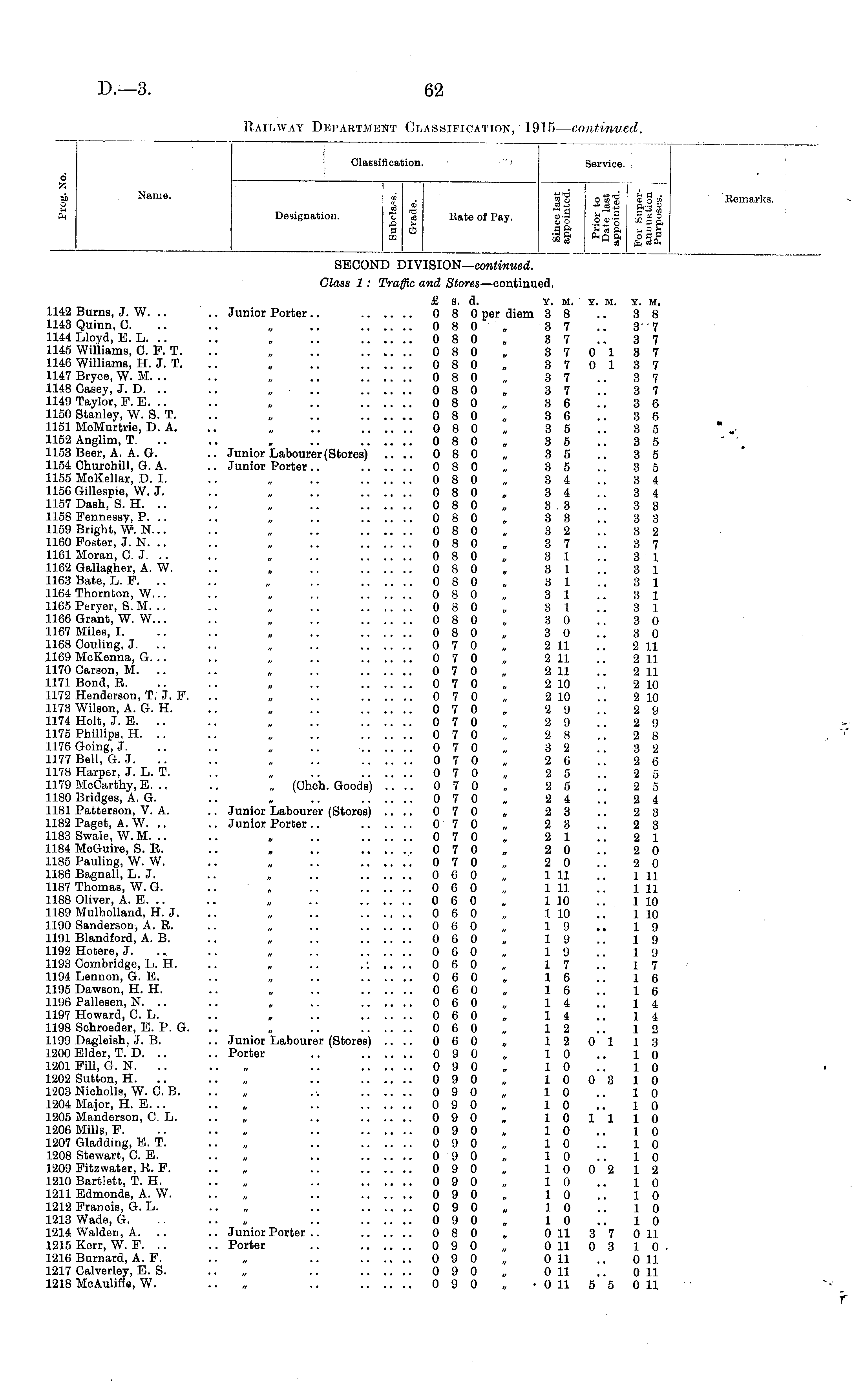 Classification. "» Service. 6 55 ; ~ ; w, Name. « "'S Remarks. 51 Designation. t g Rate of Pay. ©•§ g®.2 s 5 .2n >- 2 S m gSo® SECOND DIVISION—continued. Class 1 : Traffic and Stores—continued. £ s. d. Y. M. Y. M. Y. M. 1142 Burns, J. W. .. .. Junior Porter.. 0 8 0 per diem 3 8 .. 3 8 1143 Quinn, 0. .. .. „ .. 0 8 0,, 3 7 .. 3 7 1144 Lloyd, E. L. .. .. „ .. 080 „ 37 37 1145 Williams, C. P. T. .. „ .. 080 „ 3701 37 1146 Williams, H. J. T. .. „ .. 0 8 0 „ 3 7 0 1 3 7 1147 Bryce, W. M. .. .. „ .. 080 „ 37 .. 37 1148 Casey, J. D. .. .. „ .. 0 8 0 „ 3 7 .. 3 7 1149 Taylor, P. E. .. .. „ .. 0 8 0 „ 3 6 3 6 1150 Stanley, W. S. T. .. „ .. ...... 0 8 0 „ 3 6 .. 3 6 1151 McMurtrie, D. A. .. „ .. 0 8 0 „ 3 5 .. 3 5 1152 Anglim, T. .. „ .. 080 „ 35 .. 35 1153 Beer, A. A. G. .. Junior Labourer (Stores) .... 080 „ 35 .. 35 1154 Churohill, O. A. .. Junior Porter.. 0 8 0 „ 3 5 .. 3 5 1155 McKellar, D. I. .. „ .. 0 8 0 „ 3 4 .. 3 4 1156 Gillespie, W. J. .. „ .. 0 8 0 „ 3 4 .. 3 4 1157 Dash, S. H. .. .. „ .. 0 8 0 „ 3 3 .. 3 3 1158 Pennessy, P. .. .. „ .. 0 8 0 „ 3 3 .. 3 3 1159 Bright, W. N... .. „ .. 080 „ 32 .. 32 1160 Poster, J.N... .. „ .. 0 8 0 „ 3 7 .. 3 7 1161 Moran, C. J. .. .. „ .. 0 8 0 „ 3 1 .. 3 1 1162 Gallagher, A. W. .. „ .. 080 „ 31 .. 31 1163 Bate, L. P. .. .. „ .. 0 8 0 „ 3 1 .. 3 1 1164 Thornton, W... .. „ .. ...... 080 „ 31 .. 31 1165 Peryer, S. M. .. .. „ .. 0 8 0 „ 3 .1 .. 3 1 1166 Grant, W. W... .. „ .. 080 „ 30 .. 30 1167 Miles, I. .. .. „ .. 0 8 0 „ 3 0 .. 3 0 1168 Couling, J. .. „ .. 0 7 0 „ 2 11 .. 2 11 .1169 McKenna, G. .. .. „ .. 0 7 0 „ 2 11 .. 2 11 1170 Carson, M. .. .. „ .. 0 7 0 „ 2 11 .. 2 11 1171 Bond, R. .. .. „ .. 0 7 0 „ 2 10 .. 2 10 1172 Hendorson, T. J. P. .. „ .. 0 7 0 „ 2 10 .. 2 10 1173 Wilson, A. G. H. .. „ .. 0 7 0 „ 2 9 .. 2 9 1174 Holt, J. E. .. .. „ .. 0 7 0 „ 2 9 .. 2 9 1175 Phillips, H. .. .. „ .. 070 „ 28 .. 28 1176 Going, J. .. .. , .. 0 7 0 „ 3 2 .. 3 2 1177 Bell, G. J. .. „ .. 0 7 0 „ 2 6 .. 2 6 1178 Harper, J. L. T. .. „ .. 0 7 0 „ 2 5 .. 2 5 1179 McCarthy, E. ., .. „ (Choh. Goods) .... 0 7 0 „ 2 5 .. 2 5 1180 Bridges, A. G. .. „ .. 070 „ 24 .. 24 1181 Patterson, V. A. .. Junior Labourer (Stores) .... 070 „ 23 .. 23 1182 Paget, A. W. .. .. Junior Porter.. 0 70 „ 23 .. 23 1183 Swale, W. M. .. .. „ .. 0 7 0 „ 2 1 .. 2 1 1184 McGuire, S. R. .. „ .. 070 „ 20 .. 20 1185 Pauling, W. W. .. „ .. 0 7 0 „ 2 0 .. 2 0 1186 Bagnall, L. J. .. „ .. 0 6 0 „ 1 11 .. Ill 1187 Thomas, W. G. .. „ .. 0 6 0 „ 1 11 .. 1 11 1188 Oliver, A. E. .. .. „ .. 0 6 0 „ 1 10 .. 1 10 1189 Mulholland, H. J. .. „ ... 0 6 0 „ 1 10 .. 1 10 1190 Sanderson, A. R. .. „ .. 0 6 0 „ 19 .. 19 1191 Blandford, A. B. .. „ .. 0 6 0 „ 19 .. 19 1192 Hotere, J. .. .. „ .. 0 6 0 „ 19 .. 19 1193 Combridge, L. H. .. „ .. .:.... 0 6 0 „ 17 .. 17 1194 Lennon, G. E. .. „ .. 0 6 0 „ 16 .. 16 1195 Dawson, H. H. .. „ .. 060 „ 16 .. 16 1196 Pallesen, N. .. .. „ .. 0 6 0 „ 14 .. 14 1197 Howard, C. L. .. „ .. 0 6 0 „ 14 .. 14 1198 Sohroeder, E. P. G. „ .. 0 6 0 „ 12 .. 12 1199 Dagleish, J. B. .. Junior Labourer (Stores) .... 060 „ 12 01 13 1200 Elder, T. D. .. .. Porter .. 090 „ 10 .. 10 1201 Pill, G. N. .. „ .. 0 9 0,, 1 0 .. 1 0 1202 Sutton, H. .. „ .. 0 9 0 „ 1 0 0 3 1 0 1203 Nicholls, W. C. B. .. „ . . 0 9 0 „ 10 .. 10 1204 Major, H. E. .. .. „ .. 0 9 0 „ 10 .. 10 1205 Manderson, C. L. .. „ .. 090 „ 10 1110 1206 Mills, P. .. .. „ .. 0 9 0 , 1 0 .. 1 0 1207 Gladding, E. T. .. „ .. 0 9 0 „ 10 .. 10 1208 Stewart, C. E. .. „ .. 0 9 0 „ 10 .. 10 1209 Fitzwater, R. F. .. „ .. 090 „ 1002 12 1210 Bartlett, T. H. .. „ .. 0 9 0 „ 10 .. 10 1211 Edmonds, A. W. .. „ .. 0 9 0 „ 10 .. 10 1212 Francis, G. L. .. „ .. 0 9 0 „ 10 .. 10 1213 Wade, G. .. „ .. 0 9 0 „ 10 .. 10 1214 Walden, A. .. .. Junior Porter .. 0 8 0 „ 0 11 3 7 0 11 1215 Kerr, W. F. .. .. Porter .. 090 „ 0 11 03 101216 Burnard, A. F. .. „ .. 0 9 0 „ 0 11 .. Oil 1217 Calverley, E. S. .. „ .. 0 9 0 „ 0 11 .. 0 11 1218 McAuliffe, W. .. „ .. 0 9 0 „ • 0 11 5 5 0 11