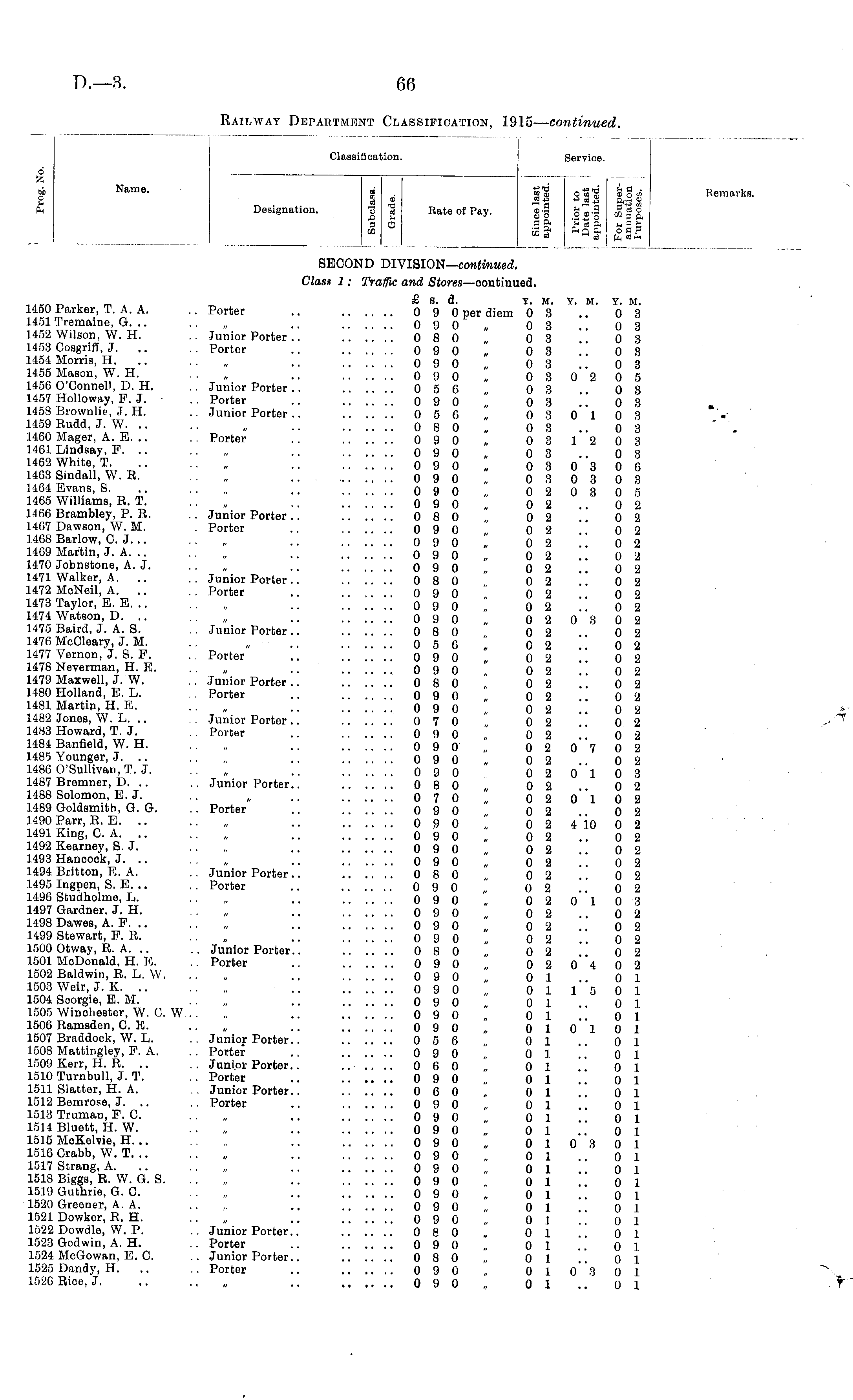 Classification. Service. o _ _ Name. u . <3 § *> Remarks. g JJj ® ft—" ® fi Designation. "3 g Rate of Pay. «•§ g®.3 »|| PC .3 § £ £• >- 2 S : it fi off g§£ SECOND DIVISION—continued. Class 1: Traffic and Stores—continued. . m . . £ B. a. Y. M. Y. M. V. M. 1450 Parker, T. A. A. .. Porter .. 0 9 0 per diem 0 3 .. 0 3 1451 Tremaine, G. .. .. „ .. 0 9 0 „ 0 3 0 3 1452 Wilson, W. H. .. Junior Porter .. 080 " 0 3 .. 03 1453 Cosgriff, J. .. .. Porter .. 0 9 0 0 3 .. 0 3 1454 Morris, H. .. „ .. 0 9 0 0 3 OS 1455 Mason, W. H. .. „ .. !! !! " 0 9 0 0 3 o'*2 0 5 1456 O'Oonnel), D. H. .. Junior Porter .. 056 „ 03 03 1457 Holloway, P. J. .. Porter .. 0 9 0 0 3 ! 0 3 1458 Brownlie, J. H. .. Junior Porter .. 0 5 6 " 0 3 0 1 0 3 1469 Rudd, J. W 0 8 0,; 0 3 .. 0 3 1460 Mager, A. E. .. . . Porter .. 090 , 03 12 03 1461 Lindsay, F. .. „ .. 0 9 0 „ 0 3 .. 0 3 1462 White, T. .. „ .. 0 9 0 . 0 3 0 3 0 6 1463 Sindall, W. R. . . „ .. 0 9 0 „ 0 3 0 3 0 3 1464 Evans, S. .. „ 0 9 0 0 9 0 3 0*; 1465 Williams, R. T. .. „ .. ......0 9 0 I 02 .. 02 1466 Brambley, P. R. .. Junior Porter .. 080 „ 02 .. 02 1467 Dawson, W. M. . Porter .. 090 02 " 02 1468 Barlow, C. J. .. .. „ .. 0 9 0 0 2 !! 0 2 1469 Martin, J. A. .. .. „ .. 0 9 0 , 0 2 .. 0 2 1470 Johnstone, A. J. .. „ .. 0 9 0 0 2 !! 0 2 1471 Walker, A. .. .. Junior Porter.. 080 „ 02 .. 02 1472 McNeil, A. .. Porter .. 090 02 02 1473 Taylor, E. E. .. .. ,/ .. 0 9 0 0 2 !! 0 2 1474 Watson, D. .. .. „ .. 0 9 0 „ 0 2 0 3 0 2 1475 Baird, J. A. S. . Junior Porter.. 080 02 .. 02 1476 McCleary, J. M. .. „ ., 0 5 6 0 2 '' 0 2 1477 Vernon, J. S. F. .. Porter .. 090 1 02 .. 02 1478 Neverman, H. E. .. „ .. 090 02 !! 02 1479 Maxwell, J. W. .. Junior Porter .. 080 „ 02 .. 02 1480 Holland, E. L. . . Porter .. 090 02 02 1481 Martin, H. E. „ .. 0 9 0 „ 0 2 !.' 0 2 1482 Jones, W. L. .. . . Junior Porter.. 070 „ 02 .. 02 1483 Howard, T. J. Porter .. 090 02 02 1484 Banfield, W. H. .. „ 0 9 0 1 0 2 o"7 0 2 1485 Younger, J. .. .. „ ., 0 9 0 . 0 2 .. 0 2 1486 O'Sullivan, T. J, „ .. 090 020103 1487 Bremner, D. .. .. Junior Porter.. 080 „ 02 .. 02 1488 Solomon, E. J. „ ,, 0 7 0 " 0 2 o"l 0 2 1489 Goldsmith, G. G. Porter 090 02 02 1490 Parr, R. E. .. .. „ .. 0 9 0 0 2 4 10 0 2 1491 King, 0. A „ 0 9 0 . 0 2 .. 0 2 1492 Kearney, S. J. .. „ .. 0 9 0 „ 0 2 .. 0 2 1493 Hanoock, J. .. .. „ ., 0 9 0 0 2 0 2 1494 Britton, E. A. Junior Porter.. 080 , 02 02 1495 Ingpen, S. E. .. . . Porter .. 0 9 0 0 2 .'0 2 1496 Studholme, L. .. „ .. 0 9 0 „ 0 2 0 1 0 3 1497 Gardner. J. H. .. „ .. 0 9 0 0 2 0 2 1498 Dawes, A. F. .. .. „ .. . '. '. '. '. '.0 9 0 0 2 !0 2 1499 Stewart, F. R. . . „ .. 0 9 0 „ 0 2 .. 0 2 1500 Otway, R. A. .. .. Junior Porter.. 0 8 0 „ 0 2 .. 0 2 1501 MoDonald, H. E. .. Porter .. 090 „ 02 04 02 1502 Baldwin, R. L. W. .. „ 0 9 0 O 1 n i 1503 Weir, J.'K I . . !! !! !! 0 9 0 I 0 1 l" 5 0 1 1504 Soorgie, E. M. .. „ .. 0 9 0 „ 0 1 .. 0 1 1505 Winchester, W. O. W... „ .. 0 9 0 „ 0 1 .. 0 1 1506 Ramsden, C. E. .. „ 0 9 0 0 10 10 1 1507 Braddook, W. L. .. Junior Porter.. 0 5 6 " 0 1 .. 0 1 1508 Mattingley, F. A. . . Porter .. 0 9 0 0 1 '. 0 1 1509 Kerr, H. R. .. .. Junior Porter.. 060 „ 01 .. 01 1510 Turnbull, J. T. . . Porter .. 0 9 0 „ 0 1 1! 0 1 1511 Slatter, H. A. . . Junior Porter.. 060 „ 01 .. 01 1512 Bemrose, J. .. .. Porter .. 0 9 0 „ 0 1 . . 0 1 1513 Truman, F. C. .. „ .. . 0 9 0 0 1 " 0 1 1514 Bluett, H. W. .. „ 0 9 0 I 0 1 0 1 1515 McKolvie, H. .. .. „ .. 0 9 0 „ 0 1 0 3 0 1 1516 Crabb, W. T. .. „ .. 0 9 0 „ 0 1 .. 0 1 1517 Strang, A. .. „ .. 0 9 0 „ 0 1 .. 0 1 1518 Biggs, R. W. G. S. .. „ .. 0 9 0 „ 0 1 .. 0 1 1519 Guthrie, G. O. „ .. 0 9 0 „ 0 1 .. 0 1 1520 Greener, A. A. .. „ .. 0 9 0 „ 0 1 .. 0 1 1521 Dowker, R. H. .. „ .. 0 9 0 „ 0 1 0 1 1522 Dowdle, W. P. .. Junior Porter.. 080 „ 01 .. 01 1523 Godwin, A. H. .. Porter .. 0 9 0 „ 0 1 .. 0 1 1524 McGowan, E. C. .. Junior Porter.. 0 8 0 „ 0 1 .. 0 1 1525 Dandy, H. .. .. Porter .. 0 9 0 „ 0 1 0 3 0 1 1526 Rice, J. .. ., „ .. 0 9 0 „ 0 1 .. 0 1