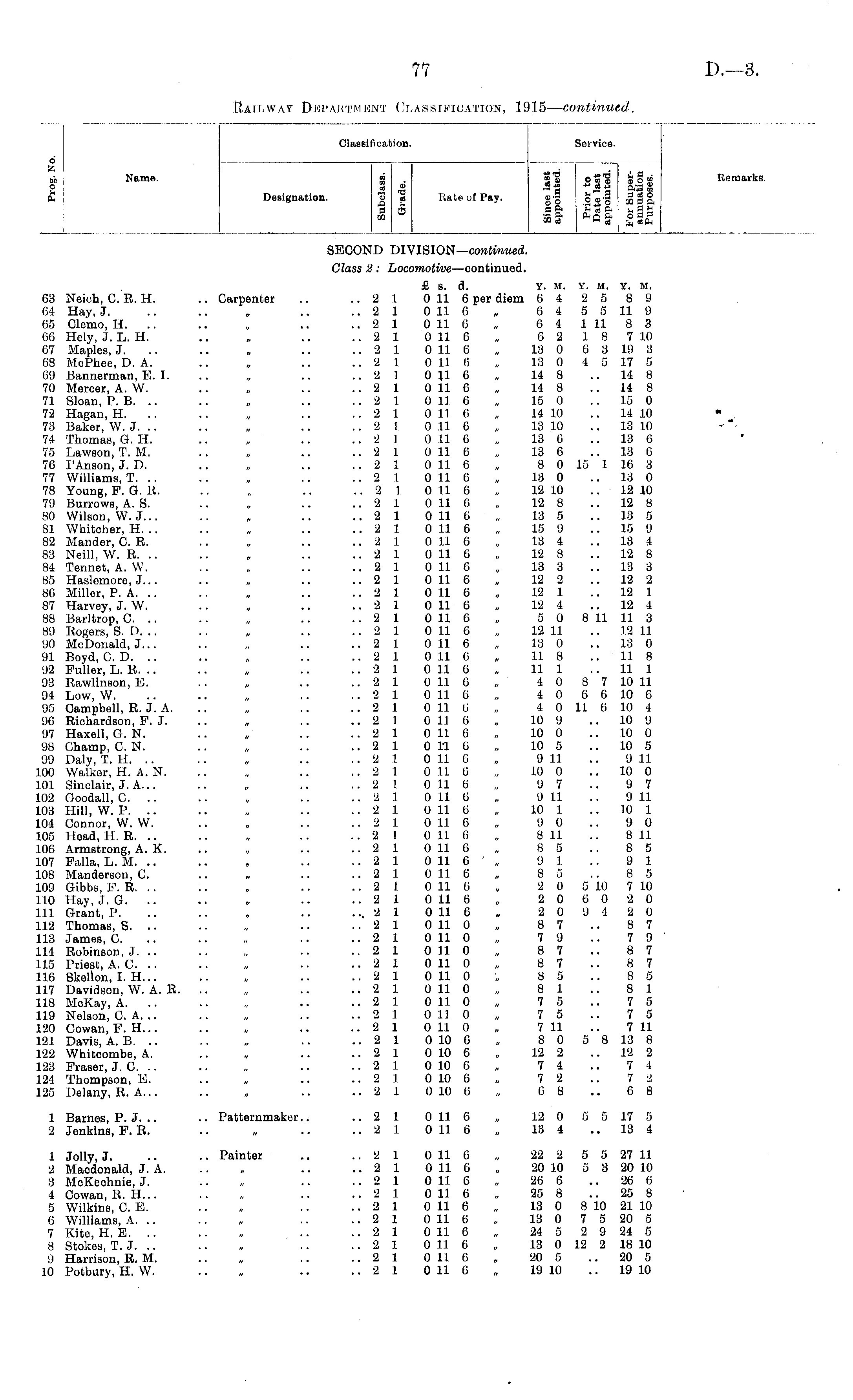 Classification. Service. 0 - . ~ oc Namct. S • Remarks. £ 3 ® ~a & Designation. o a Rate of Pay. g'g .2 ®'o t» s a rj rh pft COcd^ciSfqrtPH SECOND DIVISION—continued. Glass 2: Locomotive—continued. £ s. d. Y. M. Y. M. Y. M. 63 Neich, 0. R. H. .. Carpenter .. ..'21 0 11 6 per diem 6 4 2 5 8 9 64 Hay, J. .. .. „ .. ..21 0116 „ G 4 5 5 11 9 65 Clemo, H. .. .. „ .. ..2 1 0 11 6 , 6 4 1 11 8 3 66 Hely, J. L. H. .. „ .. ..2 1 0 11 6 „ 6 2 1 8 7 10 67 Maples, J. .. .. „ .. ..21 0 11 6 „ 1.3 0 6 3 19 3 68 McPhee, D. A. .. . .. ..21 0 11 6 „ 13 0 4 5 17 5 69 Bannerman, E. I. .. „ .. ..2 1 0 11 6 „ 14 8 14 8 70 Mercer, A. W. .. „ .. ..2 1 0 11 6 „ 14 8 .. 14 8 71 Sloan, P. B. .. .. „ .. ..21 0 11 6 „ 15 0 .. 15 0 72 Hagan, H. .. .. „ .. ..2 1 0 11 6 „ 14 10 ..14 10 73 Baker, W. J. .. .. „ .. ..21 0 11 6 „ 13 10 .. 13 10 74 Thomas, G. H. .. „ .. ..21 0 11 6 „ 13 6 .. 13 6 75 Lawson, T. M. .. „ .. ..21 0116 „ 13 6 .. 13 6 76 I'Anson, J. D. .. „ .. ..21 0116 „ 8 0 15 1 16 3 77 Williams, T. .. .. „ .. ..21 0 11 6 „ 13 0 13 0 78 Young, F. G. R. .. „ .. ..21 0116 „ 12 10 .. 12 10 79 Burrows, A. S. .. „ .. ..21 0116 „ 12 8 12 8 80 Wilson, W. J... .. „ .. ..2 1 0 11 6 „ 13 5 .. 13 5 81 Whitcher, H. .. .. „ .. ..21 0 11 6 „ 15 9 .. 15 9 82 Mander, C. R. .. „ .. ..21 0 11 6 „ 13 4 .. 13 4 83 Neill, W. R. .. .. „ .. ..2 1 0 11 6 „ 12 8 12 8 84 Tennet, A. W. .. „ .. ..21 0 11 6 „ 13 3 .. 13 3 85 Haslemore, J... .. „ .. ..2 1 0 11 6 „ 12 2 .. 12 2 86 Miller, P. A. .. .. „ .. ..21 0 11 6 „ 12 1 .. 12 1 87 Harvey, J. W. .. „ .. ..21 0 11 6 „ 12 4 .. 12 4 88 Barltrop, C. .. .. „ .. ..21 0 11 6 „ 5 0 8 11 11 3 89 Rogers, S. D. .. .. „ .. ..21 0116 „ 12 11 .. 12 11 90 McDonald, J... .. „ .. ..2 1 0 11 6 „ 13 0 13 0 91 Boyd, 0. D. .. .. „ .. ..2 1 0 11 6 „ 11 8 .. 11 8 92 Puller, L. R. .. .. „ .. ..21 0 11 6 „ 11 1 .. 11 1 93 Rawlinson, E. .. „ .. ..2 1 0 11 6 „ 4 0 8 7 10 11 94 Low, W. .. .. „ .. ..21 0116 „ 4 0 6 6 10 6 95 Campbell, R. J. A. .. „ .. ..2 1 0 11 6 „ 4 0 11 6 10 4 96 Richardson, P. J. .. „ .. ..2 1 0 11 6 „ 10 9 10 9 97 Haxell, G.N. .. „ .. ..21 0116 „ 10 0 .. 10 0 98 Champ, C.N. .. „ .. ..21 0 11 6 „ 10 5 .. 10 5 99 Daly, T. H. .. .. „ .. ..21 0 11 6 „ 911 .. 911 100 Walker, H. A. N. .. „ .. ..2 1 0 11 6 „ 10 0 .. 10 0 101 Sinclair, J. A... .. „ .. ..2 1 0 11 6 „ 9 7 .. 9 7 102 Goodall, C. .. .. „ .. ..21 0 11 6 „ 9 11 .. 9 11 103 Hill, W. P. .. .. „ .. ..2 1 0 11 6 „ 10 1 .. 10 1 104 Connor, W. W. .. „ .. ..21 0 11 6 „ 90 .. 90 105 Head, H. R. .. .. „ .. ..21 0 11 6 „ 811 .. 8 11 106 Armstrong, A. K. .. „ .. ..21 0 11 6 „ 85 .. 85 107 Falla, L. M. .. .. „ .. ..2 1 0 11 6 ' „ 9 1 .. 9 1 108 Manderson, C. .. „ .. ..2 1 0 11 6 „ 8 5 .. 8 5 109 Gibbs, P. R. .. .. „ .. ..21 0 11 6 „ 2 0 5 10 7 10 110 Hay, J. G. .. .. ,, .. ..2 1 0 11 6 „ 2 0 6 0 2 0 111 Grant, P. .. .. „ .. ... 2 1 0 11 6 „ 2 0 9 4 2 0 112 Thomas, S. .. .. „ .. ..21 0110 „ 87 .. 87 113 James, C. .. .. ,, .. ..2 1 0 11 0 „ 7 9 .. 7 9' 114 Robinson, J. .. .. „ .. ..21 0110 „ 87 .. 87 115 Priest, A. C. .. .. „ .. ..21 0110 „ 87 .. 87 116 Skellon, I. H... .. „ .. ..2 1 0 11 0 „ 8 5 .. 8 5 117 Davidson, W. A. R .. .. 2 1 0 11 0 „ 8 1 .. 8 1 118 MoKay, A. .. .. „ .. ..21 0110 „ 75 .. 75 119 Nelson, C. A. .. .. „ .. ..2 1 0 11 0 „ 7 5 .. 7 5 120 Cowan, F. H... .. . .. ..2 1 0 11 0 „ 7 11 .. 7 11 121 Davis, A. B „ .. ..2 1 0 10 6 „ 8 0 5 8 13 8 122 Whitcombe, A. .. „ .. ..21 0 10 6 „ 12 2 12 2 123 Praser, J. C. .. .. . .. ..2 1 0 10 6 „ 7 4 .. 7 4 124 Thompson, E. .. „ .. ..2 1 0 10 6 „ 72 .. 72 125 Delany, R. A... .. „ .. ..2 1 0 10 6 „ 6 8 .. 6 8 1 Barnes, P. J. .. .. Patternmaker.. ..2 1 0 11 6 „ 12 0 5 5 17 5 2 JonkinB, F. R. .. „ .. ..2 1 0 11 6 „ 13 4 13 4 1 Jolly, J. .. .. Painter .. ..2 1 0 11 6 „ 22 2 5 5 27 11 2 Maodonald, J. A. .. „ .. ..21 0116 „ 20 10 5 3 20 10 3 McKechnie, J. .. „ .. .. 2 1 0 11 6 26 6 .. 26 6 4 Cowan, R. H... .. „ .. ..2 1 0 11 6 „ 25 8 25 8 5 Wilkins, C. E. .. „ .. ..21 0 11 6 „ 13 0 8 10 21 10 6 Williams, A. .. .. „ .. ..21 0 11 6 „ 13 0 7 5 20 5 7 Kite, H. E .. ..2 1 0 11 6 „ 24 5 2 9 24 5 8 Stokes, T. J „ ■ ■ ..21 0 11 6 „ 13 0 12 2 18 10 9 Harrison, R. M. .. „ .. ..21 0 11 6 „ 20 5 .. 20 5 10 Potbury, H. W. .. „ .. ..21 0 11 6 „ 19 10 .. 19 10