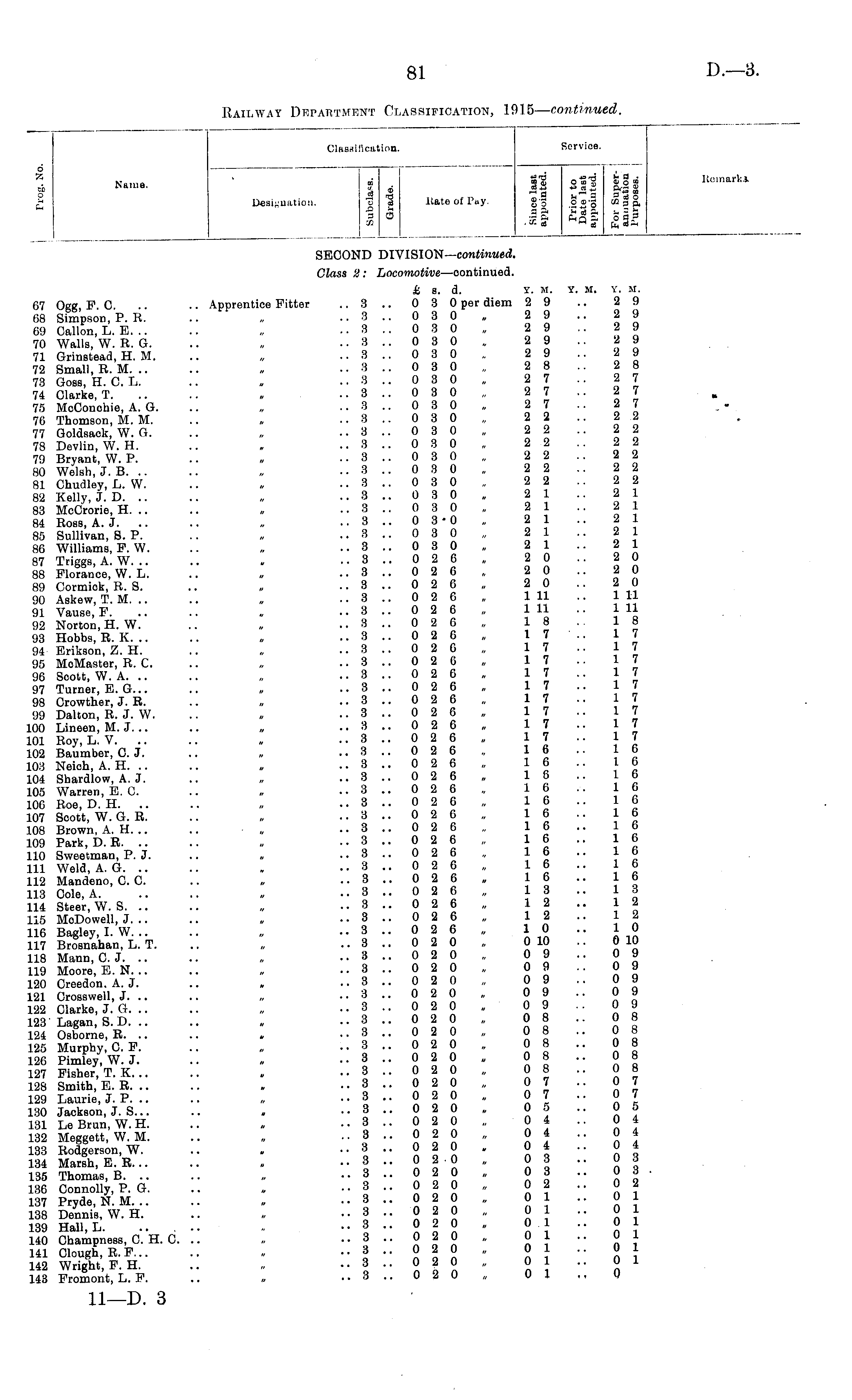 Classification. Scrvice. o * Name • a . fS o-SI s§» Iloinaris* £ Designation. "3 li Hate of Pay. ®'3 .2iB'o M 3 a | 5 || fifSa op cc ,</.s3 H aj (Sh SECOND DIVISION —continued. Class 2: Locomotive —continued. £ b. d. Y. M. Y. M. Y. M. 67 Oee, F. C. .. .. Apprentice Fitter .. 3 .. 0 3 0 per diem 2 9 .. 2 9 68 Simpson, P. R. .. „ .. 3 .. 0 3 0 „ 2 9 .. 2 9 69 Callon, L. E . .. 3 .. 0 3 0 „ 2 9 .. 2 9 70 Walls, W. R. G. .. „ ..3..030. 29.. 29 71 Grinstead, H. M. .. „ .. 3 .. 0 3 0 „ 2 9 .. 2 9 72 Small, R. M. .. .. „ .. 3 .. 0 3 0 „ 2 8 .. 2 8 73 Goss, H. C. L. .. . .. 3 .. 0 3 0 „ 2 7 .. 2 7 7 4 Clarke, T. .. . ..3.. 030,, 27.. 27 75 McConohie, A. G. .. „ .. 3 .. 0 3 0 „ 2 7 .. 2 7 76 Thomson, M. M. .. „ .. 3 .. 0 3 0 „ 2 2 .. 2 2 77 Goldsack, W. G. .. „ .. 3 .. 0 3 0 „ 2 2 .. 2 2 78 Devlin, W. H. .. , .. 3 .. 0 3 0 „ 2 2 .. 2 2 79 Bryant, W. P. .. . .. 3 .. 0 3 0 „ 2 2 .. 2 2 80 Welsh, J. B. .. .. „ .. 3 .. 0 3 0 „ 2 2 .. 2 2 81 Chudley, L. W. .. „ .. 3 .. 0 3 0 „ 2 2 .. 2 2 82 Kelly, J. D. .. .. „ .. 3 .. 0 3 0 „ 2 1 .. 2 1 83 McCrorie, H. .. .. , .. 3 .. 0 3 0 „ 2 1 .. 2 1 84 Ross, A. J. .. .. „ .. 3 .. 0 3-0 „ 2 1 .. 2 1 85 Sullivan, 8. P. .. . .. 3 .. 0 3 0 „ 2 1 .. 2 1 86 Williams, F. W. .. ,. .. 3 .. 0 3 0 , 2 1 .. 2 1 87 Triggs, A. W . ..3.. 026 „ 20 .. 20 88 Florance, W. L. .. „ ..3.. 026 „ 20 .. „ J? 89 Cormiok, R. S. .. „ .. 3 .. 0 2 6 2 0 .. 2 0 90 Askew, T. M. .. .. „ .. 3 .. 0 2 6 „ 1 11 .. 1 11 91 Vause, F. .. .. » .. 3 .. 0 2 6 „ 1 11 ■ • 111 92 Norton, H. W. .. „ .. 3 .. 0 2 6 „ 18.18 93 Hobbs, R. K „ .. 3 .. 0 2 6 „ 17.. 17 94 Erikson, Z. H. .. „ .. 3 .. 0 2 6 „ 17 .. 17 95 MoMaster, R. C. .. ,, .. 3 .. 0 2 6 „ 17 .. 17 96 Scott, W. A. .. .. „ ..3.. 026 „ 17 .. 17 97 Turner, E. G... .. ,, ..3.. 026 ,, 17 .. J ' 98 Crowther, J. R. .. „ .. 3 .. 0 2 6 „ 17 .. 17 99 Dalton, R. J. W. .. „ .. 3 .. 0 2 6 , 1 7 .. 1 7 100 Lineen, M. J. .. .. „ .. 3 .. 0 2 6 „ 17 .. 17 101 Roy, L. V. .. „ .. 3 .. 0 2 6 „ 17 .. 17 102 Baumber, G. J. .. „ .. 3 .. 0 2 6 „ 16 .. 1 6 103 Neich, A. H. .. .. „ .. 3 .. 0 2 6 . 1 6 .. 1 6 104 Shardlow, A. J. .. „ .. 3 .. 0 2 6 „ 18 • • J J 105 Warren, E. C. .. ,, .. 3 .. 0 2 6 „ 16 .. 16 106 Roe, D. H „ .. 3 .. 0 2 6 „ 16 .. 16 107 Scott, W. G. R. .. „ .. 3 .. 0 2 6 „ 16 .. 16 108 Brown, A. H. .. .. „ ..3.. 026 „ 16 .. 16 109 Park, D. R „ .. 3 .. 0 2 6 „ 16 .. 16 110 Sweetman, P. J. .. „ ..3.. 026 „ 16 .. lb 111 Weld, A. G , .. 3 .. 0 2 6 „ 16 .. 16 112 Mandeno, G. C. .. /, .. 3 .. 0 2 6 „ 16 .. 16 113 Cole, A „ .. 3 .. 0 2 6 „ 13 .. 13 114 Steer, W. S. .. .. „ ..3.. 026 „ 12 .. 12 115 McDowell, J. .. .. „ ..3.. 026 ,, 12 .. 12 116 Baeley, I. W. .. .. „ .. 3 .. 0 2 6 „ 10 .. 10 117 Brosnahan, L. T. .. „ .. 3 .. 0 2 0 „ 0 10 .. 0 10 118 Mann, C.J „ .. 3 .. 0 2 0 „ 0 9 .. 0 9 119 Moore, E.N „ ..3.. 020 . 09 .. 09 120 Creedon. A. J. .. « ..3.. 020 „ 09 .. 09 121 Crosswell, J. .. .. „ .. 3 .. 0 2 0 „ 0 9 .. 0 9 122 Clarke, J. G „ .. 3 .. 0 2 0 „ 0 9 . . 0 9 123 Lagan, S.D „ ..3.. 020 „ 08 .. 08 124 Osborne, R . .. 3 .. 0 2 0 „ 0 8 .. 0 8 125 Murphy, C. F. .. „ .. 3 .. 0 2 0 „ 0 8 .. 0 8 126 Pimley, W. J. .. ,, .. 3 .. 0 2 0 „ 0 8 - 0 8 127 Fisher, T. K . ..3.. 020,, 0 8.. 0 8 128 Smith, E. R „ ..3.. 020,, 0 7 .. 0 7 129 Laurie, J. P „ .. 3 .. 0 2 0 „ 0 7 .. 0 7 130 Jackson, J. S . .. 3 .. 0 2 0 „ 0 5 .. 0 5 131 LeBrun, W.H. .. „ .. 3 .. 0 2 0 „ 0 4 .. 0 4 132 Meggett, W. M. .. „ .. 3 .. 0 2 0 „ 0 4 .. 0 4 133 Rodgerson, W. .. » • • • • 0 2 0 04 .. 04 134 Marsh, E. R „ •• 3 •• 0 2 0 „ 0 3 .. 0 3 135 Thomas, B. .. .. „ •• 3 .. 0 2 0 „ 0 3 .. 0 3 • 136 Connolly, P. G. .. „ • • 3 ■ • 0 2 0 0 2 .. 0 2 137 Pryde, N. M „ •• 3 •• 0 2 0 „ 0 1 .. 0 1 138 Dennis, W.H. .. » .. 3 .. 0 2 0 „ 0 1 .. 0 1 1S9 Hall L .. .. « ..3.. 020 „ 01 .. 01 140 Champness, C* H. C. .. „ •• 3 •• 0 2 0 , 0 1 .. 0 1 141 Clough, R.F ,, .. 3 .. 0 2 0 „ 0 1 .. 0 1 142 Wright, F.H. .. „ .. 3 .. 0 2 0 „ 0 1 .. 0 1 143 Fromont, L. F. .. » .. 3 .. 0 2 0 „ 0 1 »t U