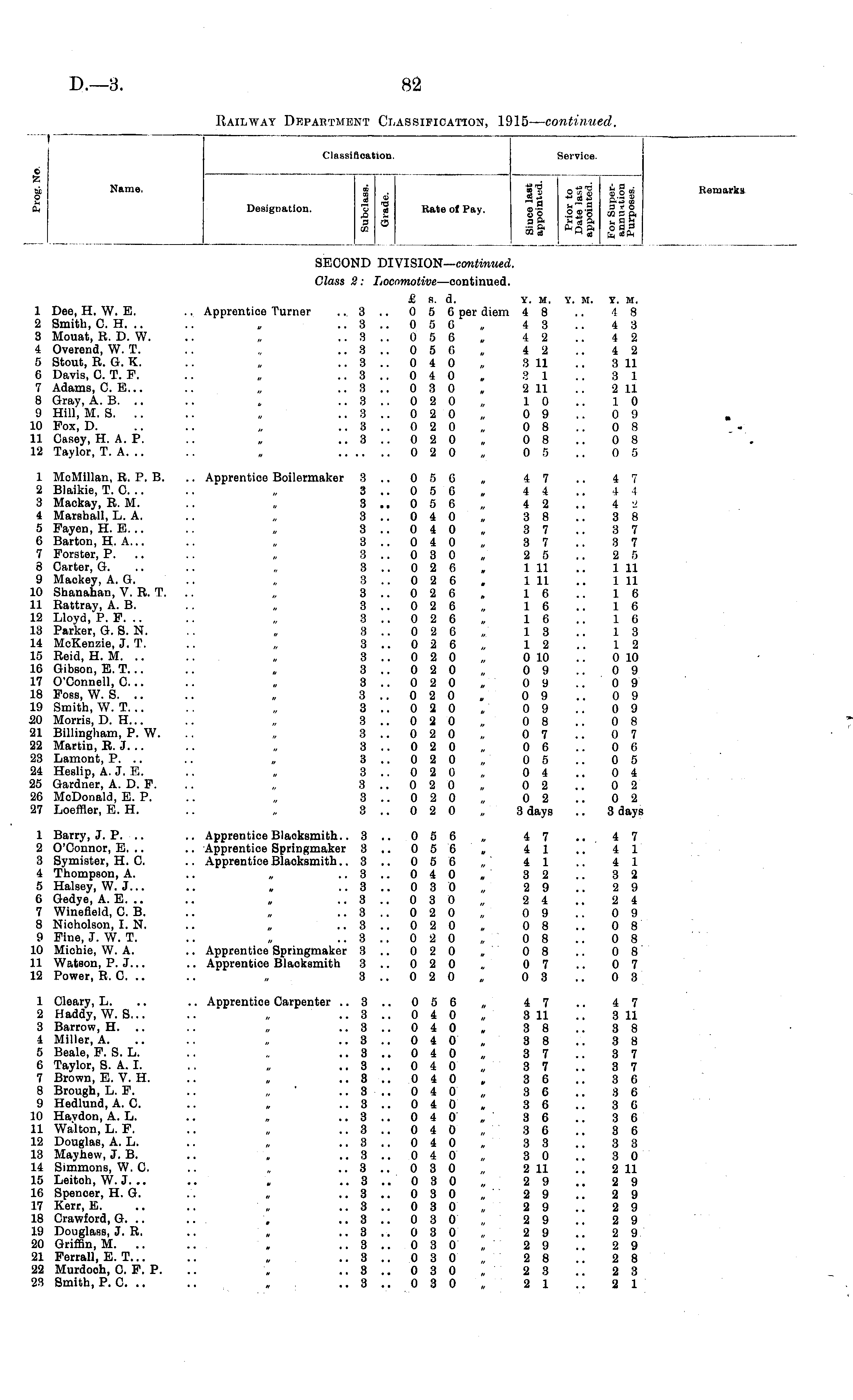 J— Classification. Service. © _ % # , . I ai Name. E . 11 So® Remarks 0 oj £ Designation. o 11 Rate of Pay. ®| o®| 55 a p 6 3 ? "S S< 5 £ <° «§■ £S£ SECOND DIVISION—continued. Class 2: Locomotive—continued. £ S. d. Y. M. Y. M. S. M. 1 Dee, H. W. E. .. Apprentice Turner .3 .. 0 5 6 per diem 4 8 .. 4 8 2 Smith, 0. H. .. .. „ ,.3.. 056 „ 43 .. 43 3 Mouat, R. D. W. .. „ .. 3 .. 0 5 6 4 2 .. 4 2 4 Overend, W. T. .. „ .. 3 .. 0 5 6 „ 42 .. 42 5 Stout, R. G. K. .. „ .. 3 .. 0 4 0 „ 3 IX .. 3 11 6 Davis, 0. T. P. .. „ .. 3 .. 0 4 0 „ 8 1 .. 3 1 7 Adams, C. E... .. „ .. 3 .. 0 3 0 „ 2 11 .. 2 11 8 Gray, A. B. .. .. „ .. 3 .. 0 2 0 „ 10 .. 10 9 Hill, M. S. .. .. „ .. 3 .. 0 2 0 0 9 .. 0 9 10 Pox, D. .. .. „ .. 3 .. 0 2 0 0 8 .. 0 8 11 Casey, H. A. P. .. „ .. 3 .. 0 2 0 „ 0 8 .. 0 8 12 Taylor, T. A. .. .. „ 0 2 0 „ 0 5 .. 0 5 1 McMillan, R. P. B. .. Apprentice Boilermaker 3.. 056 „ 47 .. 47 2 Blaikie, T. C. .. .. „ 3 .. 0 5 6 4 4 .. 4 4 3 Mackay, R. M. .. „ 3 .. 0 5 6 4 2 .. 4 2 4 Marshall, L. A. .. „ 3 .. 0 4 0 3 8 .. 3 8 5 Payen, H. E... .. „ 3 ... 0 4 0 3 7 .. 3 7 6 Barton, H. A... .. ,, 3 .. 0 4 0 3 7 .. 3 7 7 Porster, P. .. .. „ 3..030„ 25 .. 25 8 Carter, G. .. „ 3 .. 0 2 6 1 11 .. 1 11 9 Mackey, A. G. .. „ 3 .. 0 2 6 111 .. 1 11 10 Shanahan, V. R. T. „ 3 .. 0 2 6 „ 16 .. 16 11 Rattray, A. B. .. „ 3 .. 0 2 6 1 6 .. 1 6 12 Lloyd, P.P. .. .. „ 3 .. 0 2 6 1 6 .. 1 6 13 Parker, G. S. N. .. „ 3 .. 0 2 6 1 3 .. 1 3 14 McKenzie, J. T. .. „ 3 .. 0 2 6 1 2 .. 1 2 15 Reid, H. M. .. .. „ 3 .. 0 2 0 0 10 .. 0 10 16 Gibson, E. T. .. .. „ 3 .. 0 2 0 0 9 .. 0 9 17 O'Connell, C... .. „ 3 .. 0 2 0 0 9 .. 0 9 18 Poss, W. S. .. .. „ 3 .. 0 2 0 0 9 .. 0 9 19 Smith, W. T. .. „ 3 .. 0 2 0 0 9 .. 0 9 20 Morris, D. H... .. „ 3 .. 0 2 0 0 8 .. 0 8 21 Billingham, P. W. „ 3.. 020,, 07.. 07 22 Martin, R. J. .. .. „ 3.. 020 „ 06 .. 06 23 Lamont, P. .. .. „ 3 .. 0 2 0 0 5 .. 0 5 24 Heslip, A. J. E. .. „ 3 .. 0 2 0 0 4 .. 0 4 25 Gardner, A. D. P. „ 3 .. 0 2 0 0 2 .. 0 2 26 McDonald, E. P. .. „ 3.. 020,, 02.. 02 27 Loeffler, E. H. .. „ 3 .. 0 2 0 „ 3 days .. 3 days 1 Barry, J. P. .. .. Apprentice Blaoksmith.. 3.. 056 „ 47 .. 47 2 O'Connor, E. .. .. Apprentice Springmaker 3.. 056 „ 41 .. 41 3 Symister, H. C. .. Apprentice Blacksmith.. 3.. 056 „ 41 .. 41 4 Thompson, A. .. „ .. 3 .. 0 4 0 3 2 .. 3 2 5 Halsey, W. J... .. „ ..3.. 03 0 „ 29 .. 29 6 Gedye, A. E. .. .. „ ..3.. 030 „ 24 .. 24 7 Winefield, C. B. .. „ .. 3 .. 0 2 0 „ 0 9 .. 0 9 8 Nioholson, I. N. .. „ ..3.. 020 „ 08 .. 08 9 Pine, J. W. T. .. „ .. 3 .. 0 2 0 „ 0 8 .. 0 8 10 Michie, W. A. .. Apprentice Springmaker 3.. 020 „ 08 .. 08 11 Watson, P. J... .. Apprentice Blaoksmith 3.. 020 „ 07 .. 07 12 Power, R. C. .. .. „ 3 .. 0 2 0 0 3 .. 0 3 1 Cleary, L. .. .. Apprentice Carpenter ..3.. 0 5 6 „ 47 .. 47 2 Haddy, W. S... .. „ .. 3 .. 0 4 0 3 11 .. 3 11 3 Barrow, H. .. .. „ ..3.. 040 „ 38 .. 38 4 Miller, A. .. „ .. 3 .. 0 4 0 3 8 .. 3 8 5 Beale, P. S. L. .. ..3.. 040 „ 37 .. 37 6 Taylor, S.A.I. .. „ .. 3 .. 0 4 0 „ 3 7 .. 3 7 7 Brown, E. V. H. .. „ .. 3 .. 0 4 0 „ 3 6 .. 3 6 8 Brough, L. P. .. „ ' .. 3 .. 0 4 0 „ 3 6 .. 3 6 9 Hedlund, A. C. .. „ ..3.. 040 „ 36 .. 36 10 Havdon, A. L. .. „ .. 3 .. 0 4 0 „ 36 .. 36 11 Walton, L. P. .. „ .. 3 .. 0 4 0 3 6 .. 3 6 12 Douglas, A. L. .. „ ..3.. 040 „ 33 .. 33 13 Mayhew, J. B. .. , .. 3 .. 0 4 0 „ 3 0 .. 3 0 14 Simmons, W. C. .. „ .. 3 .. 0 3 0 „ 2 11 .. 2 11 15 Leitoh, W. J. .. .. . .. 3 .. 0 3 0 2 9 .. 2 9 16 Spencer, H. G. „ .. 3 .. 0 3 0 „ 2 9 .. 2 9 17 Kerr, E. .. .. „ ..3.. 030 „ 29 .. 29 18 Crawford, G. .. .. , ..3.. 030 „ 29 .. 29 19 Douglass, J. R. .. „ .. 3 .. 0 3 0 „ 2 9 .. 2 9 20 Griffin, M. .. „ ..3.. 030 „ 29 .. 29 21 Ferrall, E. T... .. „ ..3.. 030 „ 28 .. 28 22 Murdoch, C. P. P. .. „ .. 3 .. 0 3 0 „ 2 3 .. 2 3 23 Smith, P. C. .. .. „ ..3.. 030 „ 21 .. 21