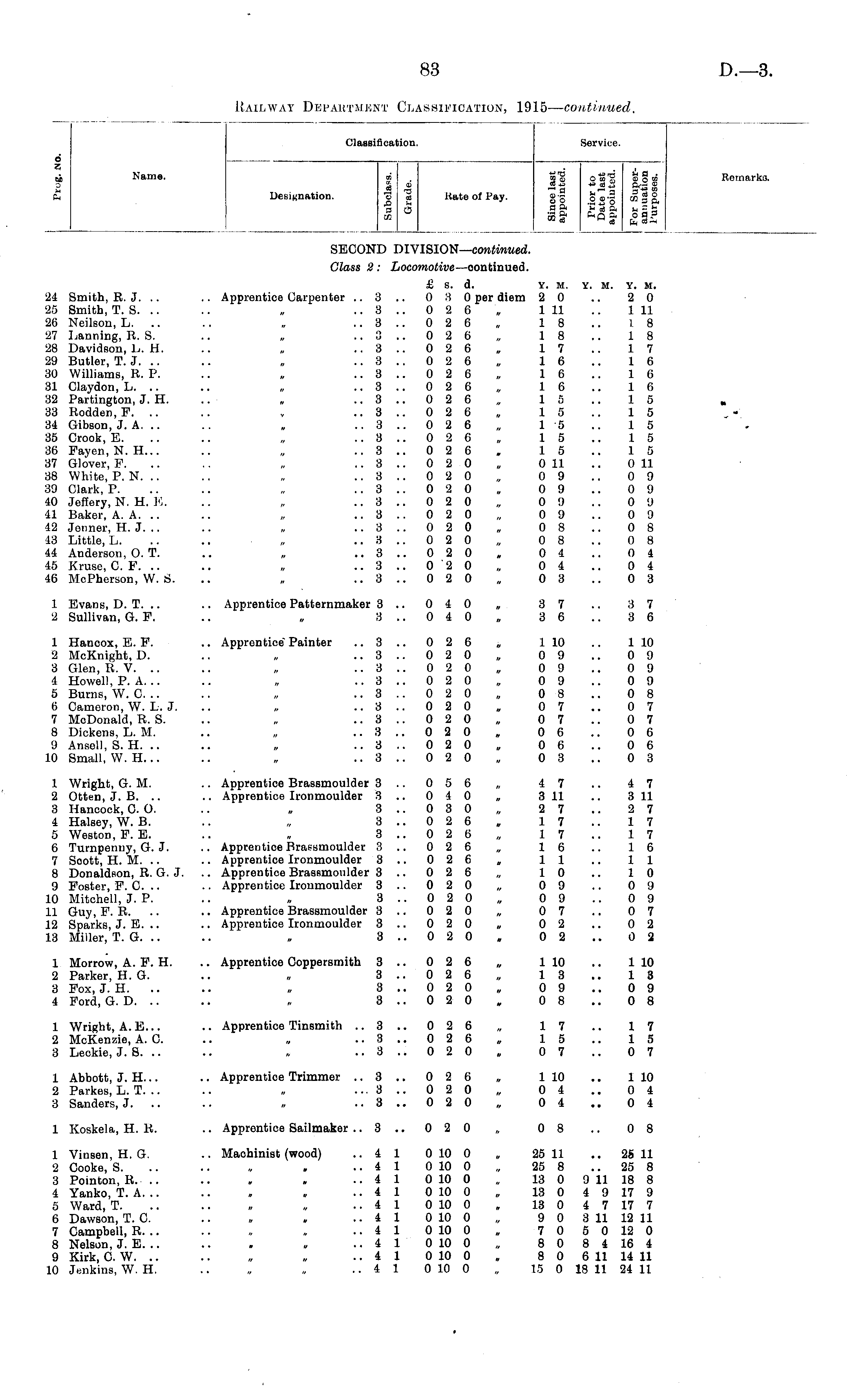 Classification. Service. 0 • cj> Name. « , © o» Remarks. O 2i © eg -w a3 jj Q,-— CD 'm r ri £3 . r—" „ r~* co Ph Designation. o Kate of Pay. g-g g ®.g 02 § g, sS n? ?Sa kSS «= "«§• (g §5 SECOND DIVISION—continued. Glass 2 : Locomotive—oontinued. £ s. d. Y. m. y. m. y. M. 24 Smith, R. J. .. .. Apprentice Carpenter .. 3 .. 0 3 0 per diem 2 0 .. 2 0 25 Smith, T. S. .. .. „ .. 3 .. 0 2 6 1 11 .. 1 11 26 Neilson, L. .. .. , .. 3 .. 0 2 6 „ 18 .. 18 27 banning, R. S. .. „ .. 3 .. 0 2 6 „ 18 .. 18 28 Davidson, Li. H. .. „ .. 3 .. 0 2 6 „ 17 .. 17 29 Butler, T. J. .. .. „ .. 3 .. 0 2 6 „ 16 .. 16 30 Williams, R. P. .. „ .. 3 .. 0 2 6 „ 16 .. 16 31 Claydon, L. .. .. „ .. 3 .. 0 2 6 1 6 .. 1 6 32 Partington, J. H. .. „ .. 3 .. 0 2 6 „ 15 .. 15 „ 33 Rodden, P. .. .. , ..3.. 026,, 15 .. 15 34 Gibson, J. A. .. .. „ .. 3 .. 0 2 6 1 5 .. 1 5 35 Crook, E. .. .. „ .. 3 .. 0 2 6 „ 15 .. 15 36 Payen, N. H... .. „ ..3.. 026 , 15 .. 15 37 Glover, P. .. „ .. 3 .. 0 2 0 0 11 .. 0 11 38 White, P. N. .. .. „ .. 3 .. 0 2 0 „ 0 9 .. 0 9 39 Clark, P. .. „ .. 3 .. 0 2 0 0 9 .. 0 9 40 Jeffery, N. H. E. .. „ .. 3 .. 0 2 0 „ 0 9 .. 0 9 41 Baker, A. A. .. .. „ .. 3 .. 0 2 0 „ 0 9 .. 0 9 42 Jenner, H. J. .. .. „ .. 3 .. 0 2 0 „ 0 8 .. 0 8 43 Little, L. .. .. „ .. 3 .. 0 2 0 „ 0 8 .. 0 8 44 Anderson, O. T. .. „ ..3.. 020 „ 04 .. 04 45 Kruse, C. F. .. .. „ .. 3 .. 0 2 0 „ 0 4 .. 0 4 46 McPherson, W. S. .. „ ..3.. 020 „ 03 .. 03 1 Evans, D. T. .. .. Apprentice Patternmaker 3.. 040 „ 37 .. 37 2 Sullivan, G. P. .. „ 3 .. 0 4 0 3 6 .. 3 6 1 Hancox, E. P. .. Apprentice Painter .. 3 .. 0 2 6 „ 1 10 .. 1 10 2 McKnight, D. .. „ .. 3 .. 0 2 0 „ 0 9 .. 0 9 3 Glen, R. V. .. .. „ .. 3 .. 0 2 0 „ 0 9 .. 0 9 4 Howell, P. A. .. .. „ .. 3 .. 0 2 0 „ 0 9 .. 0 9 5 Burns, W. C. .. .. „ .. 3 .. 0 2 0 „ 0 8 .. 0 8 6 Camoron, W. L. J. .. „ .. 3 .. 0 2 0 „ 0 7 .. 0 7 7 McDonald, R. S. .. „ .. 3 .. 0 2 0 „ 0 7 .. 0 7 8 Dickens, L. M. .. „ .. 3 .. 0 2 0 „ 0 6 .. 0 6 9 Ansell, S. H. .. .. „ ..3.. 020 „ 06 .. 06 10 Small, W. H... .. „ .. 3 .. 0 2 0 „ 0 3 .. 0 3 1 Wright, G. M. .. Apprentice Brassmoulder 3.. 056 „ 47 .. 47 2 Otten, J. B. .. .. Apprentice Ironmoulder 3 .. 0 4 0 „ 3 11 .. 3 11 3 Hancock, C. O. .. „ 3 .. 0 3 0 2 7 .. 2 7 4 Halsey, W. B. .. „ 3 .. 0 2 6 1 7 .. 1 7 5 Weston, P. E. .. „ 3 .. 0 2 6 1 7 .. 1 7 6 Turnpenny, G. J. .. Apprentice Brassmoulder 3.. 026 „ 16 .. 16 7 Soott, H. M. .. .. Apprentice Ironmoulder 3.. 026 „ 11 .. 11 8 Donaldson, R. G. J. .. Apprentice Brassmoulder 3.. 026 „ 10 .. 10 9 Foster, P. C. .. .. Apprentice Ironmoulder 3.. 020 „ 09 .. 09 10 Mitchell, J. P. .. ,, 3 .. 0 2 0 0 9 .. 0 9 11 Guy, F. R. .. .. Apprentice Brassmoulder 3.. 020 „ 07 .. 07 12 Sparks, J. E. .. .. Apprentice Ironmoulder 3.. 020 „ 02 .. 02 13 Miller, T. G. .. .. „ 3..020 „ 02.. 02 1 Morrow, A. F. H. .. Apprentice Coppersmith 3 .. 0 2 6 „ 1 10 .. 1 10 2 Parker, H. G. .. „ 3 .. 0 2 6 1 3 .. 1 3 3 Fox, J. H. .. .. „ 3 .. 0 2 0 „ 09.. 09 4 Ford, G. D. .. .. „ 3..020. 08 .. 08 1 Wright, A. E... .. Apprentice Tinsmith ..3.. 026 „ 17 .. 17 2 McKenzie, A. C. .. „ .. 3 .. 0 2 6 „ 15 .. 15 3 Leckie, J. 8. .. .. .. 3 .. 0 2 0 „ 0 7 .. 0 7 1 Abbott, J. H... .. Apprentice Trimmer ..3.. 026 „ 110 .. 110 2 Parkes, L. T. .. .. „ ...3.. 020 „ 04 .. 04 3 Sanders, J. .. .. „ ..3.. 020 „ 04 .. 04 1 Koskela, H. R. .. Apprentice Sailmaker .. 3.. 020 „ 08 .. 08 1 Vinsen, H. G. .. Machinist (wood) ..4 1 0 10 0 „ 25 11 .. 28 11 2 Cooke, S. .. .. „ . ..41 0 10 0 „ 25 8 .. 25 8 3 Pointon, R. .. .. „ . ..4 1 0 10 0 „ 13 0 9 11 18 8 4 Yanko, T. A. .. .. „ „ ..4 1 0 10 0 „ 13 0 4 9 17 9 5 Ward, T. .. .. . „ ..4 1 0 10 0 . 13 0 4 7 17 7 6 Dawson, T. C. .. » „ ..4 1 0 10 0 „ 9 0 3 11 12 11 7 Campbell, R. .. .. „ . ..41 0 10 0 „ 7 0 5 0 12 0 8 Nelson, J. E. .. .. . „ ..4 1 0 10 0 „ 8 0 8 4 16 4 9 Kirk, C. W. .. .. „ „ ..4 1 0 10 0 „ 8 0 6 11 14 11 10 Jenkins, W. H. .. „ „ ..4 1 0 10 0 „ 15 0 18 11 24 11