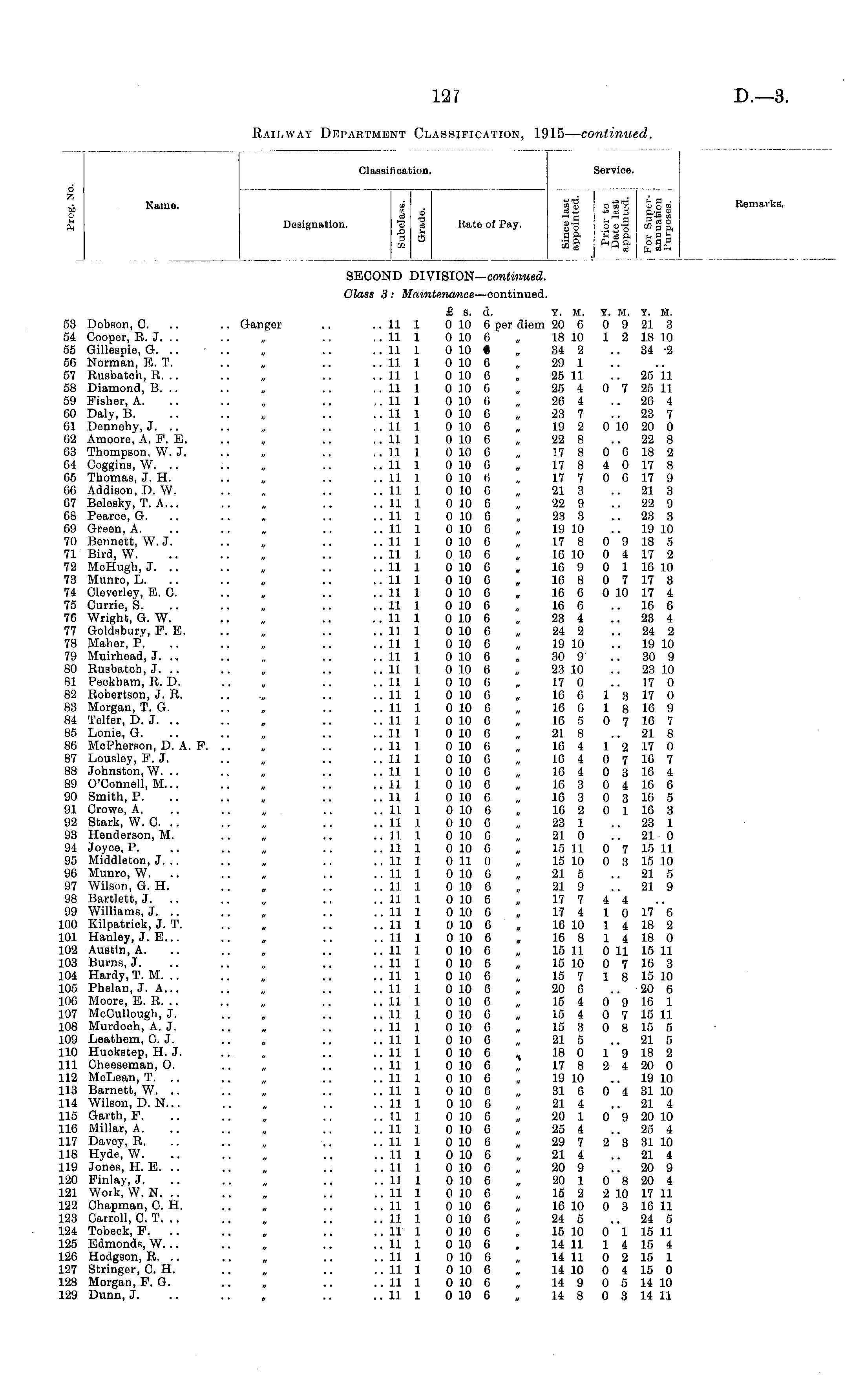 Classification. Service. O • Name. £ . Remarks. o s s £ Designation. 73 ce Kate of Pay. ®*g o a-g ajp^ a a aa 'ntaft « ® i» g§s SECOND DIVISION—contain. Class 3 : Maintenance—continued. & S. d. y. M. ¥. M. Y. M. 53 Dobson, 0. .. .. Ganger .. .. 11 1 0 10 6 per diem 20 6 0 9 21 3 54 Cooper, E. J. .. .. „ .. .. 11 1 0 10 6 „ 18 10 1 2 18 10 55 Gillespie, G. .. .. „ .. ..Ill 0 10 6 „ 34 2 .. 34 -2 56 Norman, E. T. .. „ .. .. 11 1 0 10 6 „ 29 1 57 Rusbateh, R. .. .. „ .. ..Ill 0 10 6 „ 25 11 .. 25 11 58 Diamond, B. .. .. „ .. .. 11 1 0 10 G „ 25 4 0 7 25 11 59 Fisher, A. .. .. „ .. ,. 11 1 0 10 6 „ 26 4 .. 26 4 60 Daly, B. .. .. „ .. .. 11 1 0 10 6 „ 23 7 .. 23 7 61 Dennehy, J. .. .. „ .. .. 11 1 0 10 6 „ 19 2 0 10 20 0 62 Amoore, A. P. E. .. „ .. .. 11 1 0 10 6 „ 22 8 22 8 63 Thompson, W. J. .. „ .. .. 11 1 0 10 6 „ 17 8 0 6 18 2 64 Coggins, W. .. .. „ .. .. 11 1 0 10 6 „ 17 8 4 0 17 8 65 Thomas, J. H. .. „ .. .. 11 1 0 10 6 „ 17 7 0 6 17 9 66 Addison, D. W. .. „ .. ..11 1 0 10 6 „ 21 3 21 3 67 Belesky, T. A... .. „ .. .. 11 1 0 10 6 „ 22 9 22 9 68 Pearoe, G. .. „ .. .. 11 1 0 10 6 „ 23 3 23 3 69 Green, A. .. .. „ .. .. 11 1 0 10 6 „ 19 10 19 10 70 Bennett, W. J. .. „ .. .. 11 1 0 10 6 „ 17 8 0 9 18 5 71 Bird, W. .. .. „ .. .. 11 1 0 10 6 „ 16 10 0 4 17 2 72 MoHugh, J. .. .. „ .. ..Ill 0 10 6 „ 16 9 0 1 16 10 73 Munro, L. .. .. „ .. .. 11 1 0 10 6 „ 16 8 0 7 17 3 74 Cleverley, E. C. .. „ .. ..Ill 0 10 6 „ 16 6 0 10 17 4 75 Currie, S. .. .. „ .. .. 11 1 0 10 6 „ 16 6 16 6 76 Wright, G. W. .. „ .. ..Ill 0 10 6 „ 23 4 23 4 77 Goldsbury, F. E. .. „ .. ..Ill 0 10 6 „ 24 2 24 2 78 Maher, P. .. .. „ .. ..Ill 0 10 6 „ 19 10 19 10 79 Muirhead, J. .. „ .. .. 11 1 0 10 6 „ 30 9' 30 9 80 Rusbateh, J. .. .. „ .. .. 11 1 0 10 6 „ 23 10 ..23 10 81 Peokham, R. D. .. „ .. .. 11 1 0 10 6 „ 17 0 .. 17 0 82 Robertson, J. R. .. „ .. .. 11 1 0 10 6 „ 16 6 1 3 17 0 83 Morgan, T. G. .. „ .. .. 11 1 0 10 6 „ 16 6 1 8 16 9 84 Telfer, I). J. .. .. „ .. ..Ill 0 10 6 » 16 5 0 7 16 7 85 Lonie, G. .. .. „ .. .. 11 1 0 10 6 „ 218 21 8 86 MePherson, D. A. F. .. „ .. .. 11 1 0 10 6 „ 16 4 1 2 17 0 87 Lousley, F. J. .. „ .. .. 11 1 0 10 6 „ 16 4 0 7 16 7 88 Johnston, W. .. .. „ .. .. 11 1 0 10 6 „ 16 4 0 3 16 4 89 O'Oonnell, M... .. „ .. .. 11 1 0 10 6 , 16 3 0 4 16 6 90 Smith, P. .. .. „ .. ..Ill 0 10 6 „ 16 3 0 3 16 5 91 Crowe, A. .. .. „ .. .. 11 1 0 10 6 „ 16 2 0 1 16 3 92 Stark, W. C. .. .. „ .. .. 11 1 0 10 6 „ 23 1 23 1 93 Henderson, M. .. „ .. .. 11 1 0 10 6 „ 21 0 21 0 94 Joyoe, P. .. .. „ .. .. 11 1 0 10 6 „ 15 11 0 7 15 11 95 Middleton, J. .. .. „ .. .. 11 1 0 110 „ 15 10 0 3 15 10 96 Munro, W. .. .. „ .. ..11 1 0 10 6 „ 21 5 21 5 97 Wilson, G. H. .. „ .. ..11 1 0 10 6 „ 21 9 21 9 98 Bartlett, J. .. .. „ .. .. 11 1 0 10 6 „ 17 7 4 4 99 Williams, J. .. .. „ .. .. 11 1 0 10 6 „ 17 4 1 0 17 6 100 Kilpatrick, J. T. .. „ .. .. 11 1 0 10 6 „ 16 10 1 4 18 2 101 Hanley, J. E... .. „ .. .. 11 1 0 10 6 „ 16 8 1 4 18 0 102 Austin, A. .. .. „ .. .. 11 1 0 10 6 „ 15 11 0 11 15 11 103 Burns, J. .. .. „ .. ..Ill 0 10 6 „ 15 10 0 7 16 3 104 Hardy, T. M. .. .. „ .. ..Ill 0 10 6 „ 15 7 1 8 15 10 105 Phelan, J. A... .. „ .. ..11 1 0 10 6 „ 20 6 .. 20 6 106 Moore, E. R. .. .. „ .. .. 11 1 0 10 6 „ 15 4 0 9 16 1 107 MeCullough, J. .. „ .. .. 11 1 0 10 6 „ 15 4 0 7 15 11 108 Murdooh, A. J. .. „ .. .. 11 1 0 10 6 „ 15 3 0 8 15 5 109 Leathern, C. J. .. „ .. .. 11 1 0 10 6 „ 21 5 .. 21 5 110 Huokstep, H. J. .. „ .. .. 11 1 0 10 6 18 0 1 9 18 2 111 Cheeseman, O. .. „ .. .. 11 1 0 10 6 „ 17 8 2 4 20 0 112 MoLean, T. .. .. „ .. .. 11 1 0 10 6 „ 19 10 19 10 113 Barnett, W. .. .. „ .. .. 11 1 0 10 6 „ 31 6 0 4 31 10 114 Wilson, D. N... .. „ .. .. 11 1 0 10 6 „ 21 4 .. 21 4 115 Garth, F. .. .. „ .. ..11 1 0 10 6 „ 20 1 0 9 20 10 116 Millar, A. .. .. „ .. ..Ill 0 10 6 „ 25 4 25 4 117 Davey, R. .. .. „ .. .. 11 1 0 10 6 „ 29 7 2 3 31 10 118 Hyde, W. .. .. „ .. ..Ill 0 10 6 „ 21 4 .. 21 4 119 Jones, H. E. .. .. „ .. ..11 1 0 10 6 „ 20 9 20 9 120 Finlay, J. .. .. „ .. .. 11 1 0 10 6 „ 20 1 0 8 20 4 121 Work, W. N. .. .. „ .. .. 11 1 0 10 6 „ 15 2 2 10 17 11 122 Chapman, C. PI. .. „ .. .. 11 1 0 10 6 „ 16 10 0 3 16 11 123 Carroll, C. T. .. .. „ .. .. 11 1 0 10 6 „ 24 5 24 5 124 Tobeek, F. .. .. „ .. ..Ill 0 10 6 „ 15 10 0 1 15 11 125 Edmonds, W. .. .. „ .. .. 11 1 0 10 6 „ 14 11 1 4 15 4 126 Hodgson, R. .. .. „ .. ..11 1 0 10 6 „ 14 11 0 2 15 1 127 Stringer, C. H. .. „ .. .. 11 1 0 10 6 „ 14 10 0 4 15 0 128 Morgan, F. G. .. „ .. .. 11 1 0 10 6 „ 14 9 0 5 14 10 129 Dunn, J. .. .. „ .. ..Ill 0 10 6 „ 14 8 0 3 14 11