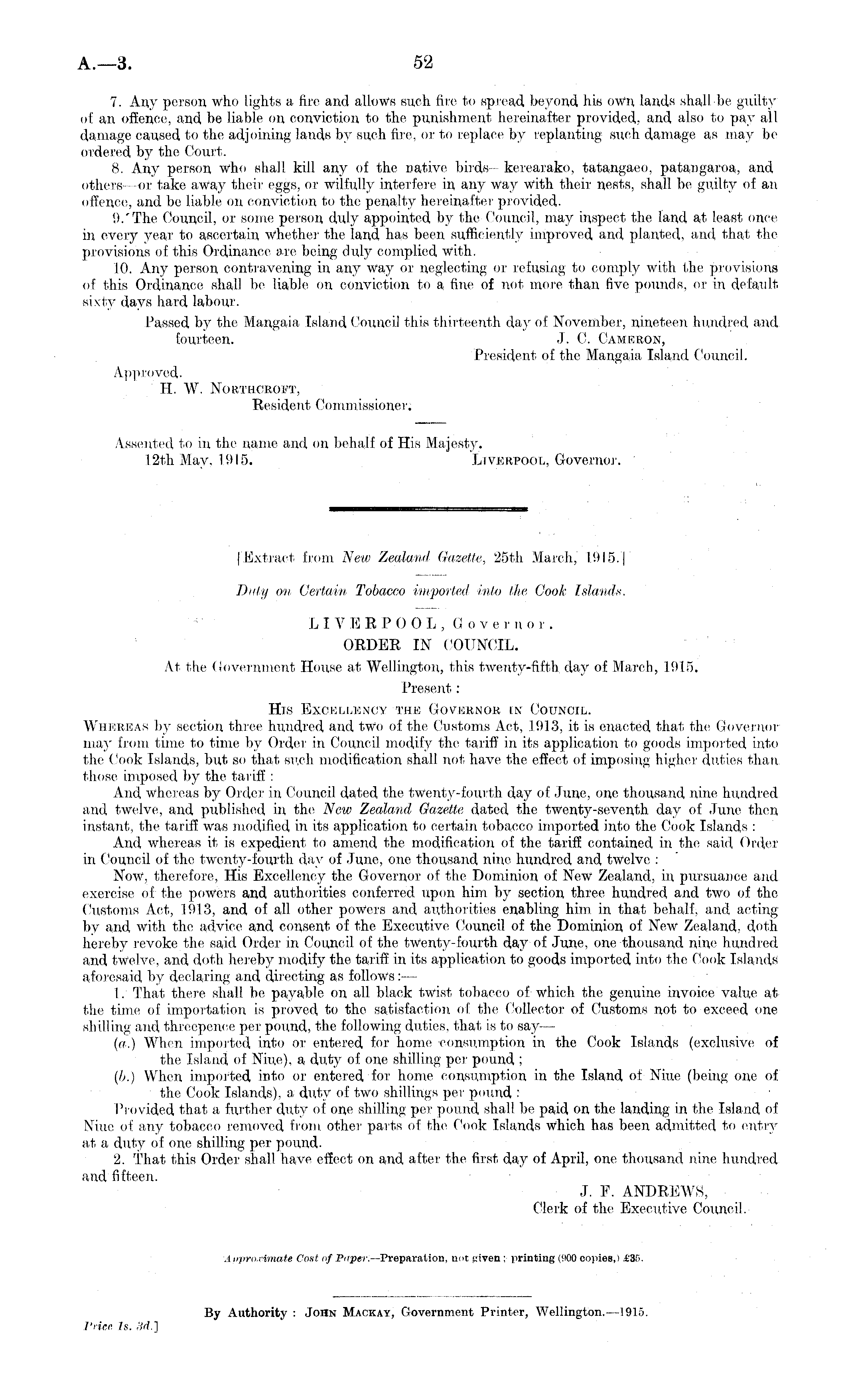 [Extract from New Zealand Gazette, 25th March, 1915.] Duly on Certain Tobacco imported into the Cook Islands. LIVERPOOL,G o v c m or . ORDER IN COUNCIL. At the Government House at Wellington, this twenty-fifth day of March, 1915. Present : His Excellency the Governor in Council. Whereas by section three hundred and two of the Customs Act, 1913, it is enacted that the Governor may from time to time by Order in Council modify the tariff in its application to goods imported into the Cook Islands, but so that sr.ch modification shall not have the effect of imposing higher duties than those imposed by the tariff : And whereas by Order in Council dated the twenty-fourth day of June, one thousand nine hundred and twelve, and published in the New Zealand Gazette dated the twenty-seventh day of June then instant, the tariff was modified in its application to certain tobacco imported into the Cook Islands : And whereas it is expedient to amend the modification of the tariff contained in the said Order in Council of the twenty-fourth day of June, one thousand nine hundred and twelve : Now, therefore, His Excellency the Governor of the Dominion of New Zealand, in pursuance and exercise of the powers and authorities conferred upon him, by section three hundred and two of the Customs Act, 1913, and of all other powers and authorities enabling him in that behalf, and acting by and with the advice and consent of the Executive Council of the Dominion of New Zealand, doth hereby revoke the said Order in Council of the twenty-fourth day of June, one thousand nine hundred and twelve, and doth hereby modify the tariff in its application to goods imported into the Cook Islands aforesaid by declaring and directing as follows: — 1. That there shall bo payable on all black twist tobacco of which the genuine invoice value at the time of importation is proved to tho satisfaction of the Collector of Customs not to exceed one shilling and, threepence per pound, the following duties, that is to say — (ff.) When imported into or entered for home consumption in the Cook Islands (exclusive of the Island of Nine), a duty of one shilling per pound ; (/,.) When imported into or entered for home consumption in the Island of Niue (being one of the Cook Islands), a duty of two shillings per pound : Provided that a further duty of one shilling per pound shall be paid on the landing in the Island of Niue of any tobacco removed from other parts of the Cook Islands which has been admitted to entry at a duty of one shilling per pound. 2. That this Order shall have effect on and after the first day of April, one thousand nine hundred and fifteen. J. F. ANDREWS, Clerk of the Executive Council.