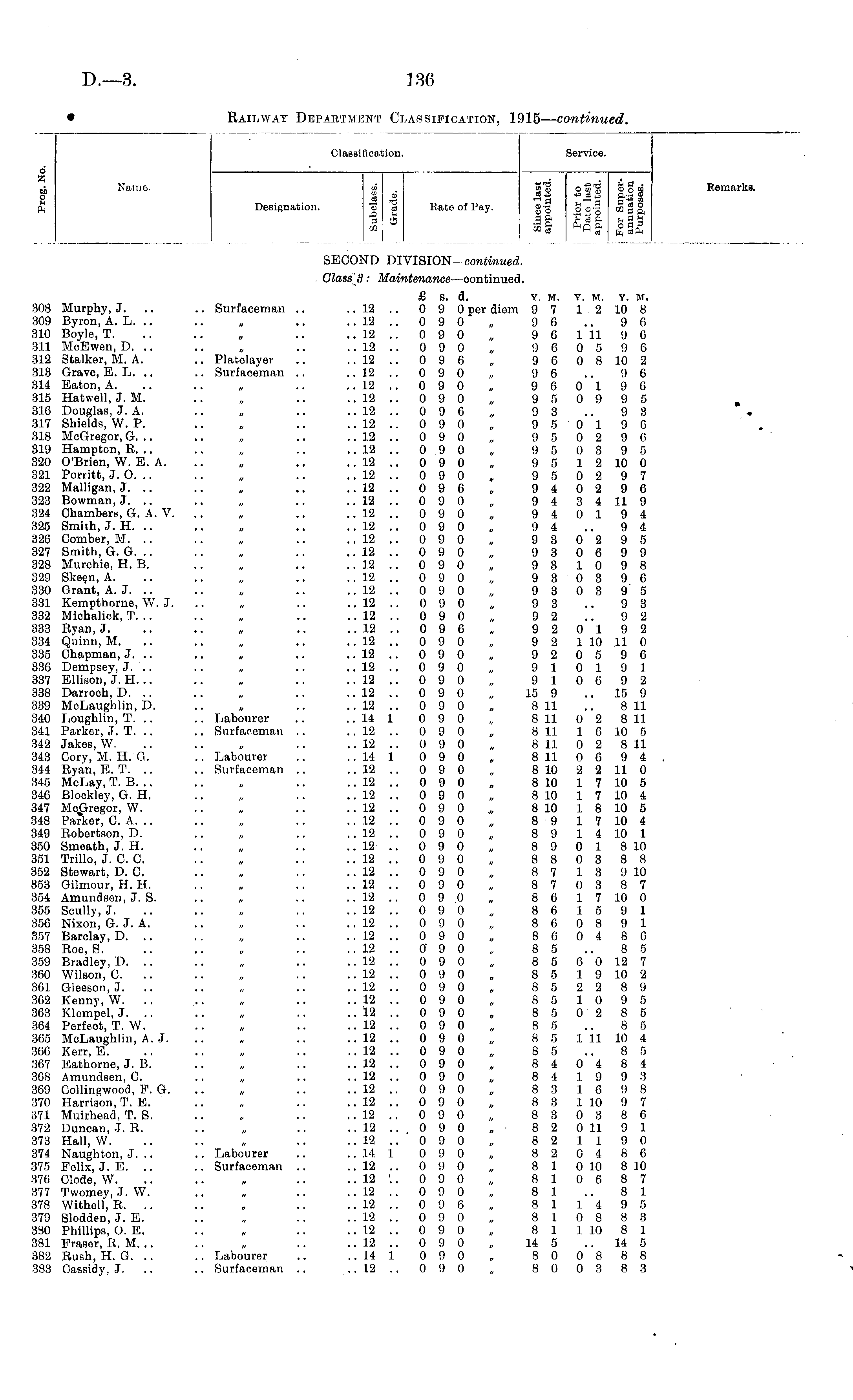 Classification. Service. o 2 55 i oi, Name. » Remarks. o cS -w -*= <D £ Designation. o a llate of Pay. g-g o ®-i oo § §, 3 S s & ? 3 & * 2 si SECOND DIVISION—continued. Class'3 •• Maintenance—continued. £ s. d. Y. M. y. M. V. M. 308 Murphy, 3. .. .. Surfaceman .. .. 12 .. 0 9 0 per diem 9 7 1 2 10 8 309 Byron, A. L. .. .. „ .. .. 12 .. 0 9 0 „ 9 6 .. 9 6 310 Boyle, T. .. .. „ .. .. 12 .. 0 9 0 „ 9 6 1 11 9 6 311 McEwen, D. .. .. „ .. ..12.. 090 „ 960596 312 Stalker, M. A. .. Platelayer .. .. 12 .. 0 9 6 „ 9 6 0 8 10 2 313 Grave, E. L. .. .. Surfaoeman .. ..12.. 090 „ 96 .. 96 314 Eaton, A. .. .. „ .. .. 12 .. 0 9 0 , 9 6 0 1 9 6 315 Hatwell, J. M. .. „ .. .. 12 .. 0 9 0 „ 9 5 0 9 9 5 316 Douglas, J. A. .. „ .. ..12 „ 0 9 6 , 9 3 .. 9 3 317 Shields, W. P. .. , .. ..12 .. 0 9 0 „ 9 5 0 1 9 6 318 McGregor, G. .. .. „ .. .. 12 .. 0 9 0 „ 9 5 0 2 9 6 319 Hampton, R. .. .. „ .. .. 12 .. 0 9 0 „ 9 5 0 3 9 5 320 O'Brien, W. E. A. .. „ .. .. 12 .. 0 9 0 „ 9 5 1 2 10 0 321 Porritt, J. O. .. .. „ .. .. 12 .. 0 9 0 , 9 5 0 2 9 7 322 Malligan, J. .. .. „ .. .. 12 .. 0 9 6 „ 9 4 0 2 9 6 323 Bowman, J. .. .. „ .. .. 12 .. 0 9 0 „ 9 4 3 4 11 9 324 Chambers, G. A. V. .. „ .. .. 12 .. 0 9 0 „ 9 4 0 1 9 4 325 Smith, J. H. .. .. „ .. .. 12 .. 0 9 0 „ 9 4 .. 9 4 326 Comber, M. .. .. „ .. .. 12 .. 0 9 0 „ 9 3 0 2 9 5 327 Smith, G. G. .. .. „ .. .. 12 .. 0 9 0 „ 9 3 0 6 9 9 328 Murchie, H. B. .. „ .. .. 12 .. 0 9 0 „ 9 3 1 0 9 8 329 Ske?n, A. .. .. „ .. .. 12 .. 0 9 0 „ 9 3 0 3 9 6 330 Grant, A. J. .. .. „ .. .. 12 .. 0 9 0 „ 9 3 0 3 9 5 331 Kempthorne, W. 3. „ .. .. 12 .. 0 9 0 „ 9 3 .. 9 3 332 Miehalick, T. .. .. „ .. .. 12 .. 0 9 0 „ 9 2 .. 9 2 333 Ryan, J. .. .. „ .. .. 12 .. 0 9 6 „ 9 2 0 1 9 2 334 Quinn, M. .. .. „ .. .. 12 .. 0 9 0 „ 9 2 1 10 11 0 335 Chapman, J. .. .. „ .. ..12.. 090 „ 920596 336 Dempsey, 3. .. .. „ .. .. 12 .. 0 9 0 „ 9 10 19 1 337 Ellison, J. H... .. , .. .. 12 .. 0 9 0 „ 9 1 0 6 9 2 338 Darrooh, D. .. .. „ .. ..12 .. 0 9 0 „ 15 9 15 9 339 MoLaughlin, D. .. „ .. .. 12 .. 0 9 0 „ 8 11 .. 8 11 340 Loughlin, T. .. .. Labourer .. .. 14 1 0 9 0 „ 8 11 0 2 8 11 341 Parker, J. T. .. .. Surfaceman .. .. 12 .. 0 9 0 „ 8 11 1 6 10 5 342 Jakes, W. .. .. „ .. .. 12 .. 0 9 0 „ 8 11 0 2 8 11 343 Cory, M. H. G. .. Labourer .. ..14 1 090 „ 8 11 06 94 344 Ryan, E. T. .. .. Surfaceman .. .. 12 .. 0 9 0 „ 8 10 2 2 11 0 345 McLay, T. B. .. .. „ .. .. 12 .. 0 9 0 „ 8 10 1 7 10 5 346 Blockley, G. H. .. „ .. .. 12 .. 0 9 0 „ 8 10 1 7 10 4 347 McGregor, W. .. „ .. .. 12 .. 0 9 0 „ 8 10 1 8 10 5 348 Parker, C. A. .. .. „ .. .. 12 .. 0 9 0 „ 8 9 1 7 10 4 349 Robertson, D. .. „ .. .. 12 .. 0 9 0 „ 8 9 1 4 10 1 350 Smeath, 3. H. .. „ .. .. 12 .. 0 9 0 „ 8 9 0 1 8 10 351 Trillo, 3. C. 0. .. „ .. .. 12 .. 0 9 0 „ 8 8 0 3 8 8 352 Stewart, D. C. .. „ .. .. 12 .. 0 9 0 „ 8 7 1 3 9 10 353 Gilmour, H. H. .. „ .. .. 12 .. 0 9 0 „ 8 7 0 3 8 7 354 Amundsen, 3. S. .. „ .. .. 12 .. 0 9 0 , 8 6 1 7 10 0 355 Scully, J. .. .. „ .. .. 12 .. 0 9 0 „ 8 6 1 5 9 1 356 Nixon, G. J. A. .. „ .. .. 12 .. 0 9 0 „ 8 6 0 8 9 1 357 Barclay, D. .. .. „ .. .. 12 .. 0 9 0 „ 8 6 0 4 8 6 358 Roe, S. .. .. „ .. .. 12 .. 0 9 0 „ 8 5 .. 8 5 359 Bradley, D. .. .. „ .. ..12 .. 0 9 0 „ 8 5 6 0 12 7 360 Wilson, C. .. .. „ .. .. 12 .. 0 9 0 „ 8 5 1 9 10 2 361 Gleesoii, J. .. .. „ .. .. 12 .. 0 9 0 „ 8 5 2 2 8 9 362 Kenny, W. .. .. „ .. .. 12 .. 0 9 0 „ 8 5 1 0 9 5 363 Klempel, J. .. .. „ .. ..'12 ..0 9 0 , 8 5 0 2 8 5 364 Perfeot, T. W. .. „ .. .. 12 .. 0 9 0 „ 8 5 .. 8 5 365 McLaughlin, A. J. .. „ .. ..12 .. 0 9 0 „ 8 5 1 11 10 4 366 Kerr, E. .. .. „ .. .. 12 .. 0 9 0 „ 8 5 .. 8 5 367 Eathorne, 3. B. .. „ .. .. 12 .. 0 9 0 „ 8 4 0 4 8 4 368 Amundsen, C. .. „ .. .. 12 .. 0 9 0 „ 8 4 1 9 9 3 369 Col ling wood, E. G. .. „ .. .. 12 .. 0 9 0 „ 8 3 1 6 9 8 370 Harrison, T. E. .. „ .. .. 12 ., 0 9 0 „ 8 3 1 10 9 7 371 Muirhead, T. S. .. „ .. .. 12 .. 0 9 0 „ 8 3 0 3 8 6 372 Duncan, J. R. .. „ .. .. 12 ... 0 9 0 „ • 8 2 0 11 9 1 373 Hall, W. .. .. „ .. .. 12 .. 0 9 0 „ 8 2 119 0 374 Naughton, J. .. .. Labourer .. .. .14 1 0 9 0 „ 8 2 0 4 8 6 375 Felix, J. E. .. Surfaceman .. .. 12 .. 0 9 0 „ 8 1 0 10 8 10 376 Clode, W. .. .. „ .. .. 12 .. 0 9 0 „ 8 1 0 6 8 7 377 Twomey, 3. W. .. „ .. .. 12 .. 0 9 0 „ 8 1 .. 8 1 378 Withell, R. .. .. „ .. .. 12 .. 0 9 6 „ 8 114 9 5 379 Slodden, 3. E. .. „ .. .. 12 .. 0 9 0 „ 8 1 0 8 8 3 330 Phillips, O. E. .. „ .. .. 12 .. 0 9 0 „ 8 1 1 10 8 1 381 Eraser, R. M. .. .. „ .. .. 12 .. 0 9 0 „ 14 5 .. 14 5 382 Rush, H. G. .. .. Labourer .. ..14 1 090 „ 800888 383 Cassidy, 3. .. .. Surfaceman .. .. 12 0 9 0 „ 8 0 0 3 8 3