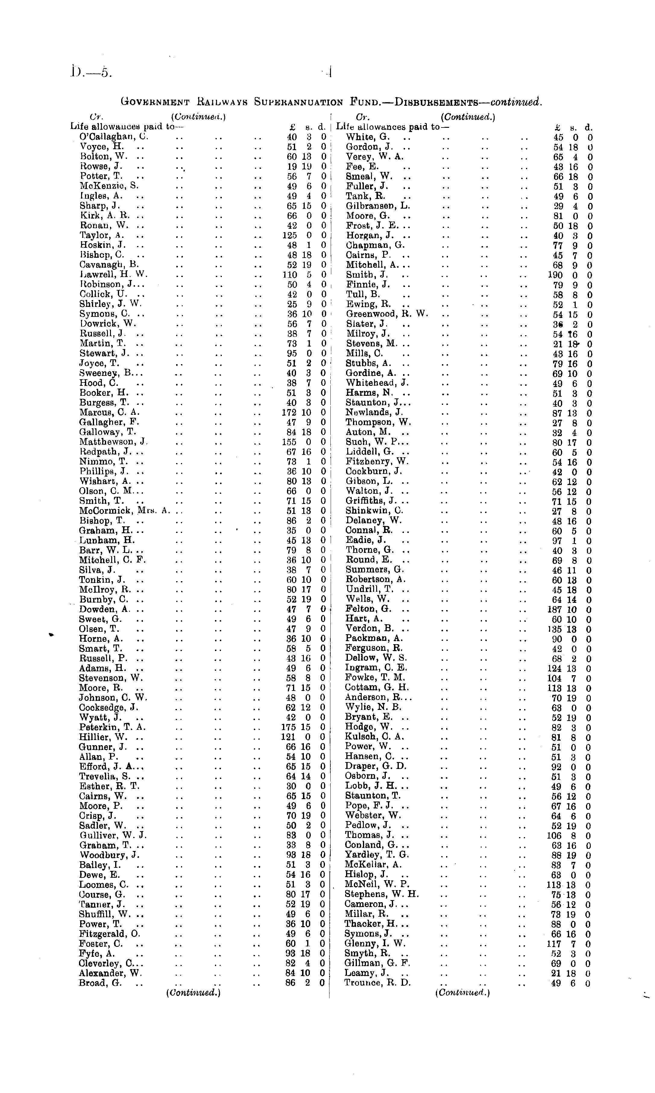 Government Railways Superannuation Fund.—Disbursements— continued. Cr. (Continued.) Cr. (Continued.) Life allowances paid to — £ s. d. . Life allowances paid to — £ s. d. O'Callaghan, C. .. .. .. 40 8 0 White, G. .. .. .. 45 0 0 Voyce, H. .. .. .. .. 51 2 0 ! Gordon, J. .. .. .. .. 54 18 0 Bolton, W. .. .. .. .. 60 13 0 Verey, W. A. .. .. .. 65 4 0 Rowse, J. .. .. .. .. 19 19 0 Fee, E. .. .. .. .. 43 16 0 Potter, T. .. .. .. .. 56 7 0 i Smeal, W. .. .. .. .. 66 18 0 MoKenzio, S. .. .. .. 49 6 0 Fuller, J. .. .. .. 51 3 0 Tngles, A. .. .. .. .. 49 4 0 Tank, R. .. .. .. .. 49 6 0 Sharp, J. .. .. .. .. 65 15 0 | Gilbransen, L. .. .. .. 29 4 0 Kirk, A. R. .. .. .. .. 66 0 0 Moore, G. .. .. .. .. 81 0 0 Rouan, W. .. .. .. .. IS 0 0 Frost, J. E... .. .. .. 50 18 0 Taylor, A. .. .. .. .. 125 0 0 Horgan, J. .. .. .. .. 40 3 0 Hoskin, J. .. .. .. .. 48 1 0 j Chapman, G. .. .. .. 77 9 0 Bishop, C. .. .. .. .. 48 18 0 i Cairns, P. .. .. .. .. 45 7 0 Cavanagh, B. .. .. .. 52 19 0 Mitchell, A. .. .. .. .. 68 9 0 Lawrell, H. W. .. .. .. 110 50 1 Smith, J. .. .. .. .. 190 0 0 Robinson, J... .. .. .. 50 4 0 Finnic, J. .. .. .. .. 79 9 0 Collick, U. .. .. .. .. 42 0 0 Tull, B. .. .. .. .. 58 8 0 Shirley, J. W. .. .. .. 25 9 0 l Swing, R. .. .. - .. .. 52 1 0 Symons, 0. .. .. .. .. 36 10 0 Greenwood, R. W. .. .. .. 54 15 0 Dowrick, W. .. .. .. 56 7 0 Slater, J. .. .. .. .. 36 2 0 Russell, J. .. .. .. .. 38 7 0 Milroy, J. .. .. .. .. 54 16 0 Martin, T. .. .. .. .. 73 1 0 Stevens, M. .. .. .. .. 21 18- 0 Stewart, J. .. .. .. .. 95 0 0 Mills, C. .. .. .. .. 43 16 0 Joyoe, T. .. .. .. .. 51 2 0 Stubbs, A. .. .. .. .. 79 16 0 Sweeney, 8... .. .. .. 40 3 0 Gordine, A. .. .. .. .. 69 10 0 Hood, C. .. .. .. .. 38 7 0 Whitehead, J. .. .. .. 49 6 0 Booker, H. .. .. .. .. 51 3 0 Harms, N. .. .. .. .. 51 3 0 Burgess, T. .. .. .. .. 40 3 0 Staunton, J... .. .. .. 40 3 0 Marcus, C. A. .. .. .. 172 10 0 Newlands, J. .. .. .. 87 13 0 Gallagher, F. .. .. .. 47 9 0 Thompson, W. .. .. .. 27 8 0 Galloway, T. .. .. .. 84 18 0 Auton, M. .. .. .. .. 32 4 0 Matthewson, J. .. .. .. 155 0 0 Suoh, W. P... .. .. .. 80 17 0 Redpath, J. .. .. .. .. 67 16 0 i Liddell, G. .. .. .. .. 60 5 0 Nimmo, T. .. .. .. .. 73 1 0 I Fitzhenry, W. .. .. .. 54 16 0 Phillips, J. .. .. .. .. 36 10 0 Cockburn, J. .. .. .. 42 0 0 Wishart, A. .. .. .. .. 80 13 0 Gibson, L. .. .. .. .. 62 12 0 Olson, CM... .. .. .. 66 0 0 | Walton, J. .. .. .. .. 56 12 0 Smith, T. .. .. .. .. 71 15 0 Griffiths, J. .. .. .. .. 71 15 0 MoCormick, Mrs. A. .. .. .. 51 13 0 I Shinkwin, C. .. .. .. 27 8 0 Bishop, T. .. .. .. .. 86 2 0 I Delanoy, W. .. .. .. 48 16 0 Graham, H. .. .. .. • 35 0 0 Connal, R. .. .. .. .. 60 5 0 Lunham, H. .. .. .. 45 13 0 I Eadie, J. .. .. .. .. 97 1 0 Barr, W. L. .. .. .. .. 79 8 0 Thome, G. .. .. .. .. 40 3 0 Mitchell, C. F. .. .. .. 36 10 0 I Round, E. .. .. .. .. 69 8 0 Silva, J. .. .. .. .. 38 7 0 Summers, G. .. .. .. 46 11 0 Tonkin, J. .. .. .. .. 60 10 0 Robertson, A. .. .. .. 60 13 0 Mcllroy, R. .. .. .. .. 80 17 0 i Undrill, T. .. .. .. .. 45 18 0 Burnby, C. .. .. .. .. 52 19 0 Wells, W. .. .. .. .. 64 14 0 Dowden, A. .. .. .. .. 47 7 0 Felton, G. .. .. .. .. 187 10 0 Sweet, G. .. .. .. .. 49 6 0 Hart, A. .. .. .. .. 60 10 0 Olsen, T. .. .. .. .. 47 9 0 Verdon, B. .. .. .. .. 135 13 0 * Home, A. .. .. 36 10 0 Packman, A. .. .. .. 90 0 0 Smart, T. .. .. .. .. 58 5 0 Ferguson, R. .. .. .. 42 0 0 Russell, P. .. .. .. .. 48 16 0 Dellow, W. S. .. .. .. 68 2 0 Adams, H. .. .. .. .. 49 6 0 Ingram, C. E. .. .. .. 124 13 0 Stevenson, W. .. .. .. 58 8 0 I Fowke, T. M. .. .. .. 104 7 0 Moore, R. .. .. .. .. 71 15 0 Cottam, G. H. .. .. .. 113 13 0 Johnson, C. W. .. .. .. 48 0 0 Anderson, R... .. .. .. 70 19 0 Cocksedge, J. .. .. .. 62 12 0 Wylie, N. B. .. .. .. 63 0 0 Wyatt, J. .. .. .. .. 42 0 0 Bryant, E. .. .. .. .. 52 19 0 Peterkin, T. A. .. .. .. 175 15 0 Hodge, W. .. .. .. .. 82 3 0 Hillier, W. .. .. .. .. 121 0 0 Kulsoh, C. A. .. .. .. 81 8 0 Gunner, J. .. .. .. .. 66 16 0 Power, W. .. .. .. .. 51 0 0 Allan, P. .. .. .. 54 10 0 Hansen, C. .. .. .. .. 51 3 0 Efford, J. A... .. .. .. 65 15 0 Diaper, G. D. .. .. .. 92 0 0 Trevella, S. .. .. .. .. 64 14 0 Osbom, J. .. .. .. .. 51 3 0 Esther, R. T. .. .. .. 30 0 0 Lobb, J. H. .. .. .. .. 49 6 0 Cairns, W. .. .. .. .. 65 15 0 Staunton, T. .. .. .. 56 12 0 Moore, P. .. .. .. .. 49 6 0 Pope, F. J. .. .. .. .. 67 16 0 Crisp, J. .. .. .. .. 70 19 0 Webster, W. .. .. .. 64 6 0 Sadler, W. .. .. .. .. 50 2 0 Pedlow, J. .. .. .. .. 52 19 0 Gulliver, W. J. .. .. .. 83 0 0 Thomas, J. .. .. .. .. 106 8 0 Graham, T. .. .. .. .. 33 8 0 Conland, G. .. .. .. .. 63 16 0 Woodbury, J. .. .. .. 93 18 0 Yardley, T. G. .. .. .. 88 19 0 Bailey, I. .. .. .. .. 51 3 o,' MoKellar, A. .. .. .. 83 7 0 Dewe, E. .. .. .. .. 54 16 0 Hislop, J. .. .. 63 0 0 Loomes, C. .. .. .. .. 51 3 0 . MoNeil, W. P. .. .. .. 113 13 0 Course, G. .. .. .. .. 80 17 0 Stephens, W. H. .. .. .. 75 13 0 Tanner, J. .. .. .. .. 52 19 0 Cameron, J... .. .. .. 56 12 0 Shuffill, W. .. .. .. .. 49 6 0 Millar, R. .. .. .. .. 73 19 0 Power, T. .. .. .. .. 36 10 0 Thaoker, H. .. .. .. .. 88 0 0 Fitzgerald, O. .. .. .. 49 6 0 Symons, J. .. .. .. .. 66 16 0 Foster, C. .. .. .. .. 60 1 0 Glenny, I. W. .. .. .. 117 7 0 Fyfo, A. .. .. .. .. 93 18 0 Smyth, R. .. .. .. .. 52 3 0 Cleverley, 0... .. .. ..- 82 4 0 Gillman, G. F. .. .. .. 69 0 0 Alexander, W. .. .. .. 84 10 0 Loamy, J. .. .. .. 21 18 0 Broad, G. .. .. .. .. 86 2 0 Trounoe, R. D. .. .. .. 49 6 0 (Continued.) (Continued.)