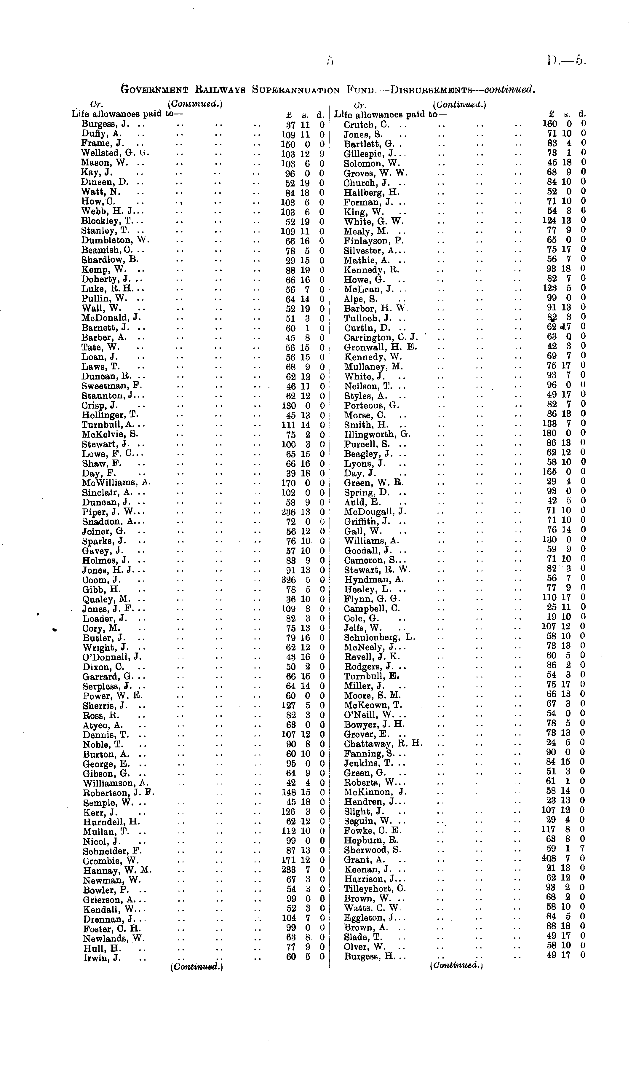 Government Railways Superannuation Fund. Disbursements— continued. Cr. (Continued.) o r . (Continued.) Life allowances paid to — £ s. d. | Life allowances paid to— £ s. d. Burgess, J. .. .. .. .. 37 11 0 Crutch, C. .. .. •• •• 160 0 0 Dufiy, A. .. .. .. 109 11 0 | Jones, S. .. .. • ■ • • 71 10 0 Frame, J. .. .. .. .. 150 0 0 Bartlett, G. . .. • • • • 83 4 0 Weltsted, G. U. .. .. .. 103 12 9 Gillespie, J. .. .. .. •• 78 1 0 Mason, W. .. .. .. .. 103 6 0 Solomon, W. •■ 45 18 0 Kay, J. .. .. .. .. 96 0 0 Groves, W. W. .. •• 68 9 0 Dineen, D. .. .. .. .. 52 19 0 Church, J. .. ... • ■ • ■ 84 10 0 Watt, N. .. .. .. .. 84 18 0 Hallberg, H. .. •• •• 52 0 0 How.C. ■■ •> •- •• 103 6 0 Forman, J. .. .. •• 71 10 0 Webb, H.J... .. .. .. 103 6 0 King, W. .. .. •• ■• 54 3 0 Blockley, T... .. .. .. 52 19 0 White, G. W. .. • • 124 18 0 Stanley, T. .. .. .. .. 109 11 0 | Mealy, M. .. .. .. •■ 77 9 0 Dumbleton, W. .. .. .. 66 16 0 , Finlayson, P. .. 65 0 0 Beamish, C. .. . • • • .. 78 5 0 Silvester, A... .. .. • • 75 17 0 Shardlow, B. .. .. .. 29 15 0 ! Mathie, A. .. .. .. . .. 56 7 0 Kemp, W. .. .. ■ • .. 88 19 0 Kennedy, R. .. • • • ■ 93 18 0 Doherty.J. .. •• •• 66 16 0 Howe, G. .. •• •• ■• 82 7 0 Luke, R. H. .. .. .. .. 56 7 0 McLean, J. .. .. ■ ■ • • 123 5 0 Purlin, W. .. • • • • ■ • 64 14 0 j Alpe, S. ■. • • ••99 0 0 Wall, W. .. •• •• .. 52 19 0 i Barbor, H. W .. .. 91 13 0 MoDonald, J. ■• ■■ .. 51 3 0 Tulloch, J. .. .. .. 652 3 0 Barnett, J. .. .. .. .. 60 1 0 Curtin, D. .. .. .. •■ 62 17 0 Barber, A. .. • • .. .. 45 8 0 Carrington, 0. J. ' .. .. • • 63 0 0 Tate, W. .. • ■ • • ■ • 56 15 0 Gronwall, H. E. .. .. .. 42 3 0 Loan, J. •• ■• ■• •• 56 15 0 Kennedy, W. .. .. .. 69 7 0 Laws, T. .. • • • • • • 68 9 0 ; Mullaney, M. .. .. •. 75 17 0 Duncan, R. - - • • • • ■ • 62 12 0 ! White, J. .. .. • • 93 7 0 Sweetman, F. .. .. •• . 46 11 0 Neilson, T. .. .. • • , • • 96 0 0 Staunton, J... ■• ■■ •■ 62 12 0 I Styles, A. .. .. •• ■• 49 17 0 Crisp, J. • ■ • • • ■ • • 130 0 0 Porteous, G. .. •. • • 82 7 0 Hollinger, T. .. .. .. 45 13 0 Morse, C. .. .. • • • • 86 13 0 Turnbull, A. .. .. .. .. 11l 14 0 Smith, H. .. .. .. • • 133 7 0 MoKelvie, S. .. • • • • 75 2 0 Illingworth, G. .. / • • ■ • 180 0 0 Stewart, J. . ■ • ■ • • • ■ 100 3 0 Puroell, S. .. ■ • ■ • • ■ 86 13 0 Lowe, F. 0... •• .. .. 65 15 0 Beagley, J. .. •• ■• •• 62 12 0 Shaw, F. • • ■ • ■ • 66 16 0 Lyons, J. .. .. .. • • 58 10 0 Day, F. ■ ■ • • ■ • • • 39 18 0 Day, J. .. ■ • • • • • 165 0 0 McWilliams, A. .. .. .. 170 0 0 Green, W. R. .. •• •■ 29 4 0 Sinclair, A. .. •• ■• .. 102 0 0 Spring, D. .. .. .. ■• 93 0 0 Dunoan, J. .. •• ■• ■• 58 9 0 Auld, E. .. ■• ■• •• 42 5 0 Piper, J. W... •• •• ■• 236 13 0 McDougall, J. .. •• 71 10 0 Snadaon, A... .. .. .. 72 0 0 Griffith, J. .. .. •■ •• 71 10 0 Joiner, G. . ■ • ■ • • ■ • 56 12 0 Gall, W. • • • • • • 76 14 0 Sparkß, J. . • • ■ 76 10 0 Williams, A. .. .. • ■ 130 0 0 Gavey, 3. .. ■■ ■■ 57 10 0 Goodall, J. .. •• ■• •• 59 9 0 Holmes, J. .. •• •• •■ 83 9 0 Cameron, 5... .. .. •• 71 10 0 Jones, H.J. .. •• •• .. 91 13 0 I Stewart, R. W. .. .. .. 82 3 0 Coom, J. • ■ • ■ 326 5 0 ■ Hyndman, A. .. .. .. 56 7 0 Gibb, H. .. • • ■ ■ • ■ 78 5 0 Healey, L. .. .. ■ • 77 9 0 Qualey, M. .. .. .. .. 36 10 0 Flynn, G. G. .. ■■ ■• 110 17 0 . Jones, J. F. . ■ ■ ■ • - 109 8 0 Campbell, C. .. •. 25 11 0 Loader, J. .. ■ • • • • • 82 3 0 Cole, G. .. • • ■ - • • 19 10 0 Cory, M. .. • • • • ■■75 13 0 Jelfs, W. .. .•• • ■ • 107 12 0 Butler, J. .. ■ • • ■ 79 16 0 Schulenberg, L. .. .. .. 58 10 0 Wright, J. .. .. ■• •■ 62 12 0 McNeely, J... •■ •• ■■ 73 13 0 O'Donnell, J. • ■ • • 43 16 0 Revell, J. K. •. 60 5 0 Dixon, C. . • • • • • • • 50 2 0 Rodgers, J. .. ■ ■ • ■ ■ • 86 2 0 Garrard, G... •• •• •• 66 16 0 Turnbull, E. .. .. 54 3 0 Serpless, J. .. ••■• • ■ 64 1.4 0 Miller, J. .. ■ • ■ • ■ ■ 75 17 0 Power, W. E. .. . • .. 60 0 0 Moore, S. M. .. • ■ ■ • 66 13 0 Sherns, J. .. •• ■• •• 127 5 0 MoKeown, T. .. .. 67 8 0 Ross, R. .. • • ■ • • • 82 3 0 O'Neill, W. .. .. .. • • 54 0 0 Atyeo, A. • • • • • • 63 0 0 Bowyer, J. H. .. •. 78 5 0 Dennis, T. .. • ■ • • .. 107 12 0 Grover, E. .. .. • • • • 73 13 0 Noble, T. .. ■ • • ■ • • 90 8 0 Chattaway, R. H. .. .. .. 24 5 0 Burton, A. .. .. ■ • . • 60 10 0 Fanning, S. .. .■• • ■ • 90 0 0 George, E. .. • • 95 0 0 Jenkins, T. .. .. • • • • 84 15 0 Gibson, G. .. ■ • • • 64 9 0 Green, G. .. . • ■ • • • 51 3 0 Williamson, A. .. 42 4 0 Roberts, W... .. ■• 61 1 0 Robertson, J. F. .. 148 15 0 McKinnon, J. .. 58 14 0 Semple, W. .. .. .. 45 18 0 : Hendren, J... .. 23 13 0 Kerr, J. .. 126 3 0 Slight, J. .. .. •■ ■• 107 12 0 Uurndell, H. .. .. .. 62 12 0 ; Sequin, W. .. .. • • 29 4 0 Mullan, T. .. .. .. .. 112 10 0 Fowke, C. E. .. .. •• 117 8 0 Nicol, J. . • • • • • • • 99 0 0 I Hepburn, R. .. • • • • 63 8 0 Schneider, F. .. .. .. 87 13 0 Sherwood, S. .. • • 59 1 7 Orombie, W. .. .. .. 171 12 0 I Grant, A. .. .. •■ •• 408 7 0 Hannay, W. M. .. .. 233 7 0 Keenan, J. .. .. •• •• 21 13 0 Newman, W. ■• •• .- 67 3 0 Harrison, J... .. .. •• 62 12 0 Bowler, P. .. • • ■ • • • 