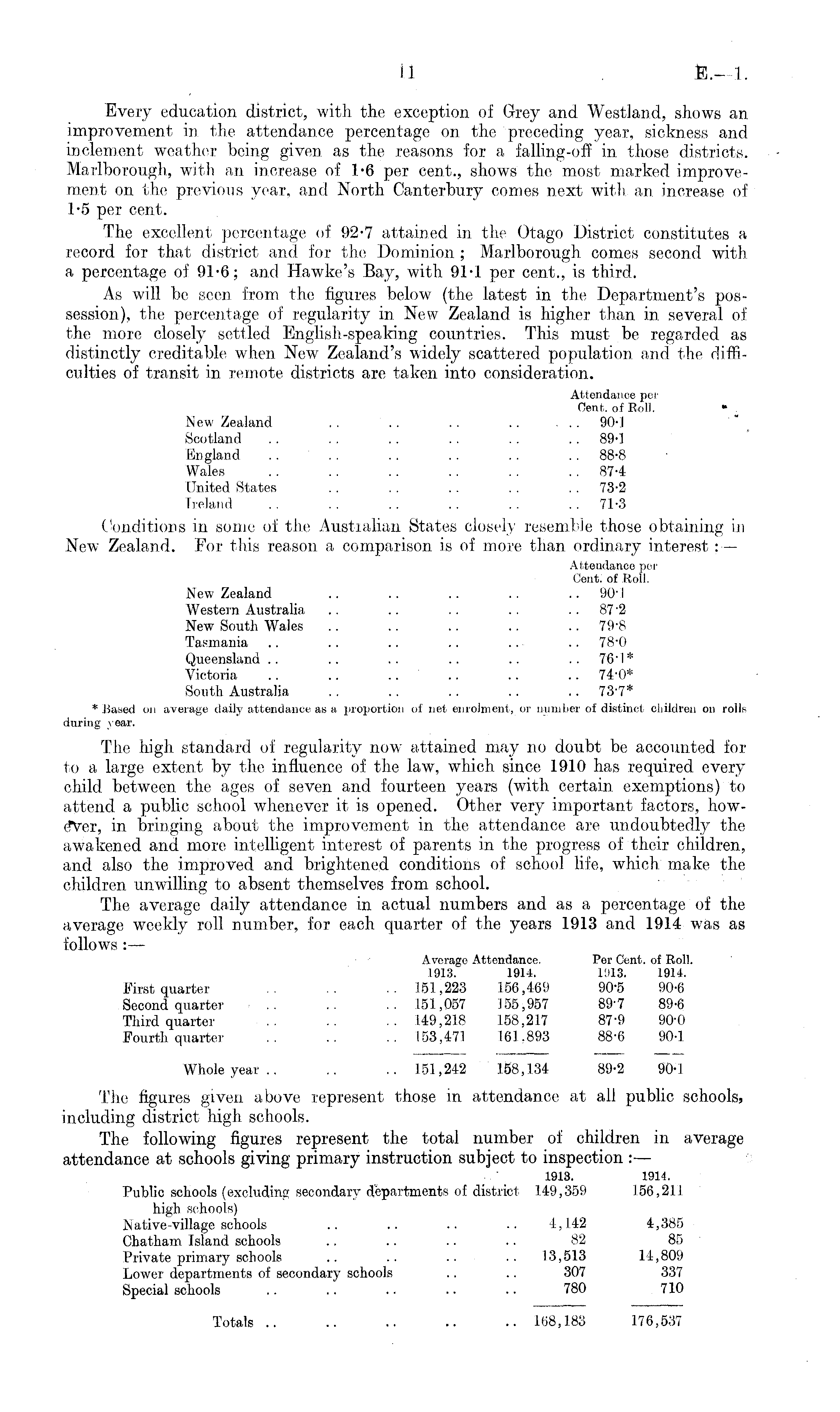 Every education district, with the exception of Grey and Westland, shows an improvement in the attendance percentage on the preceding year, sickness and inclement weather being given, as the reasons for a falling-off in. those districts. Marlborough, with an increase of I*6 per cent., shows the most marked improvement on the previous year, and North Canterbury comes next with an increase of I*s per cent. The excellent percentage of 92-7 attained in the Otago District constitutes a record for that district and for the Dominion ; Marlborough, comes second with a percentage of 91-6; and Hawke's Bay, with 91-1 per cent., is third. As will be seen from the figures below (the latest in the Department's possession), the percentage of regularity in New Zealand is higher than in. several of the more closely settled English-speaking countries. This must be regarded as distinctly creditable when New Zealand's widely scattered population and the difficulties of transit in remote districts are taken into consideration. Attendance per Cent, of Roll. New Zealand . . .. . . 90-1 Scotland .. .. .. .. .. .. 89-1 England .. ' .. .. .. .. .. 88-8 Wales .. .. .. .. .. .. 874 United States .. .. .. .. .. 73-2 Treknd .. .. .. . . . . . . 71-3 Conditions in some of the Australian States closely resemble those obtaining in New Zealand. For this reason a comparison is of more than ordinary interest : — Attendance por Cent, of Roll. New Zealand .. .. . . . . .. 90' I Western Australia .. .. .. .. 87"2 New South Wales .. .. .. .. .. 798 Tasmania .. .. .. .. .. .. 78-0 Queensland .. .. .. .. .. .. 76' I* Victoria .. .. ... .. .. .. 740* South Australia .. .. .. .. .. 73-7* * Baaed on average daily attendance as a proportion of net enrolment, or number of distinct children on rolls during year. The high standard of regularity now attained may no doubt be accounted for to a large extent by the influence of the law, which since 1910 has required every child between the ages of seven and fourteen years (with certain, exemptions) to attend a public school whenever it is opened. Other very important factors, howe*Ver, in bringing about the improvement in the attendance are undoubtedly the awakened and more intelligent interest of parents in the progress of their children, and also the improved and brightened conditions of school life, which make the children unwilling to absent themselves from school. The average daily attendance in actual numbers and as a percentage of the average weekly roll number, for each quarter of the years 1913 and 1914 was as follows : — Average Attendance. Per Cent, of Roll. 1913. 1914. 11113. 1914. First quarter .. .. .. .151,223 156,469 90"5 90-6 Second quarter >.. .. .. 151,057 155,957 897 89-6 Third quarter .. .. .. 149,218 158,217 87"9 900 Fourth quarter .. .. .. 153,471 161,893 88-6 90-1 Whole year.. ... .. 151,242 158,1.34 89-2 90-1 The figures given above represent those in attendance at all public schools, including district high schools. The following figures represent the total number of children in average attendance at schools giving primary instruction subject to inspection : — 1913. 1914. Public schools (excluding secondary departments of district 149,359 156,211 high schools) Native-village schools .. .. .. .. 4,142 4,385 Chatham Island schools .. .. .. .. 82 85 Private primary schools .. .. .. .. 13,513 14,809 Lower departments of secondary schools .. .. 307 337 Special schools .. .. .. .. .. 780 710 Totals .. .. .. .. .. 168,183 176,537