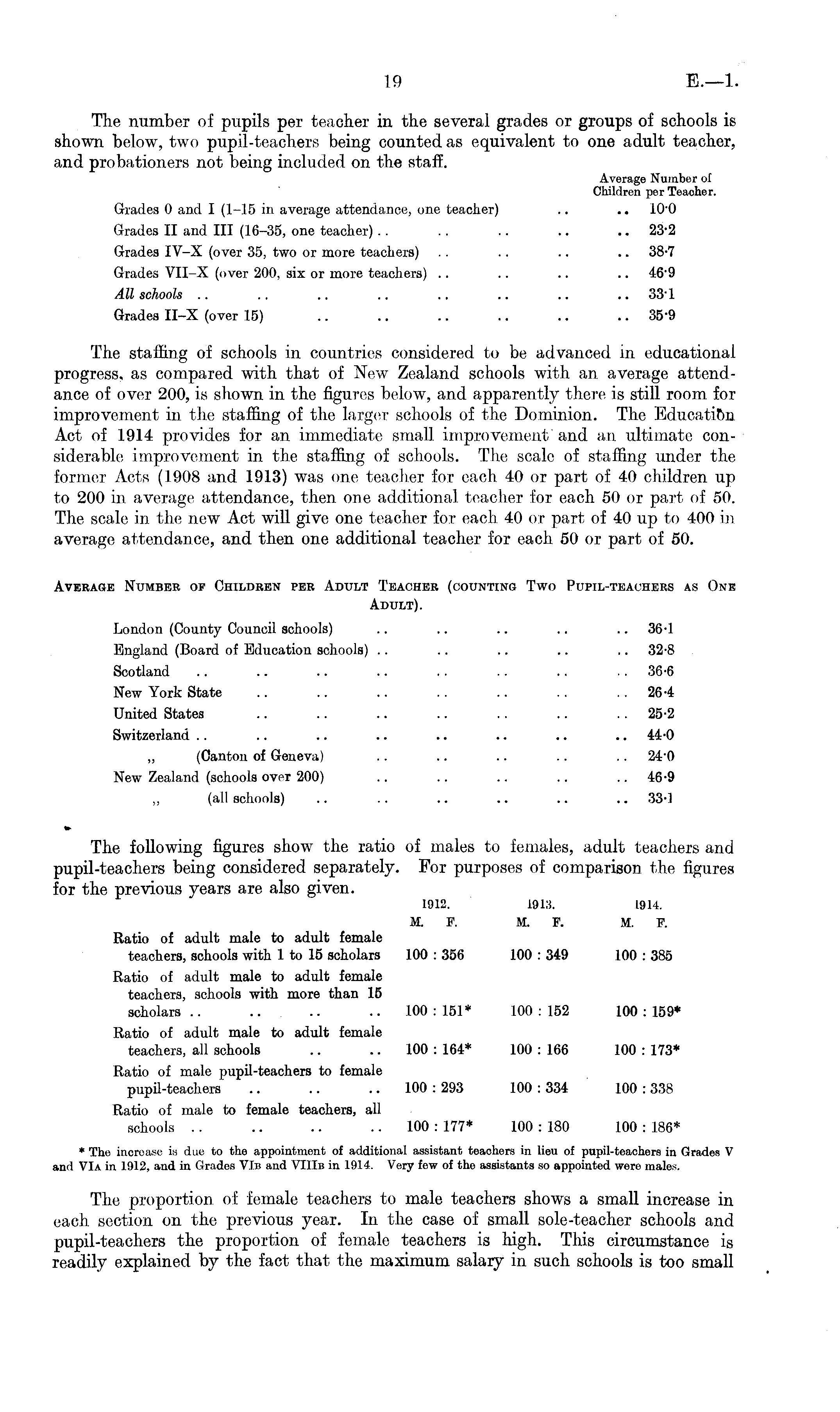 The number of pupils per teacher in the several grades or groups of schools is shown below, two pupil-teachers being counted as equivalent to one adult teacher, and probationers not being included on the staff. Average Number of Children per Teacher. Grades 0 and I (1-15 in average attendance, one teacher) .. .. 10 - 0 Grades II and 111 (16-35, one teacher).. .. .. .. 23-2 Grades IV-X (over 35, two or more teachers) .. .. .. .. 38-7 Grades VII-X (over 200, six or more teachers) .. .. .. .. 46 - 9 All schools .. .. .. .. .. .. .. .. 33T Grades 11-X (over 15) .. .. .. .. .. .. 35-9 The staffing of schools in countries considered to be advanced in educational progress, as compared with that of New Zealand schools with an average attendance of over 200, is shown in the figures below, and apparently there is still room for improvement in the staffing of the larger schools of the Dominion. The Education Act of 1914 provides for an immediate small improvement" and an ultimate considerable improvement in the staffing of schools. The scale of staffing under the former Acts (1908 and 1913) was one teacher for each 40 or part of 40 children up to 200 in average attendance, then one additional teacher for each 50 or part of 50. The scale in the new Act will give one teacher for each 40 or part of 40 up to 400 in average attendance, and then one additional teacher for each 50 or part of 50. Average Number op Children per Adult Teacher (counting Two Pupil-teachers as One Adult). London (County Council schools) .. .. .. .. 36-1 England (Board of Education schools) .. .. .. .. .. 32-8 Scotland .. .. .. .. .. .. .. .. 36-6 New York State .. .. .. .. .. .. .. 264 United States .. .. .. .. .. .. .. 25-2 Switzerland .. .. .. .. .. .. .. .. 44-0 „ (Canton of Geneva) .. .. .. .. .. 24"0 New Zealand (schools over 200) .. .. ... .. ..46-9 (all schools) .. .. .. .. .. .. 33-1 » The following figures show the ratio of males to females, adult teachers and pupil-teachers being considered separately. For purposes of comparison the figures for the previous years are also given. 1912. 1913. 1914. M. F. M. F. M. F. Ratio of adult male to adult female teachers, schools with Ito 15 scholars 100 : 356 100 : 349 100 : 385 Ratio of adult male to adult female teachers, schools with more than 15 scholars.. .. .. .. 100:151* 100:152 100:159* Ratio of adult male to adult female teachers, all schools .. .. 100 : 164* 100 : 166 100 : 173* Ratio of male pupil-teachers to female pupil-teachers .. .. .. 100 : 293 100 : 334 100 : 338 Ratio of male to female teachers, all schools .. .. .. .. 100 : 177* 100 : 180 100 : 186* * The increase is due to the appointment of additional assistant teaohers in lieu of pupil-teachers in Grades V and Vla in 1912, and in Grades Vlb and VIIIb in 1914. Very few of the assistants so appointed were males. The proportion of female teachers to male teachers shows a small increase in each section on the previous year. In the case of small sole-teacher schools and pupil-teachers the proportion of female teachers is high. This circumstance is readily explained by the fact that the maximum salary in such schools is too small