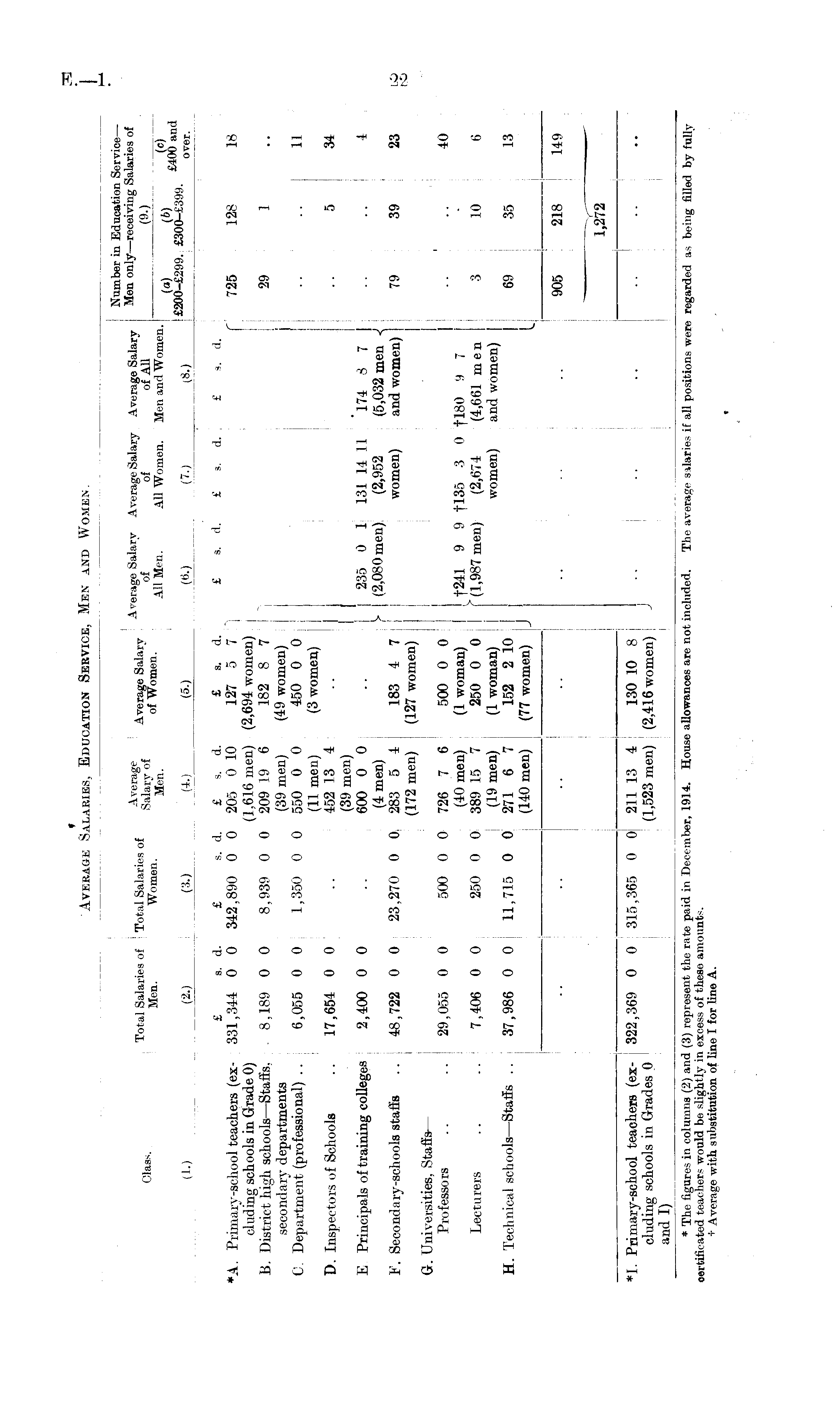 Class. Number in Education Service — i . ,.„ , . , _,,_, . , Average . a , Average Salarv Average Salary Average Salary Men only—receiving Salaries of Total Salaries of Total Salaries of Salarv g of Average Salary % f - 5 0 f m ' (9.) Men. Women. of Women. A ll Men. All Women. Men and Women. ~ TT j ~JeY^ ("> < 6) £400 and (2.) (30_ ' (_> (5J (60 (7.) (8.) £2O0-£299. | £300-£399. *^ i. . i i i i i i *A. Primary-school teachers (excluding schools in Grade 0) B. District high schools —Staffs. secondary departments C. Department (professional) .. D. Inspectors of Schools E Principals of training colleges ¥. Secondary-schools stafis G. Universities, Stafis — Professors Lecturers H. Technical schools —Stafis . . £ s. d. £ s. d. £ s. d. £ s. d. £ s. d. £ s. d. £ s. d. 331,344 0 0 342,890 0 0 205 0 10 127 5 7"] f 725 128 18 (1,616 men) (2,694 women) . 8,189 0 0 8,939 0 0 209 19 6 182 8 7 29 1 (39 men) (49 women) 6,055 0 0 1,350 0 0 550 0 0 450 0 0 .. .. 11 (11 men) (3 women) 17,654 0 0 .. 452 13 4 .. 5 34 (39 men) 2,400 0 0 .. 600 0 0 .. 235 0 1 131 14 11 174 8 7 .. .. i (4 men) y (2,080 men) (2,952 (5,032 men ■{ 48,722 0 0 23,270 0 0 283 5 4 183 4 7 women) and women) 79 39 23 (172 men) (127 women) 29.055 0 0 500 0 0 726 7 6 500 0 0 .. .. 40 (40 men) (1 woman) f241 9 9 fl35 3 0 fl80 9 7 7,406 0 0 250 0 0 389 15 7 250 0 0 f (1,987 men) (2,674 (4,661 men -3 10 6 (19 men) (1 woman) women) and women) 37,986 0 0 11,715 0 0 271 6 7 152 2 10 69 35 13 (140 men) (77 women) J 905 218 149 1 I 1,272 ! 1 1 *I. Primary-school teachers (ex- j 322,369 eluding schools in Grades 0 and I) 1 , ! i 0 0 315,365 0 OJ 211 13 4 130 10 8 (1,523 men) (2,416 women) j *I. Primary-school teachers (excluding schools in Grades 0 o.t,A T\ 322,369 0 0|315,365 0 0 21113 4 130 10 8 (1,523 men) (2,416 women) J * The figures in columns (2) and (3) represent the rate paid in December, 1914. House allowances are not included, oertificated teachers would be slightly in excess of these amounts. t Average with substitution of hne I for line A. The average salaries if all positions were regarded as being filled by fully *