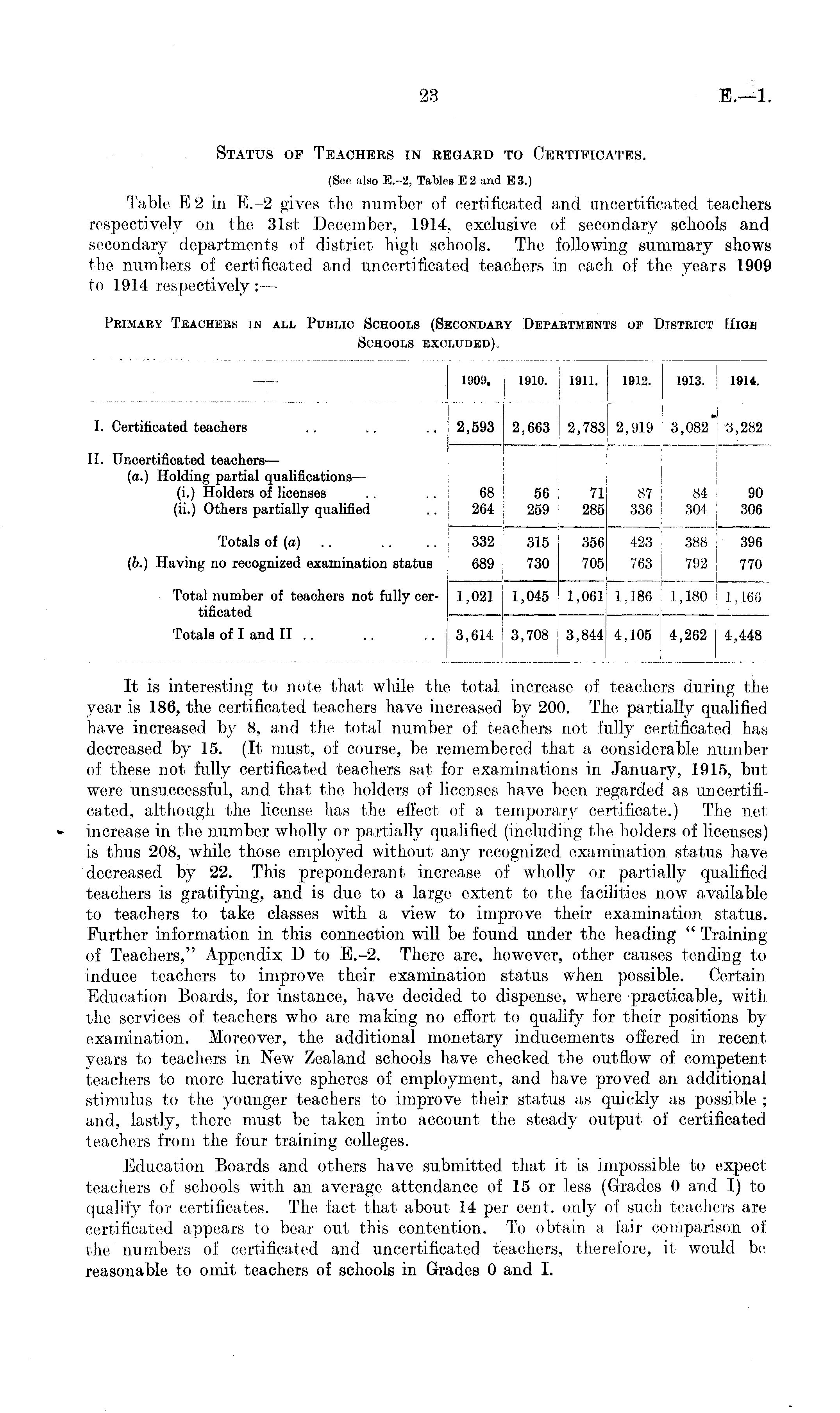 Status op Teachers in regard to Certificates. (See also E.-2, Tables E 2 and E3.) Table E 2 in E.-2 gives the number of certificated and uncertificated teachers respectively on the 31st December, 1914, exclusive of secondary schools and secondary departments of district high schools. The following summary shows the numbers of certificated and uncertificated teachers in each of the years 1909 to 1914 respectively :—-