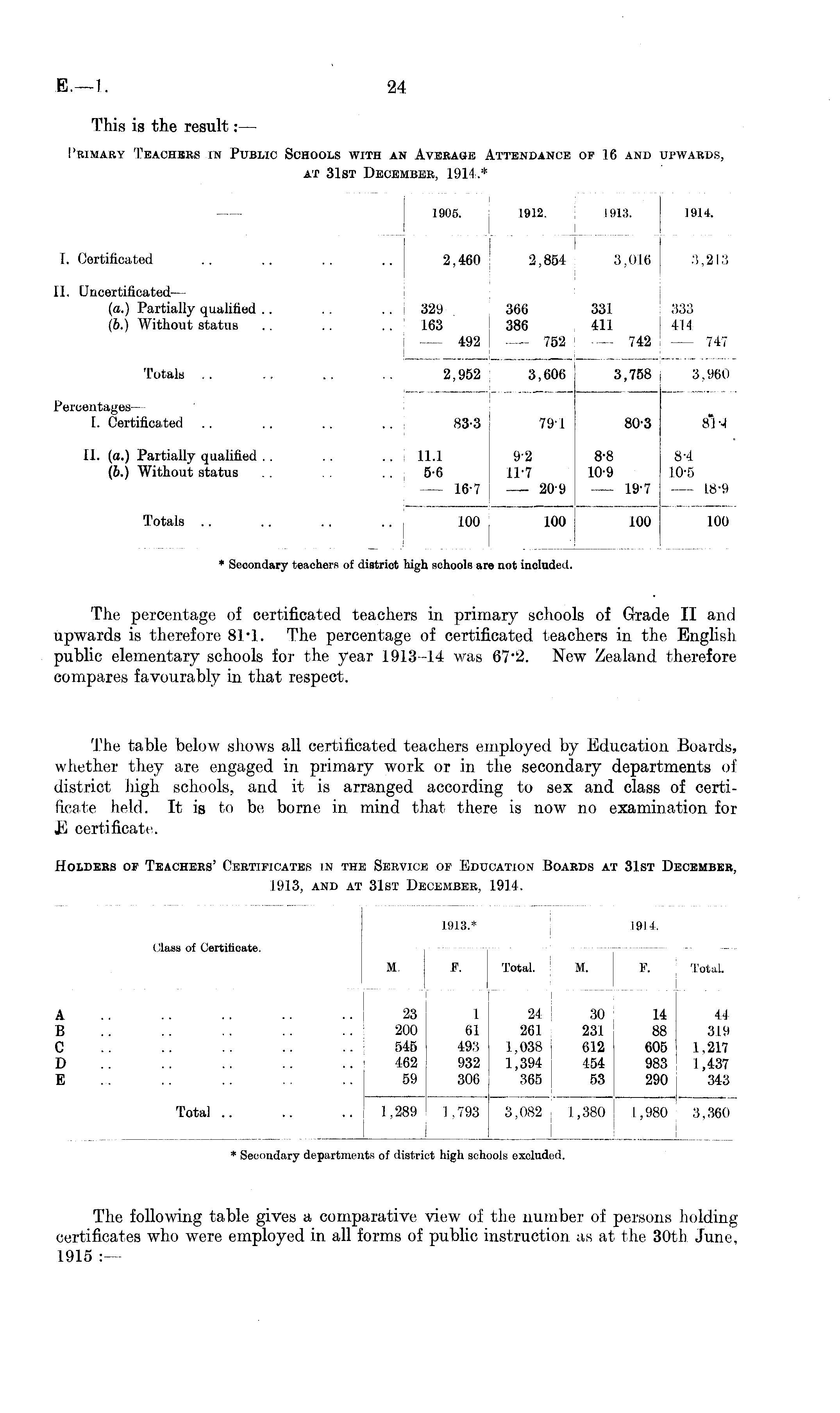 The percentage of certificated teachers in primary schools of Grade II and upwards is therefore 81*1. The percentage of certificated teachers in the English public elementary schools for the year 1913-14 was 67*2. New Zealand therefore compares favourably in that respect. The table below shows all certificated teachers employed by Education Boards, whether they are engaged in primary work or in the secondary departments of district high schools, and it is arranged according to sex and class of certificate held. It is to be borne in mind that there is now no examination for E certificate.