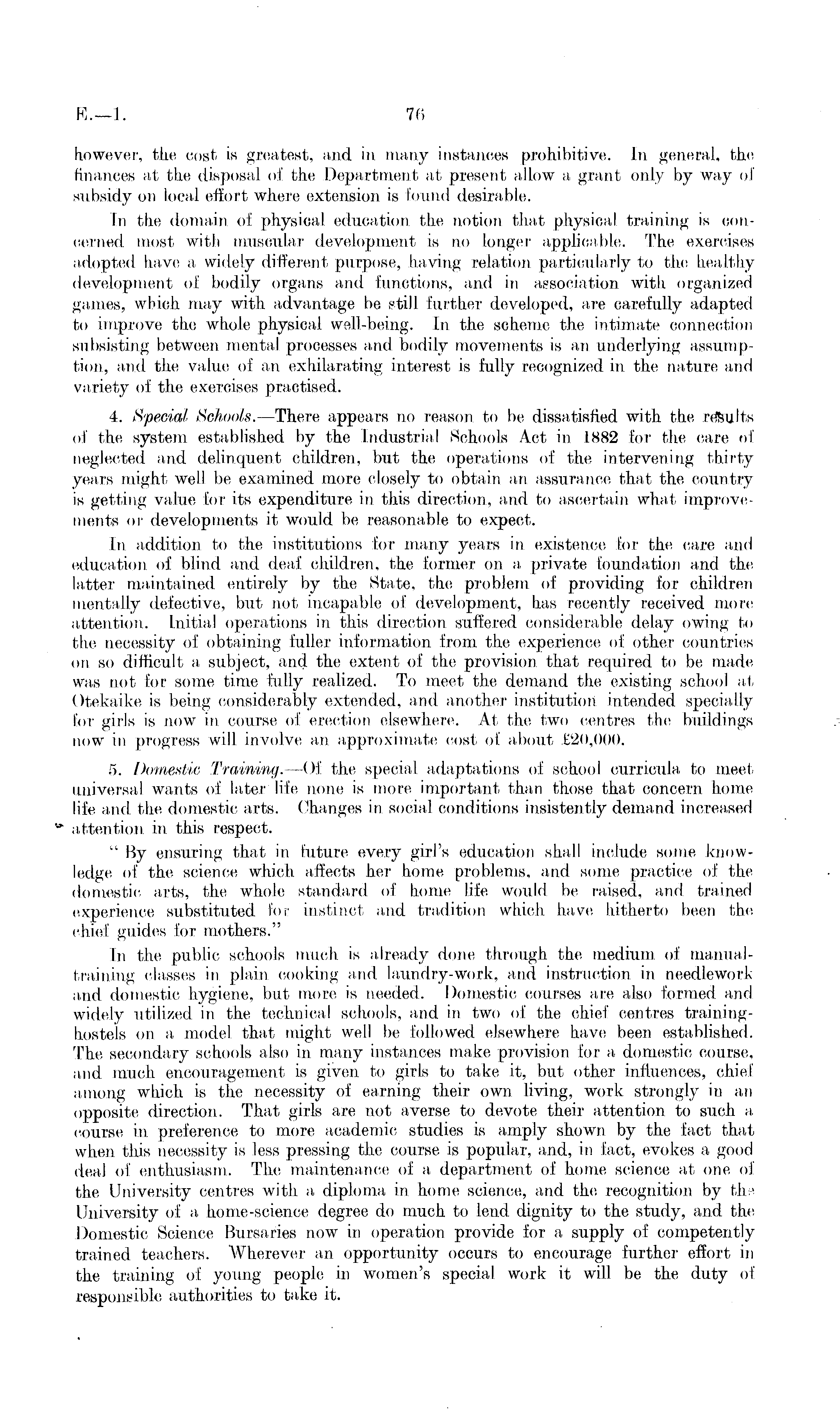 however, the cost is greatest, and in many instances prohibitive. In general, the finances at the disposal of the Department at present allow a grant only by way of subsidy on local effort where extension is found desirable. In the domain of physical education the notion that physical training is concerned most with muscular development is no longer applicable. The exercises adopted have a widely different purpose, having relation particularly to the healthy development of bodily organs and functions, and in association with organized games, which may with advantage be still further developed, are carefully adapted to improve the whole physical well-being. In the scheme the intimate connection subsisting between mental processes and bodily movements is an underlying assumption, and the value of an exhilarating interest is fully recognized in the nature and variety of the exercises practised. 4. Special Schools. —There appears no reason to be dissatisfied with the results of the system established by the Industrial Schools Act in 1882 for the care of neglected and delinquent children, but the operations of the intervening thirty years might well be examined more closely to obtain an assurance that the country is getting value for its expenditure in this direction, and to ascertain what improvements or developments it would be reasonable to expect. In addition to the institutions for many years in existence for the care and education of blind and deaf children, the former on a. private foundation and the latter maintained entirely by the State, the problem of providing for children mentally defective, but not incapable of development, has recently received mow; attention, initial operations in this direction suffered considerable delay owing to the necessity of obtaining fuller information from the experience of other countries on so difficult a subject, and the extent of the provision that required to be made was not for some time fully realized. To meet the demand the existing school at Otekaike is being considerably extended, and another institution intended specially for girls is now in course of erection elsewhere. At the two centres the buildings now in progress will involve an approximate cost of about £20,000. 5. Domestic Training. —Of the special adaptations of school curricula to meet universal wants of later life none is more important than those that concern home life and the domestic arts. Changes in social conditions insistently demand increased * attention in this respect. " By ensuring that in future every girl's education shall include some knowledge of the science which affects her home problems, and some practice of the domestic arts, the whole standard of home life would be raised, and trained experience substituted for instinct and tradition which have hitherto been the chief guides for mothers." In the public schools much is already done through the medium of manualtraining classes in plain cooking and laundry-work, and instruction in needlework and domestic hygiene, but more is needed. Domestic courses are also formed and widely utilized in the technical schools, and in two of the chief centres traininghostels on a model that might well be followed elsewhere have been established. The secondary schools also in many instances make provision for a domestic course, and much encouragement is given to girls to take it, but other influences, chief among which is the necessity of earning their own living, work strongly in an opposite direction. That girls are not averse to devote their attention to such a course in preference to more academic studies is amply shown by the fact that when this necessity is less pressing the course is popular, and, in fact, evokes a good deal of enthusiasm. The maintenance of a department of home science at one of the University centres with a diploma in home science, and the recognition by University of a home-science degree do much to lend dignity to the study, and the Domestic Science Bursaries now in operation provide for a supply of competently trained teachers. Wherever an opportunity occurs to encourage further effort in the training of young people in. women's special work it will be the duty of responsible authorities to take it.
