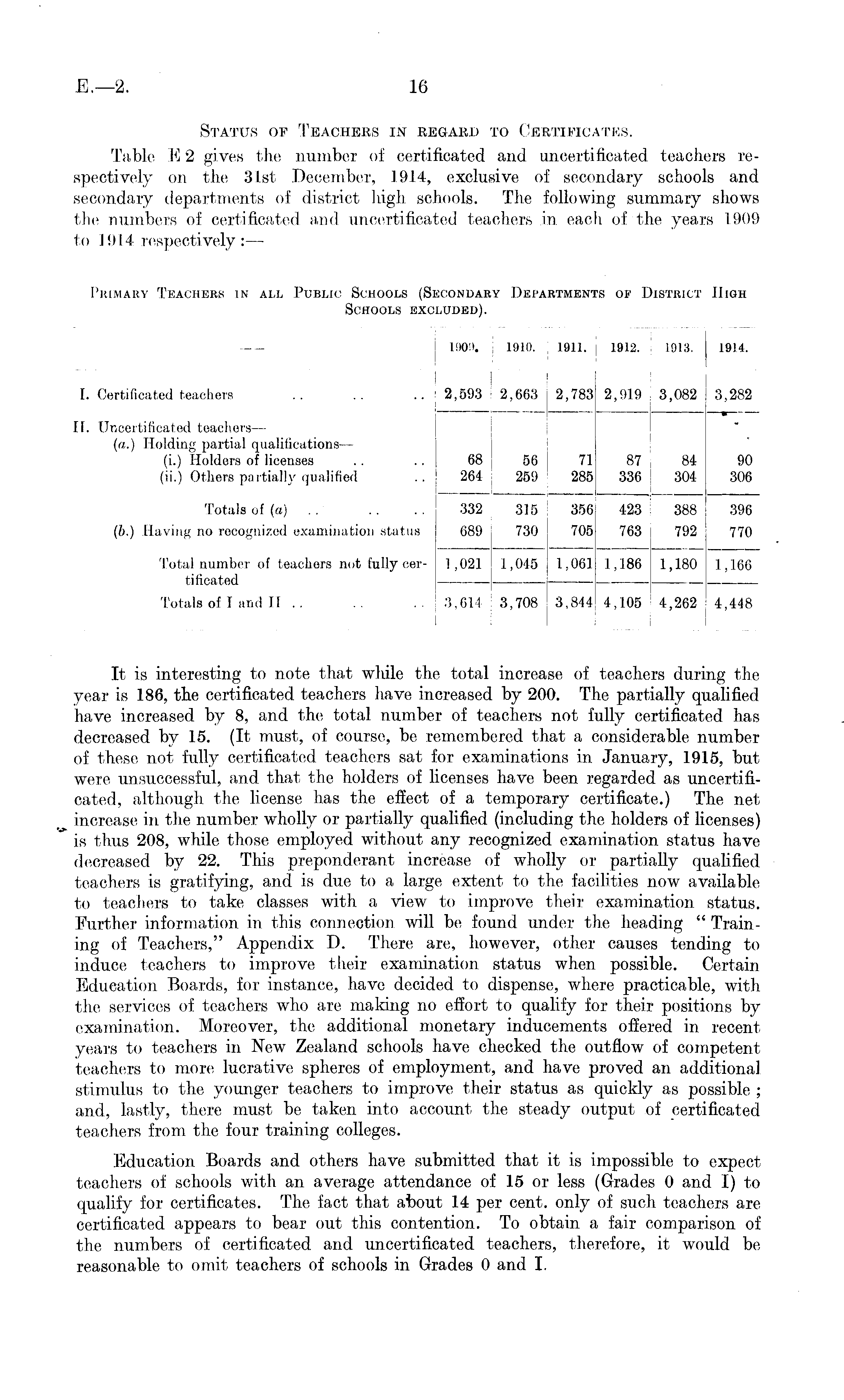 Status of Teachers in regard to Certificates. Table E 2 gives the number of certificated and uncertificated teachers respectively on the 31st December, 1914, exclusive of secondary schools and secondary departments of district high schools. The following summary shows the numbers of certificated and uncertificated teachers in. each of the years 1909 to 1914 respectively : —