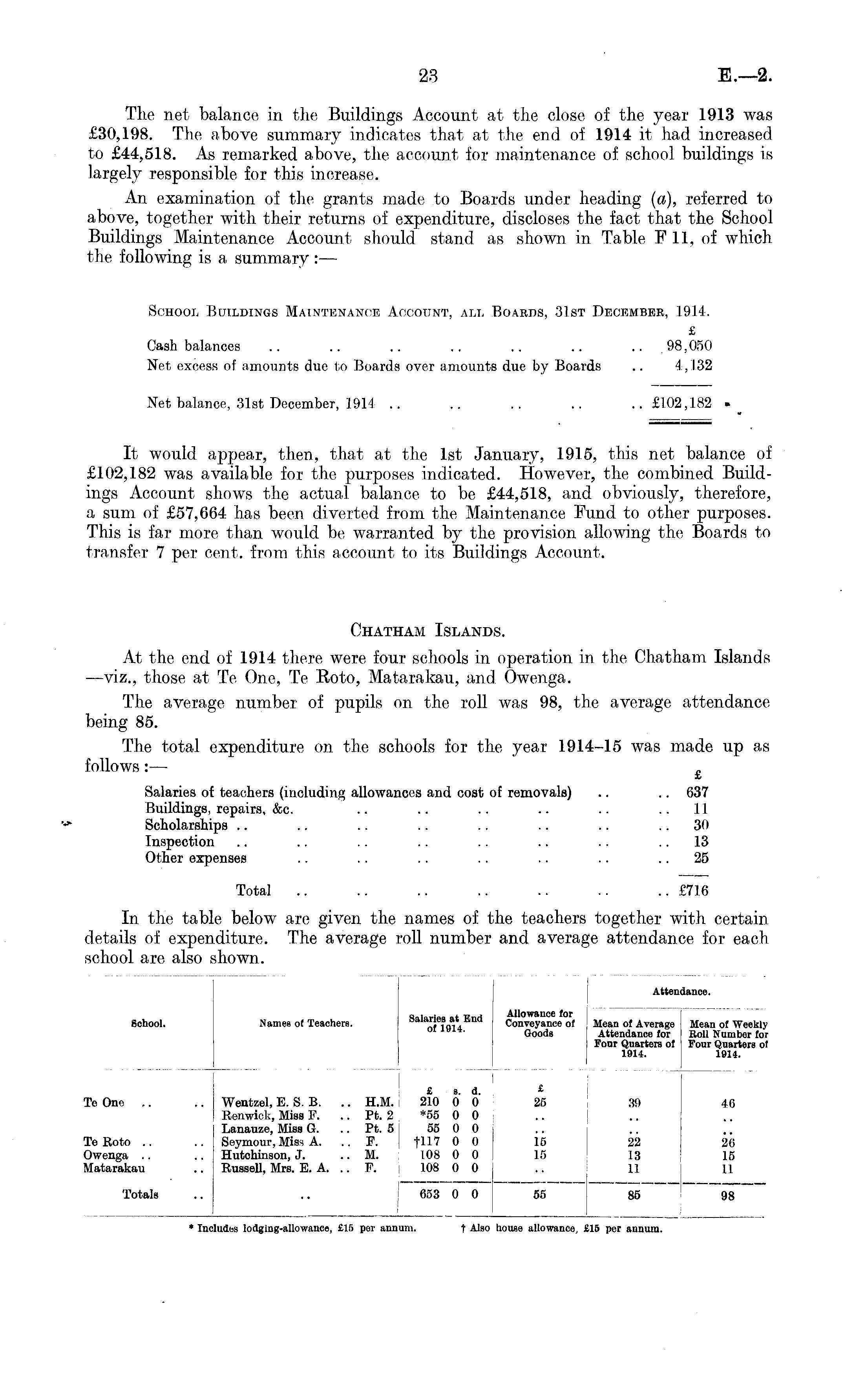 The net balance in the Buildings Account at the close of the year 1913 was £30,198. The above summary indicates that at the end of 1914 it had increased to £44,518. As remarked above, the account for maintenance of school buildings is largely responsible for this increase. An examination of the grants made to Boards under heading (a), referred to above, together with their returns of expenditure, discloses the fact that the School Buildings Maintenance Account should stand as shown in Table F 11, of which the following is a summary:— School Buildings Maintenance Account, all Boards, 31st December, 1914. £ Cash balances .. .. .. .. .. .. .. 98,050 Net excess of amounts due to Boards over amounts due by Boards .. 4,132 Net balance, 31st December, 1914 .. .. .. .. ..£102,182 - It would appear, then, that at the Ist January, 1915, this net balance of £102,182 was available for the purposes indicated. However, the combined Buildings Account shows the actual balance to be £44,518, and obviously, therefore, a sum of £57,664 has been diverted from the Maintenance Fund to other purposes. This is far more than would be warranted by the provision allowing the Boards to transfer 7 per cent, from this account to its Buildings Account. Chatham Islands. At the end of 1914 there were four schools in operation in the Chatham Islands —viz., those at Te One, Te Roto, Matarakau, and Owenga. The average number of pupils on the roll was 98, the average attendance being 85. The total expenditure on the schools for the year 1914-15 was made up as follows:— £ Salaries of teachers (including allowances and cost of removals) .. .. 637 Buildings, repairs, &c. .. .. .. .. .. 11 '-* Scholarships .. .. .. .. .. .. .. 30 Inspection .. .. .. .. .. .. .. 13 Other expenses .. .. .. .. .. .. 25 Total .. .. .. .. .. .. .. £716 In the table below are given the names of the teachers together with certain details of expenditure. The average roll number and average attendance for each school are also shown.