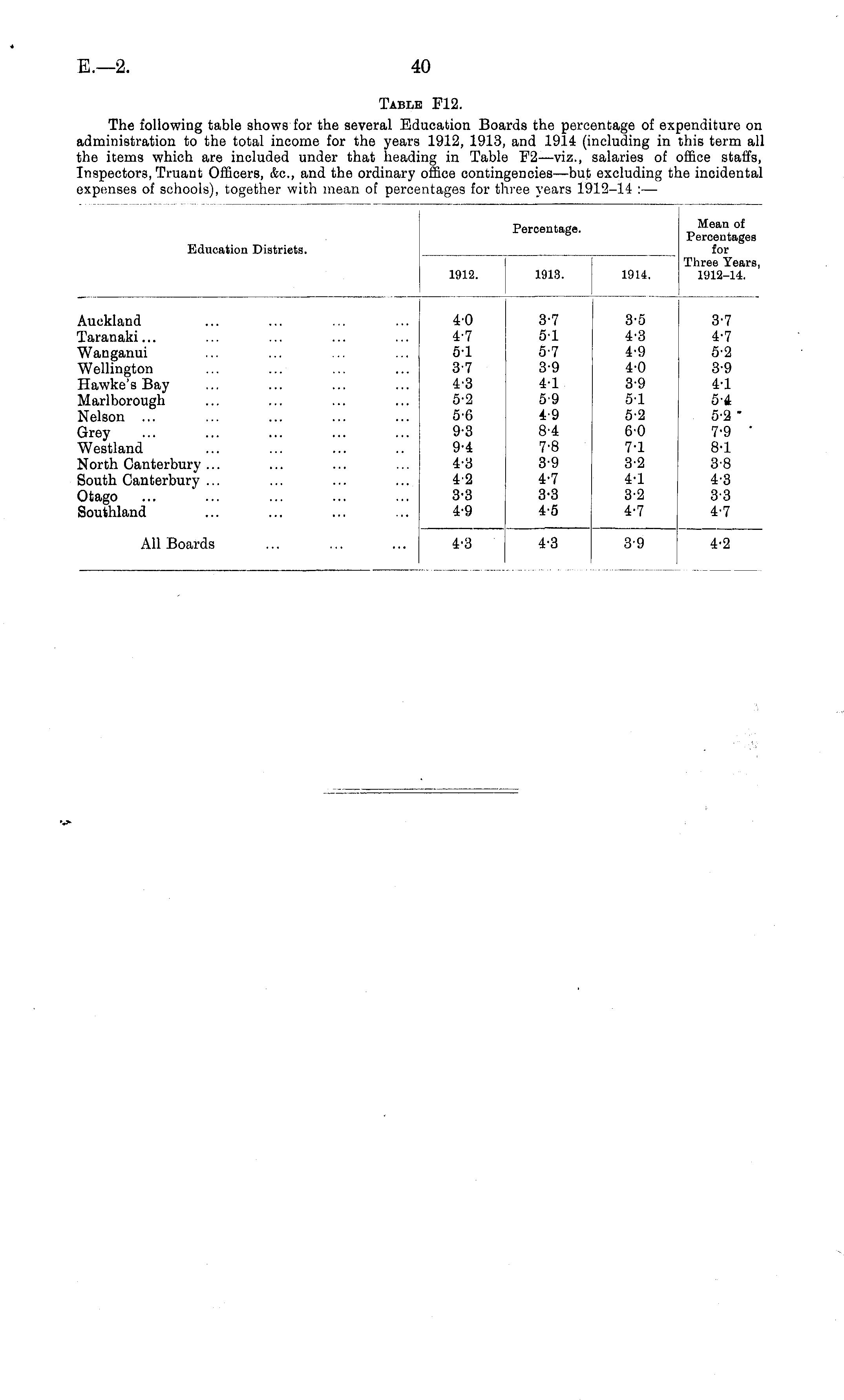 Education Districts. Percentage. Mean of Percentages for Three Years, 1912-14. 1912. 1913. 1914. Auckland Taranaki... Wanganui Wellington Hawke's Bay Marlborough Nelson ... Grey Westland North Canterbury ... South Canterbury ... Otago Southland 4-0 4-7 5-1 3-7 4-3 5-2 5-6 9-3 9-4 4-3 4-2 3-3 4-9 3-7 51 5-7 3-9 4-1 5-9 4-9 8-4 7-8 3-9 4-7 3-3 4-5 8-5 4-3 4-9 4-0 3-9 5-1 5-2 60 7-1 3-2 4-1 3-2 4-7 3-7 4-7 5-2 3-9 4-1 5-4 5-2" 7-9 8-1 3-8 4-3 33 4-7 All Boards 4-3 4-3 3-9 4-2