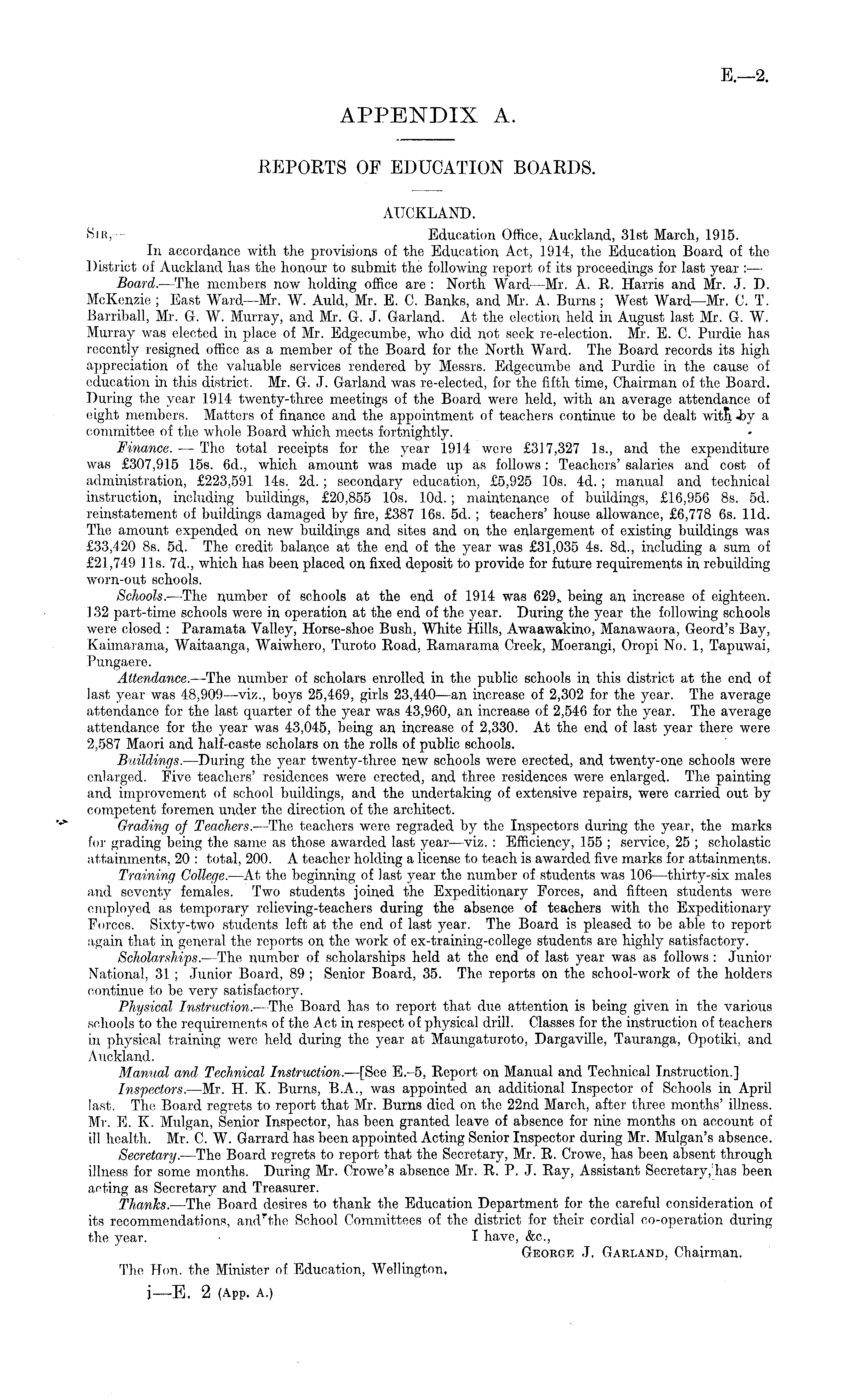 REPORTS OF EDUCATION BOARDS. AUCKLAND. Sir, Education Office, Auckland, 31st March, 1915. In accordance with the provisions of the Education Act, 1914, the Education Board of the District of Auckland has the honour to submit the following report of its proceedings for last year :— Board. —The members now holding office arc : North Ward —Mr. A. R. Harris and Mr. J. D. McKenzie ; East Ward—Mr. W. Auld, Mr. E. C. Banks, and Mr. A. Burns; West Ward—Mr. C. T. Barriball, Mr. G. W. Murray, and Mr. G. J. Garland. At the election held in August last Mr. G. W. Murray was elected in place of Mr. Edgecumbe, who did not seek re-election. Mr. E. C. Purdie has recently resigned office as a member of the Board for the North Ward. The Board records its high appreciation of the valuable services rendered by Messrs. Edgecumbe and Purdie in the cause of education in this district. Mr. G. J. Garland was re-elected, for the fifth time, Chairman of the Board. During the year 1914 twenty-three meetings of the Board were held, with an average attendance of eight members. Matters of finance and the appointment of teachers continue to be dealt witFi Jby a committee of the whole Board which meets fortnightly. Finance. — The total receipts for the year 1914 were £317,327 Is., and the expenditure was £307,915 15s. 6d., which amount was made up as follows: Teachers' salaries and cost of administration, £223,591. 14s. 2d.; secondary education, £5,925 10s. 4d. ; manual and technical instruction, including buildings, £20,855 10s. lOd. ; maintenance of buildings, £16,956 8s. 5d. reinstatement of buildings damaged by fire, £387 16s. 5d. ; teachers' house allowance, £6,778 6s. lid. The amount expended on new buildings and sites and on the enlargement of existing buildings was £33,420 8s. 5d. The credit balance at the end of the year was £31,035 4s. 8d., including a sum of £21,749 1 Is. 7d., which has been placed on fixed deposit to provide for future requirements in rebuilding worn-out schools. Schools. —The number of schools at the end of 1914 was 629,. being an increase of eighteen. ] 32 part-time schools were in operation at the end of the year. During the year the following schools were closed : Paramata Valley, Horse-shoe Bush, White Hills, Awaawakino, Manawaora, Geord's Bay, Kaimarama, Waitaanga, Waiwhero, Turoto Road, Ramarama Creek, Moerangi, Oropi No. 1, Tapuwai, Pungaere. Attendance. —The number of scholars enrolled in the public schools in this district at the end of last year was 48,909 —viz., boys 25,469, girls 23,440 —an increase of 2,302 for the year. The average attendance for the last quarter of the year was 43,960, an increase of 2,546 for the year. The average attendance for the year was 43,045, being an increase of 2,330. At the end of last year there were 2,587 Maori and half-caste scholars on the rolls of public schools. Buildings. —During the year twenty-three new schools were erected, and twenty-one schools were enlarged. Five teachers' residences were erected, and three residences were enlarged. The painting and improvement of school buildings, and the undertaking of extensive repairs, were carried, out by competent foremen under the direction of the architect. v * Grading of Teachers. —The teachers were regraded by the Inspectors during the year, the marks for grading being the same as those awarded last year—viz. : Efficiency, 155 ; service, 25 ; scholastic attainments, 20 : total, 200. A teacher holding a license to teach is awarded five marks for attainments. Training College. —At the beginning of last year the number of students was 106- -thirty-six males and seventy females. Two students joined the Expeditionary Forces, and fifteen students were employed as temporary relioving-teachers during the absence of teachers with the Expeditionary Forces. Sixty-two students left at the end of last year. The Board is pleased to be able to report again that in general the reports on the work of ex-training-college students are highly satisfactory. Scholarships. —The number of scholarships held at the end of last year was as follows : Junior National, 31 ; Junior Board, 89 ; Senior Board, 35. The reports on the school-work of the holders continue to be very satisfactory. Physical Instruction.—The Board has to report that due attention is being given in the various schools to the requirements of the Act in respect of physical drill. Classes for the instruction of teachers in physical training were held during the year at Maungaturoto, Dargaville, Tauranga, Opotiki, and Auckland. Manual and Technical Instruction. —[See E.-5, Report on Manual and Technical Instruction.] Inspectors. —Mr. H. K. Burns, B.A., was appointed an additional Inspector of Schools in April last. The Board regrets to report that Mr. Burns died on the 22nd March, after three months' illness. Mr. E. K. Mulgan, Senior Inspector, has been granted leave of absence for nine months on account of ill health. Mr. C. W. Garrard has been appointed Acting Senior Inspector during Mr. Mulgan's absence. Secretary. —The Board regrets to report that the Secretary, Mr. R. Crowe, has been absent through illness for some months. During Mr. Crowe's absence Mr. R. P. J. Ray, Assistant Secretary, 1 has been acting as Secretary and Treasurer. Thanks. —The Board desires to thank the Education Department for the careful consideration of its recommendations, and T the School Committees of the district for their cordial co-operation during the year. • T have, &c, Georotc J. Garland, Chairman. The Hon. the Minister of Education, Wellington,