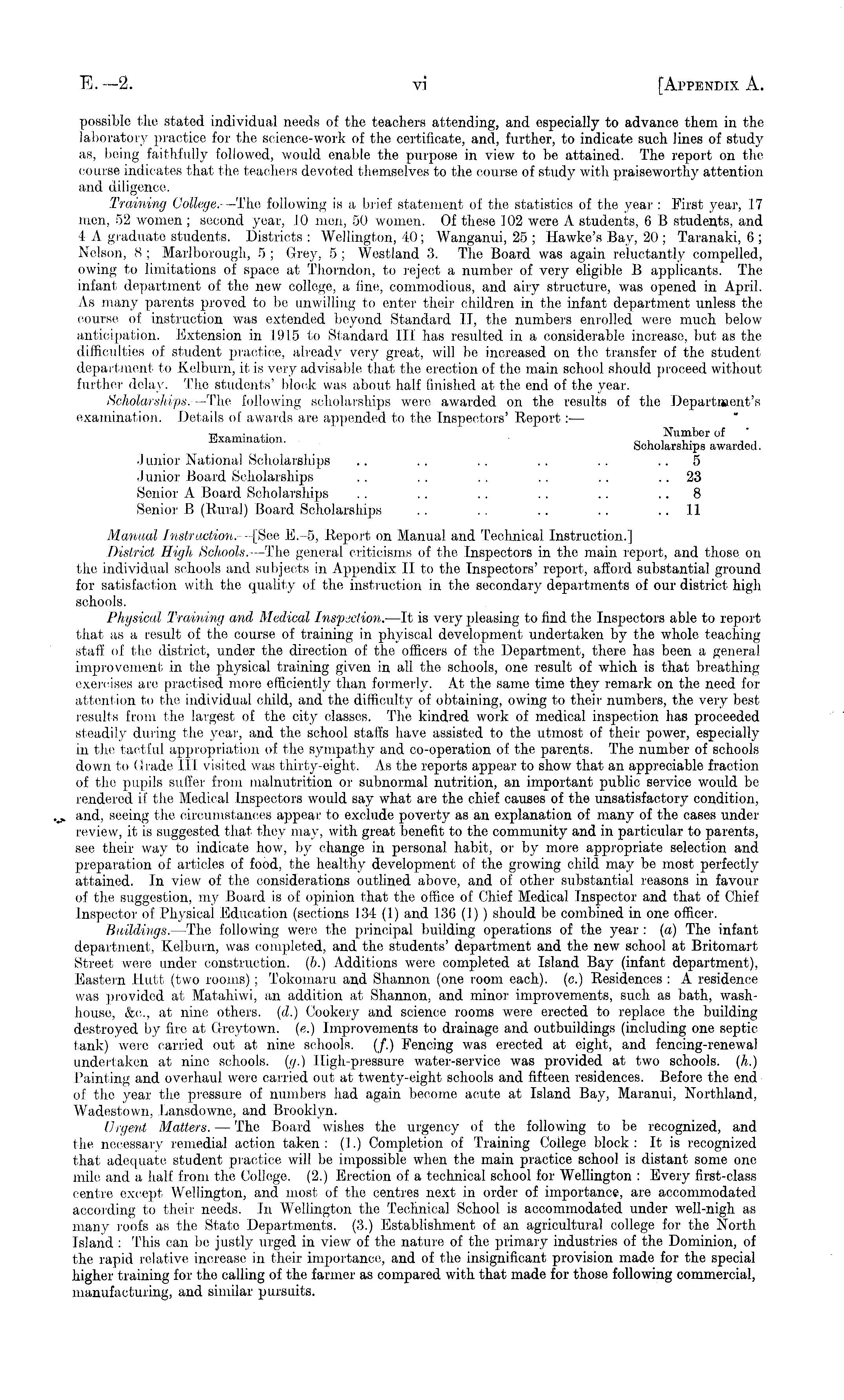 possible the stated individual needs of the teachers attending, and especially to advance them in the laboratory practice for the science-work of the certificate, and, further, to indicate such lines of study as, being faithfully followed, would enable the purpose in view to be attained. The report on the course indicates that the teachers devoted themselves to the course of study with praiseworthy attention and diligence. Training College. —The following is a brief statement of the statistics of the year : First year, 17 men, 52 women ; second year, .10 men, 50 women. Of these 102 were A students, 6 B students, and 4 A graduate students. Districts : Wellington, 40 ; Wanganui, 25 ; Hawke's Bay, 20 ; Taranaki, 6 ; Nelson, 8 ; Marlborough, 5 ; Grey, 5 ; Westland 3. The Board was again reluctantly compelled, owing to limitations of space at Thorndon, to reject a number of very eligible B applicants. The infant department of the new college, a fine, commodious, and airy structure, was opened in April. As many parents proved to be unwilling to enter their children in the infant department unless the course of instruction was extended beyond Standard 11, the numbers enrolled were much below anticipation. Extension in 1915 to Standard 111 has resulted in a considerable increase, but as the difficulties of student practice, already very great, will be increased on the transfer of the student department to Kelburn, it is very advisable that the erection of the main school should proceed without further delay. The students' block was about half finished at the end of the year. Scholarships. —The following scholarships were awarded on the results of the Department's examination. Details of awards are appended to the Inspectors' Report:— Examination. _ . Number of Scholarships awarded. •Junior National Scholarships .. .. .. .. .. ..5 Junior Board Scholarships . . .. .. .. . . 23 Senior A Board Scholarships .. .. .. . . .. .. 8 Senior B (Rural) Board Scholarships .. . . .. . . 11 Manual Instruction.--[See E.-5, Report on Manual and Technical Instruction.] District High Schools. —The general criticisms of the Inspectors in the main report, and those on the individual schools and subjects in Appendix II to the Inspectors' report, afford substantial ground for satisfaction with the quality of the instruction in the secondary departments of our district high schools. Physical Training and Medical Inspection. —lt is very pleasing to find the Inspectors able to report that as a result of the course of training in phyiscal development undertaken by the whole teaching staff of the district, under the direction of the officers of the Department, there has been a general improvement in the physical training given in all the schools, one result of which is that breathing exercises are practised more efficiently than formerly. At the same time they remark on the need for attention to the individual child, and the difficulty of obtaining, owing to their numbers, the very best results from the largest of the city classes. The kindred work of medical inspection has proceeded steadily during the year, and the school staffs have assisted to the utmost of their power, especially in the tactful appropriation of the sympathy and co-operation of the parents. The number of schools down to Grade 111 visited was thirty-eight. As the reports appear to show that an appreciable fraction of the pupils suffer from malnutrition or subnormal nutrition, an important public service would be rendered if the Medical Inspectors would say what are the chief causes of the unsatisfactory condition, .j. and, seeing the circumstances appear to exclude poverty as an explanation of many of the cases under review, it is suggested that they may, with great benefit to the community and in particular to parents, see their way to indicate how, by change in personal habit, or by more appropriate selection and preparation of articles of food, the healthy development of the growing child may bo most perfectly attained. In view of the considerations outlined above, and of other substantial reasons in favour of the suggestion, my Board is of opinion that the office of Chief Medical Inspector and that of Chief Inspector of Physical Education (sections 134 (1) and 136 (I)) should be combined in one officer. Buildings. —The following were the principal building operations of the year : (a) The infant department, Kelburn, was completed, and the students' department and the new school at Britomart Street were under construction. (6.) Additions were completed at Island Bay (infant department). Eastern Hutt (two rooms) ; Tokomaru and Shannon (one room each), (c.) Residences : A residence was provided at Matahiwi, an addition at Shannon, and minor improvements, such as bath, washhouse, &0., at nine others, (d.) Cookery and science rooms were erected to replace the building destroyed by fire at Greytown. (c.) Improvements to drainage and outbuildings (including one septic tank) were carried out at nine schools. (/.) Fencing was erected at eight, and fencing-renewal undertaken at nine schools, (g.) High-pressure water-service was provided at two schools, (h.) Painting and overhaul were carried out at twenty-eight schools and fifteen residences. Before the end of the year the pressure of numbers had again become acute at Island Bay, Maranui, Northland, Wadestown, Lansdownc, and Brooklyn. Urgent Matters. — The Board wishes the urgency of the following to be recognized, and the necessary remedial action taken: (I.) Completion of Training College block: It is recognized that adequate student practice will be impossible when the main practice school is distant some one mile and a half from the College. (2.) Erection of a technical school for Wellington : Every first-class centre except Wellington, and most of the centres next in order of importance, are accommodated according to their needs. In Wellington the Technical School is accommodated under wel