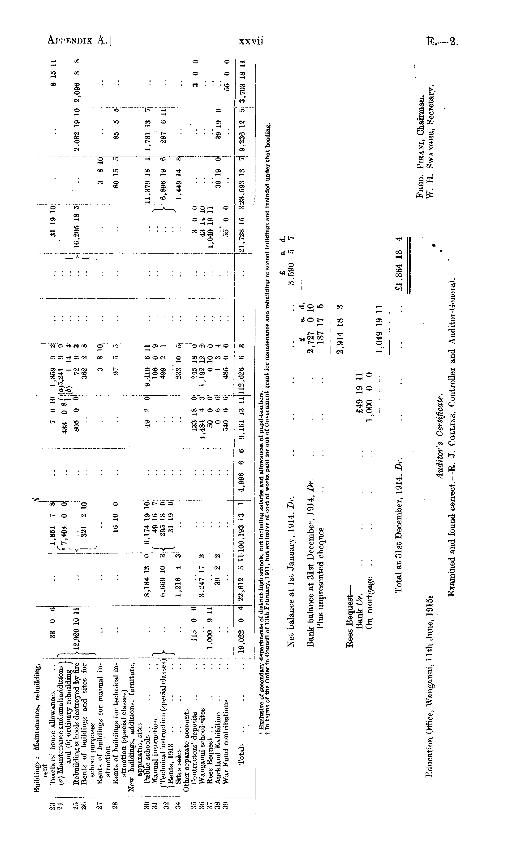£ s. d. Net balance at Ist January, 1914, Dr. .. .. .. .. .. 3,590 5 7 £ s. d. Bank balance at 31st December, 1914, Dr. .. .. 2,727 0 10 Plus unpresented cheques .. .. .. . . 187 17 5 2,914 18 3 Rees Bequest— Bank Cr. .. .. .. £49 19 11 On mortgage .. .. .. .. 1,000 0 0 1,049 19 11 Total at 31st December, 1914, Dr. .. .. .. .. £1,864 18 4 Feed. Pieani, Chairman. Education Office, Wanganui, 11th June, 1915 i t W. H. Swanger, Secretary. Auditor's Certificate. , Examined and found correct.— R. J. Controller and Auditor-General.
