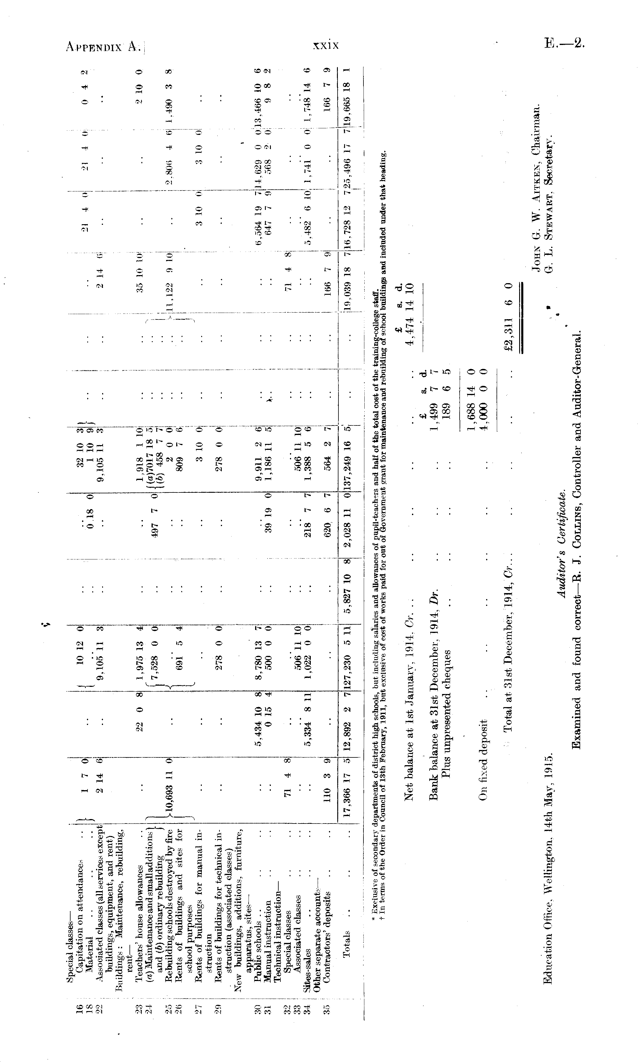 £ s. d. Net balance at Ist January, 1914, Or. .. .. .. .. .. . . 4,474 14 10 £ 8. d. Bank balance at 31st December, 1914, Dr. .. .. .. 1,499 7 7 Plus unpresented cheques .. . . .. . . 189 6 5 1,688 14 0 On fixed deposit .. . . . . .. .. .. 4,000 0 0 Total at 31st December, 1914, GV.. . .. .. .. .. £2,311 6 0 John (J. W. Aitken, Chairman. Education Office. Wellington. 14tli May, 1915. * G. L. Stewart. Secretary. Auditor's Certificate. Examined and found correct— E. -J. Collins, Controller and Auditor-General.
