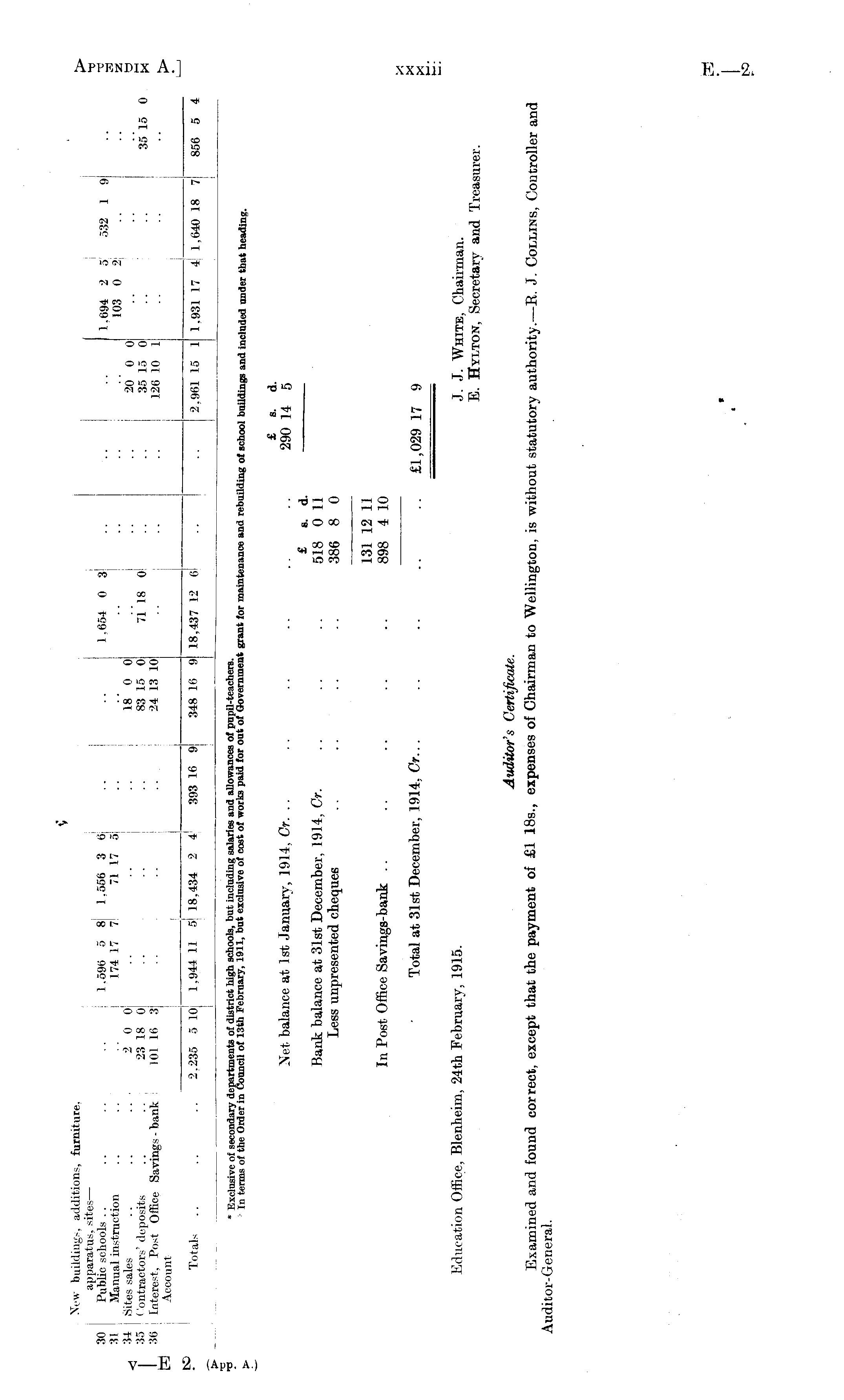 £ s. d. Net balance at. Ist January, 1914, Cr. .. .. .. .. .. .. 290 14 5 £ a. d. Bank balance at 31st December, 1914, Cr. .. .. .. 518 0 11 Less unpresented cheques .. .. .. .. 386 8 0 131 12 11 In Post Office Savings-bank .. .. .. .. .. 898 4 10 Total at 31st December, 1914, Cr.. . .. .. .. .. £1,029 17 9 Education Office, Blenheim, 24th February, 1915. J. J. White, Chairman. E. Hylton, Secretary and Treasurer. Auditor's Certificate. Examined and found correct, except that the payment of £1 18s., expenses of Chairman to Wellington, is without statutory authority.— R. J. Collins, Controller and Auditor-General.