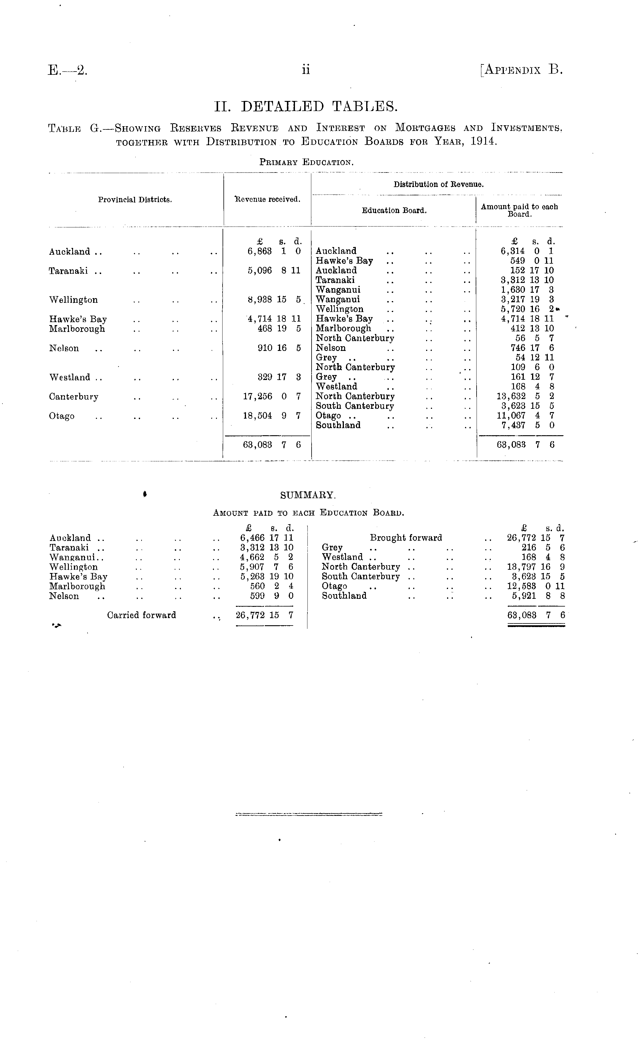 Primary I IUCATION. Provincial Districts. Revenue received. Distribution of Reveni ie. Amount paid to each Board. Education Board. Auckland £ s. d. 6,863 1 0 Auckland Hawke's Bay Auckland Taranaki Wanganui Wanganui Wellington Hawke's Bay Marlborough North Canterbury Nelson Grey North Canterbury Grey Westland North Canterbury South Canterbury Otago Southland £ s. d. 6,314 0 1 549 0 11 152 17 10 3,312 13 10 1,630 17 3 3,217 19 3 5,720 16 2« 4,714 18 11 412 13 10 56 5 7 746 17 6 54 12 11 109 6 0 161 12 7 168 4 8 13,632 5 2 3,623 15 5 11,067 4 7 7,437 5 0 Taranaki 5,096 8 11 Wellington 8,938 15 5. Hawke's Bay Marlborough 4,714 18 11 468 19 5 Nelson 910 16 5 Westland 329 17 3 Canterbury 17,256 0 7 Otago 18,504 9 7 63,083 7 6 63,083 7 6 63,083 7 6