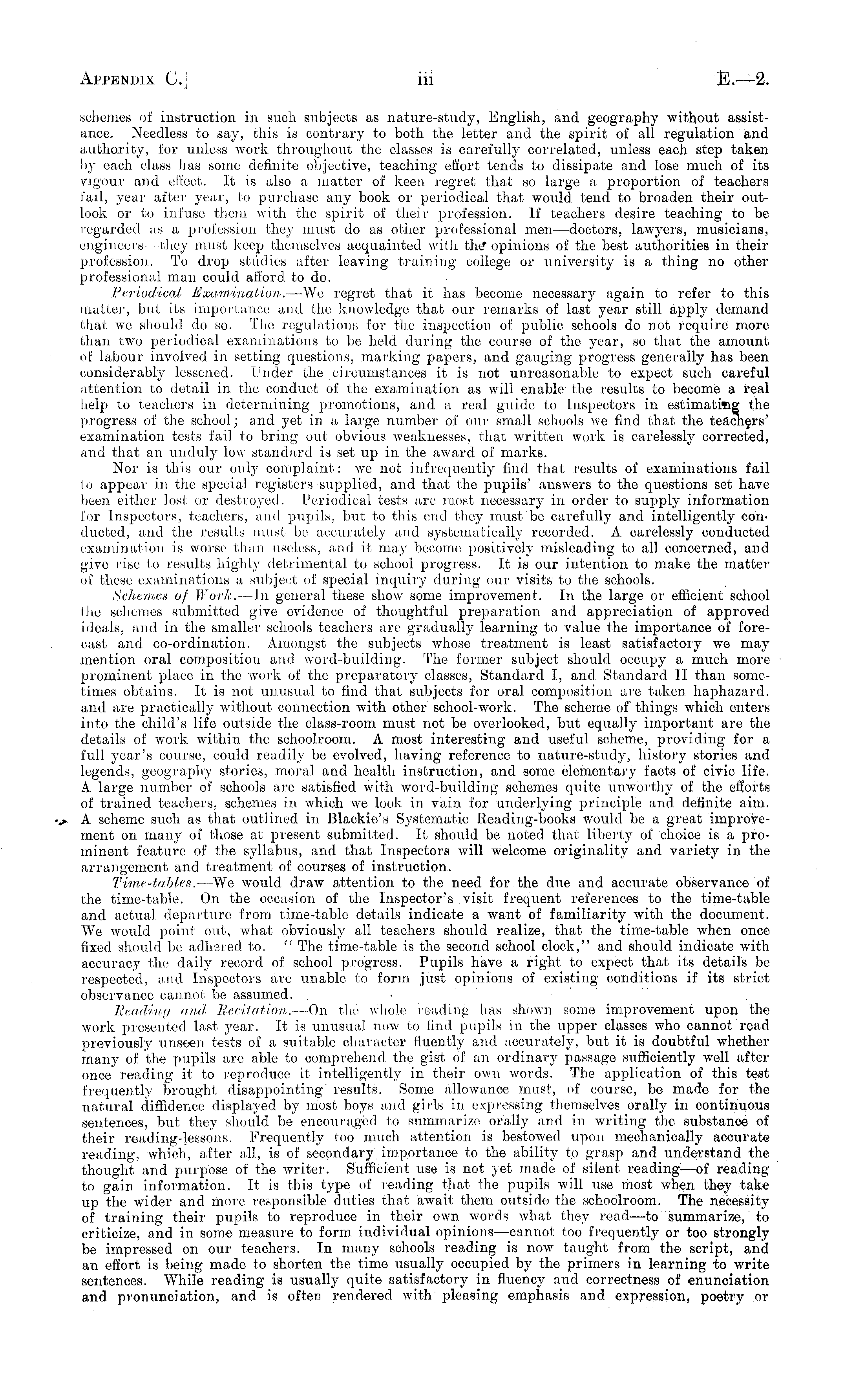 schemes of instruction in such subjects as nature-study, English, and geography without assistance. Needless to say, this is contrary to both the letter and the spirit of all regulation and authority, for unless work throughout the classes is carefully correlated, unless each step taken by each class has some definite objective, teaching effort tends to dissipate and lose much of its vigour and effect. It is also a matter of keen regret that so large a proportion of teachers fail, year after year, to purchase any book or periodical that would tend to broaden their outlook or to infuse them with the spirit of their profession. If teachers desire teaching to be regarded as a profession they must do as other professional men—doctors, lawyers, musicians, engineers—they must keep themselves acquainted with the* opinions of the best authorities in their profession. To drop studies after leaving training college or university is a thing no other professional man could afford to do. Periodical Examination. —We regret that it has become necessary again to refer to this matter, but its importance and the knowledge that our remarks of last year still apply demand that we should do so. The regulations for the inspection of public schools do not require more than two periodical examinations to be held during the course of the year, so that the amount of labour involved in setting questions, marking papers, and gauging progress generally has been considerably lessened. Under the circumstances it is not unreasonable to expect such careful attention to detail in the conduct of the examination as will enable the results to become a real help to teachers in determining promotions, and a real guide to Inspectors in estimating the progress of the school; and yet in a large number of our small schools we find that the teachers' examination tests fail to bring out obvious weaknesses, that written work is carelessly corrected, and that an unduly low standard is set up in the award of marks. Nor is this our only complaint: we not infrequently find that results of examinations fail to appear in the special registers supplied, and that the pupils' answers to the questions set have been either lost or destroyed. Periodical tests are most necessary in order to supply information for Inspectors, teachers, and pupils, but to this end they must be carefully and intelligently conducted, and the results must be accurately and systematically recorded. A. carelessly conducted examination is worse than useless, and it may become positively misleading to all concerned, and give rise to results highly detrimental to school progress. It is our intention to make the matter of these examinations a subject of special inquiry during our visits to the schools. Schemes of Work. —In general these show some improvement. In the large or efficient school the schemes submitted give evidence of thoughtful preparation and appreciation of approved ideals, and in the smaller schools teachers are gradually learning to value the importance of forecast and co-ordination. Amongst the subjects whose treatment is least satisfactory we may mention oral composition and word-building. The former subject should occupy a much more prominent place in the work of the preparatory classes, Standard I, and Standard II than sometimes obtains. It is not unusual to find that subjects for oral composition are taken haphazard, and are practically without connection with other school-work. The scheme of things which enters into the child's life outside the class-room must not be overlooked, but equally important are the details of work within the schoolroom. A most interesting and useful scheme, providing for a full year's course, could readily be evolved, having reference to nature-study, history stories and legends, geography stories, moral and health instruction, and some elementary facts of civic life. A large number of schools are satisfied with word-building schemes quite unworthy of the efforts of trained teachers, schemes in which we look in vain for underlying principle and definite aim. ■hh A scheme such as that outlined in Blackie's Systematic Reading-books would be a great improvement on many of those at present submitted. It should be noted that liberty of choice is a prominent feature of the syllabus, and that Inspectors will welcome originality and variety in the arrangement and treatment of courses of instruction. Time-tables. —We would draw attention to the need for the due and accurate observance of the time-table. On the occasion of the Inspector's visit frequent references to the time-table and actual departure, from time-table details indicate a want of familiarity with the document. We would point out, what obviously all teachers should realize, that the time-table when once fixed should be adhered to. " The time-table is the second school clock," and should indicate with accuracy the daily record of school progress. Pupils have a right to expect that its details be respected, and Inspectors are unable to form just opinions of existing conditions if its strict observance cannot be assumed. Beading and Recitation. —On the whole reading has shown some improvement upon the work presented last year. It is unusual now to find pupils in the upper classes who cannot read previously unseen tests of a suitable character fluently and accurately, but it is doubtful whether many of the pupils are able to comprehend the gist of an ordinary passage sufficiently well after once reading it to reproduce it intelligently in their own words. The application of this test frequently brought disappointing results. Some allowance must, of course, be made for the natural diffidence displayed by most boys and girls in expressing themselves orally in continuous sentences, but they should be encouraged to summarize orally and in writing the substance of their reading-lessons. Frequently too much attention is bestowed upon mechanically accurate reading, 