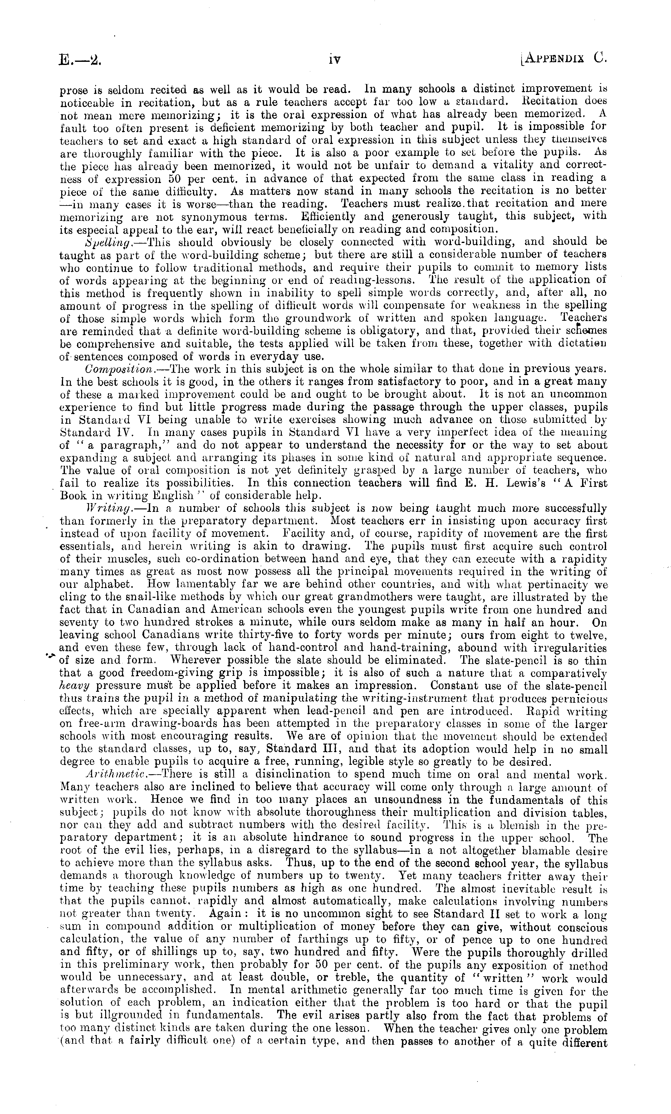prose is seldom recited as well as it would be read. In many schools a distinct improvement, is noticeable in recitation, but as a rule teachers accept far too low a standard. Recitation does not mean mere memorizing; it is the oral expression of what has already been memorized. A fault too often present is deficient memorizing by both teacher and pupil. It is impossible for teachers to set and exact a high standard of oral expression in this subject unless they themselves are thoroughly familiar with the piece. It is also a poor example to set before the pupils. As the piece has already been memorized, it would not be unfair to demand a vitality and correctness of expression 50 per cent, in advance of that expected from the same class in reading a piece of the same difficulty. As matters now stand in many schools the recitation is no better —in many cases it is worse —than the reading. Teachers must realize.that recitation and mere memorizing are not synonymous terms. Efficiently and generously taught, this subject, with its especial appeal to the ear, will react beneficially on reading and composition. Spelling. —This should obviously be closely connected with word-building, and should be taught as part of the word-building scheme; but there are still a considerable number of teachers who continue to follow traditional methods, and require their pupils to commit to memory lists of words appearing at the beginning or end of reading-lessons. The result of the application of this method is frequently shown in inability to spell simple words correctly, and, after all, no amount of progress in the spelling of difficult words will compensate for weakness in the spelling of those simple words which form the groundwork of written and spoken language. Teachers are reminded that a definite word-building scheme is obligatory, and that, provided their schemes be comprehensive and suitable, the tests applied will be taken from these, together with dictation of sentences composed of words in everyday use. Composition. —The work in this subject is on the whole similar to that done in previous years. In the best schools it is good, in the others it ranges from satisfactory to poor, and in a great many of these a marked improvement could be and ought to be brought about. It is not an uncommon experience to find but little progress made during the passage through the upper classes, pupils in Standard VI being unable to write exercises showing much advance on those submitted by Standard IV. In many cases pupils in Standard VI have a very imperfect idea of the meaning of " a paragraph," and do not appear to understand the necessity for or the way to set about expanding a subject and arranging its phases in some kind of natural and appropriate sequence. The value of oral composition is not yet definitely grasped by a large number of teachers, who fail to realize its possibilities. In this connection teachers will find E. H. Lewis's "A First Book in writing English " of considerable help. Writing. —ln a number of schools this subject is now being taught much more successfully than formerly in the preparatory department. Most teachers err in insisting upon accuracy first instead of upon facility of movement. Facility and, of course, rapidity of movement are the first essentials, and herein writing is akin to drawing. The pupils must first acquire such control of their muscles, such co-ordination between hand and eye, that they can execute with a rapidity many times as great as most now possess all the principal movements required in the writing of our alphabet. How lamentably far we are behind other countries, and with what pertinacity we cling to the snail-like methods by which our great grandmothers were taught, are illustrated by the fact that in Canadian and American schools even the youngest pupils write from one hundred and seventy to two hundred strokes a minute, while ours seldom make as many in half an hour. On leaving school Canadians write thirty-five to forty words per minute; ours from eight to twelve, and even these few, through lack of hand-control and hand-training, abound with irregularities **" of size and form. Wherever possible the slate should be eliminated. The slate-pencil is so thin that a good freedom-giving grip is impossible; it is also of such a nature that a comparatively heavy pressure must be applied before it makes an impression. Constant use of the slate-pencil thus trains the pupil in a method of manipulating the writing-instrument that produces pernicious effects, which are specially apparent when lead-pencil and pen are introduced. Rapid writing on free-arm drawing-boards has been attempted in the preparatory classes in some of the larger schools with most encouraging results. We are of opinion that the movement should be extended to the standard classes, up to, say, Standard 111, and that its adoption would help in no small degree to enable pupils to acquire a free, running, legible style so greatly to be desired. Arithmetic. —There is still a disinclination to spend much time on oral and mental work. Many teachers also are inclined to believe that accuracy will come only through a large amount of written work. Hence we find in too many places an unsoundness in the fundamentals of this subject; pupils do not know with absolute thoroughness their multiplication and division tables, nor can they add and subtract numbers with the desired facility. This is a blemish in the preparatory department; it is an absolute hindrance to sound progress in the upper school. The root of the evil lies, perhaps, in a disregard to the syllabus—in a not altogether blamable desire to achieve more than the syllabus asks. Thus, up to the end of the second school year, the syllabus demands a thorough knowdedge of numbers up to twenty. Yet many teachers fritter away their time by teaching these pupils numbers as high as one hundred. The almost inevitable result is that the pupils can