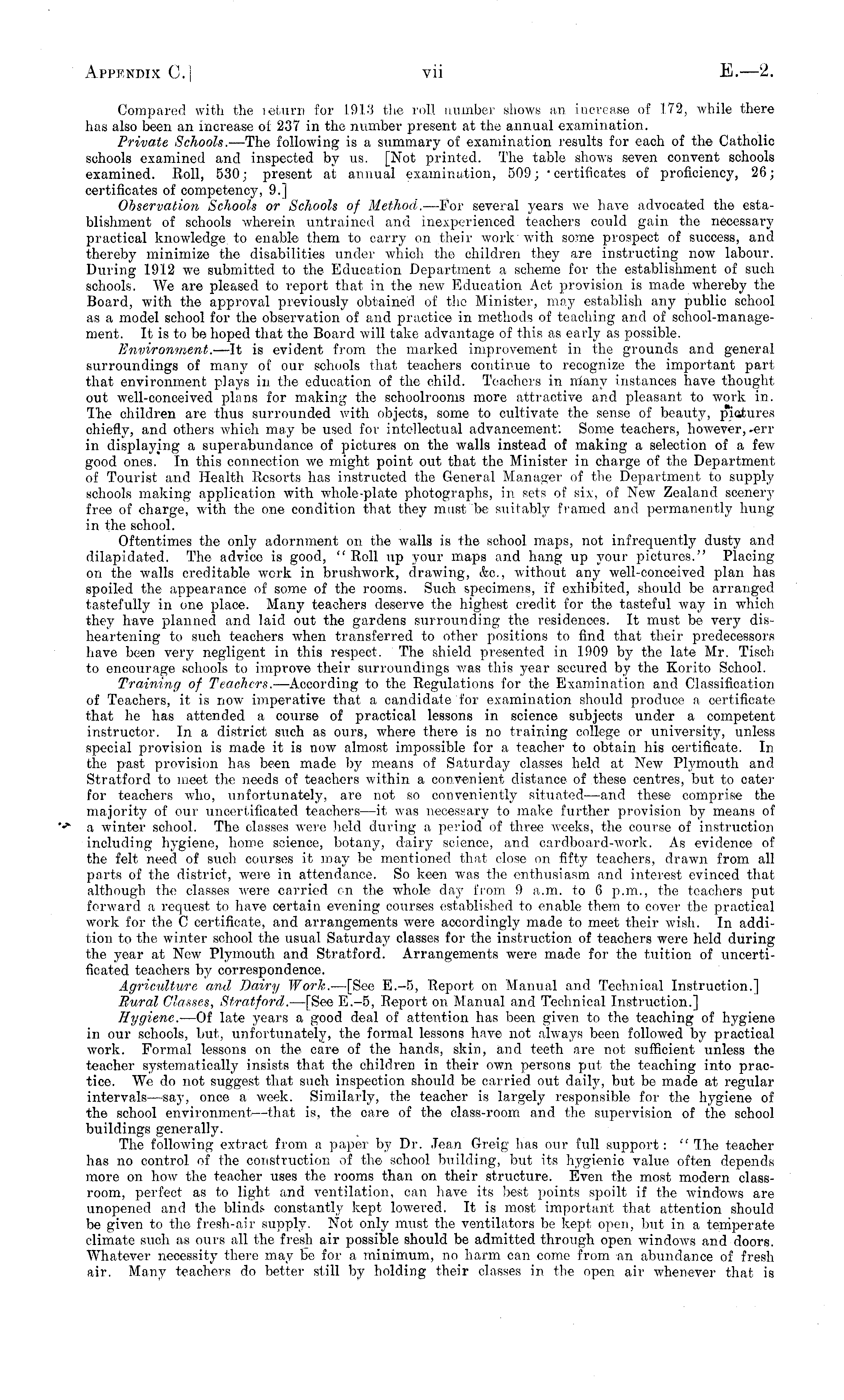 Compared with the return for 1913 the roll number shows an increase of 172, while there has also been an increase oi 237 in the number present at the annual examination. Private Schools. —The following is a summary of examination results for each of the Catholic schools examined and inspected by us. [Not printed. The table shows seven convent schools examined. Roll, 530; present at annual examination, 509; -certificates of proficiency, 26; certificates of competency, 9.] Observation Schools or Schools of Method. —For several years we have advocated the establishment of schools wherein untrained and inexperienced teachers could gain the necessary practical knowledge, to enable them to carry on their work with some prospect of success, and thereby minimize the disabilities under which the children they are instructing now labour. During 1912 we submitted to the Education Department a scheme for the establishment of such schools. We are pleased to report that in the new Education Act provision is made whereby the Board, with the approval previously obtained of the Minister, may establish any public school as a model school for the observation of and practice in methods of teaching and of school-manage-ment. It is to be hoped that the Board will take advantage of this as early as possible. Environment. —lt is evident from the marked improvement in the grounds and general surroundings of many of our schools that teachors continue to recognize the important part that environment plays in the education of the child. Teachers in iriany instances have thought out well-conceived plans for making the schoolrooms more attractive and pleasant to work in. Ike children are thus surrounded with objects, some to cultivate the sense of beauty, pictures chiefly, and others which may be used for intellectual advancement. Some teachers, however,-err in displaying a superabundance of pictures on the walls instead of making a selection of a few good ones. In this connection we might point out that the Minister in charge of the Department of Tourist and Health Resorts has instructed the General Manager of the Department to supply schools making application with whole-plate photographs, in sets of six, of New Zealand scenery free of charge, with the one condition that they must be suitably framed and permanently hung in the school. Oftentimes the only adornment on the walls is the school maps, not infrequently dusty and dilapidated. The advice is good, " Roll up your maps and hang up your pictures." Placing on the walls creditable work in brushwork, drawing, &c, without any well-conceived plan has spoiled the appearance of some of the rooms. Such specimens, if exhibited, should be arranged tastefully in one place. Many teachers deserve the highest credit for the tasteful way in which they have planned and laid out the gardens surrounding the residences. It must be very disheartening to such teachers when transferred to other positions to find that their predecessors have been very negligent in this respect. The shield presented in 1909 by the late Mr. Tisch to encourage schools to improve their surroundings was this year secured by the Korito School. Training of Teachers. —According to the Regulations for the Examination and Classification of Teachers, it is now imperative that a candidate for examination should produce a certificate that he has attended a course of practical lessons in science subjects under a competent instructor. In a district such as ours, where there is no training college or university, unless special provision is made it is now almost impossible for a teacher to obtain his certificate. In the past provision has been made by means of Saturday classes held at New Plymouth and Stratford to meet the needs of teachers within a convenient distance of these centres, but to cater for teachers who, unfortunately, are not so conveniently situated—and these comprise the majority of our uncertificated teachers —it was necessary to make further provision by means of '•* a winter school. The classes were held during a period of three weeks, the course of instruction including hygiene, home science, botany, dairy science, and cardboard-work. As evidence of the felt need of such courses it may be mentioned that close on fifty teachers, drawn from all parts of the district, were in attendance. So keen was the enthusiasm and interest evinced that although the classes were carried en the whole day from 9 a.m. to 6 p.m., the teachers put forward a request to have certain evening courses established to enable them to cover the practical work for the C certificate, and arrangements were accordingly made to meet their wish. In addition to the winter school the usual Saturday classes for the instruction of teachers were held during the year at New Plymouth and Stratford. Arrangements were made for the tuition of uncertificated, teachers by correspondence. Agriculture and Dairy Work. —[See E.-5, Report on Manual and Technical Instruction.] Rural Classes, Stratford. —[See E.-5, Report on Manual and Technical Instruction.] Hygiene. —Of late years a good deal of attention has been, given to the teaching of hygiene in our schools, but, unfortunately, the formal lessons have not always been followed by practical work. Formal lessons on the care of the hands, skin, and teeth are not sufficient unless the teacher systematically insists that the children in their own persons put the teaching into practice. We do not suggest that such inspection should be carried out daily, but be made at regular intervals —say, once a week. Similarly, the teacher is largely responsible for the hygiene of the school environment —that is, the care of the class-room and the supervision of the school buildings generally. The following extract from a paper by Dr. Jean Greig has our full support: "The teacher has no control of the construction of the school building, but its hygienic value often depends more on how the 