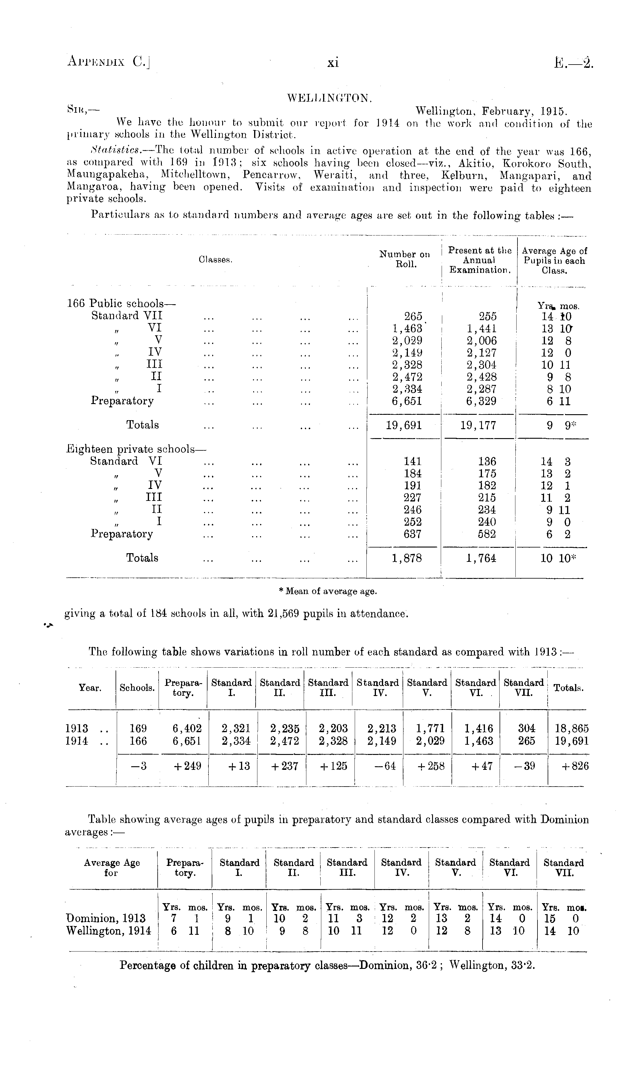 WELLINGTON. Sir,— Wellington, February, 1915. We have the honour to submit our report for 1914 on the work and condition of the primary schools in the Wellington District. Statistics. —The total number of schools in active operation at the end of the year was 166, as compared with 169 in 1913; six schools having been closed —vi/.., Akitio, Korokoro South, Maungapakeha, Mitehelltown, Pencarrow, Weraiti, and. three, Kelburn, Mangapari, and Mangaroa, having been opened. Visits of examination and inspection were paid to eighteen private schools. Particulars as to standard numbers and average ages are set out in the following tables :—