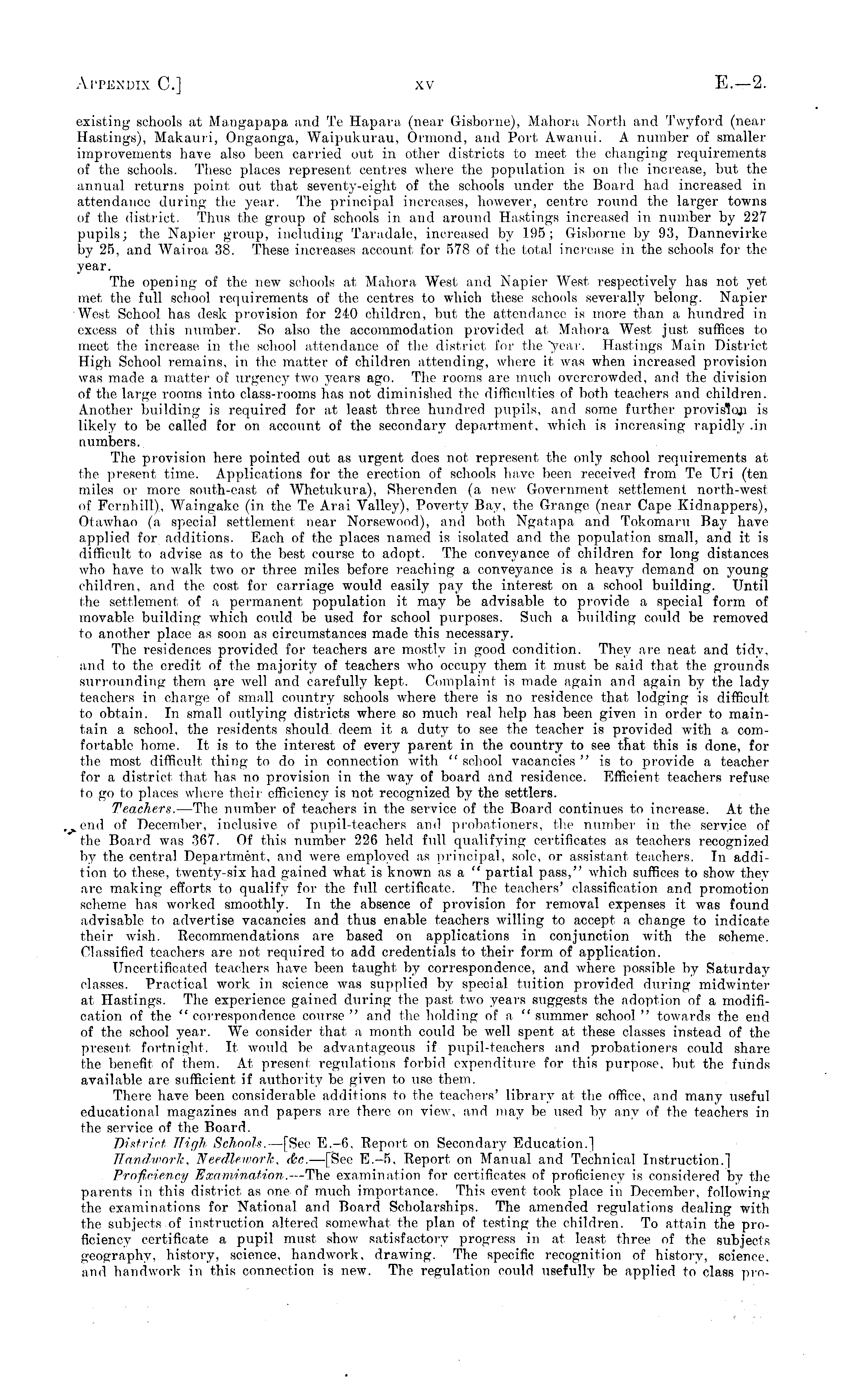 existing schools at Mangapapa and Te Hapara (near Gisborne), Mahora North and Twyford (near Hastings), Makauri, Ongaonga, Waipukurau, Ormond, and Port Awanui. A number of smaller improvements have also been carried out in other districts to meet the changing requirements of the schools. These places represent centres where the population is on the increase, but the annual returns point out that seventy-eight of the schools under the Board had increased in attendance during the year. The principal increases, however, centre round the larger towns of the district. Thus the group of schools in and around Hastings increased in number by 227 pupils; the Napiei' group, including Taradale, increased by 195; Gisborne by 93, Dannevirke by 25, and Wairoa 38. These increases account for 578 of the total increase in the schools for the year. The opening of the new schools at Mahora West and Napier West respectively has not yet met the full school requirements of the centres to which these schools severally belong. Napier West School has desk provision for 240 children, but the attendance is more than a hundred in excess of this number. So also the accommodation provided at Mahora West just suffices to meet the increase in the school attendance of the district for the "year. Hastings Main District High School remains, in the matter of children attending, where it was when increased provision was made a matter of urgency two years ago. The rooms are much overcrowded, and the division of the large rooms into class-rooms has not diminished the difficulties of both teachers and children. Another building is required for at least three hundred pupils, and some further provision is likely to be called for on account of the secondary department, which is increasing rapidly .in numbers. The provision here pointed out as urgent does not represent the only school requirements at the present time. Applications for the erection of schools have been received from Te TJri (ten miles or more south-east of Whetukura), Sherenden (a new Government settlement north-west of Fernhill), Waingake (in the Te Arai Valley), Poverty Bay, the Grange (near Cape Kidnappers), Otawhao (a special settlement near Norsewood), and both Ngatapa and Tokomaru Bay have applied for additions. Each of the places named is isolated and. the population small, and it is difficult to advise as to the best course to adopt. The conveyance of children for long distances who have to walk two or three miles before reaching a conveyance is a heavy demand on young children, and the cost for carriage would easily pay the interest on a school building. Until the settlement of a permanent population it may be advisable to provide a special form of movable building which could be used for school purposes. Such a building could be removed to another place as soon as circumstances made this necessary. The residences provided for teachers are mostly in good condition. They are neat and tidy, and to the credit of the majority of teachers who occupy them it must be said that the grounds surrounding them are well and carefully kept. Complaint is made again and again by the lady teachers in charge of small country schools where there is no residence that lodging is difficult to obtain. In small outlying districts where so much real help has been given in order to maintain a school, the residents should deem it a duty to see the teacher is provided with a comfortable home. It is to the interest of every parent in the country to see that this is done, for the most difficult thing to do in connection with " school vacancies " is to provide a teacher for a district that has no provision in the way of board and residence. Efficient teachers refuse to go to places where their efficiency is not recognized by the settlers. Teachers. —The number of teachers in the service of the Board continues to increase. At the , A end of December, inclusive of pupil-teachers and probationers, the number in the service of the Board was 367. Of this number 226 held full qualifying certificates as teachers recognized by the central Department, and were employed as principal, sole, or assistant teachers. In addition to these, twenty-six had gained what is known as a " partial pass," which suffices to show they are making efforts to qualify for the full certificate. The teachers' classification and promotion scheme has worked smoothly. Tn the absence of provision for removal expenses it was found advisable to advertise vacancies and thus enable teachers willing to accept a change to indicate their wish. Recommendations are based on applications in conjunction with the scheme. Classified teachers are not required to add credentials to their form of application. Uncertificated teachers have been taught by correspondence, and where possible by Saturday classes. Practical work in science was supplied by special tuition provided during midwinter at Hastings. The experience gained during the past two years suggests the adoption of a modification of the " correspondence course " and the holding of a " summer school " towards the end of the school year. We consider that a month could be well spent at these classes instead of the present fortnight. It would be advantageous if pupil-teachers and probationers could share the benefit of them. At present regulations forbid expenditure for this purpose, but the funds available are sufficient if authority be given to use them. There have been considerable additions to the teachers' library at the office, and many useful educational magazines and papers are there on view, and may be used by any of the teachers in the service of the Board. District High Schools. —[See E.-6, Report on Secondary Education.] Handwork. Needlework. &c. —[Sec E.-5, Report on Manual and Technical Instruction.] Proficiency Examination.— -The examination for certificates of proficiency is considered by the parents in this district as one of much importance. This event took p