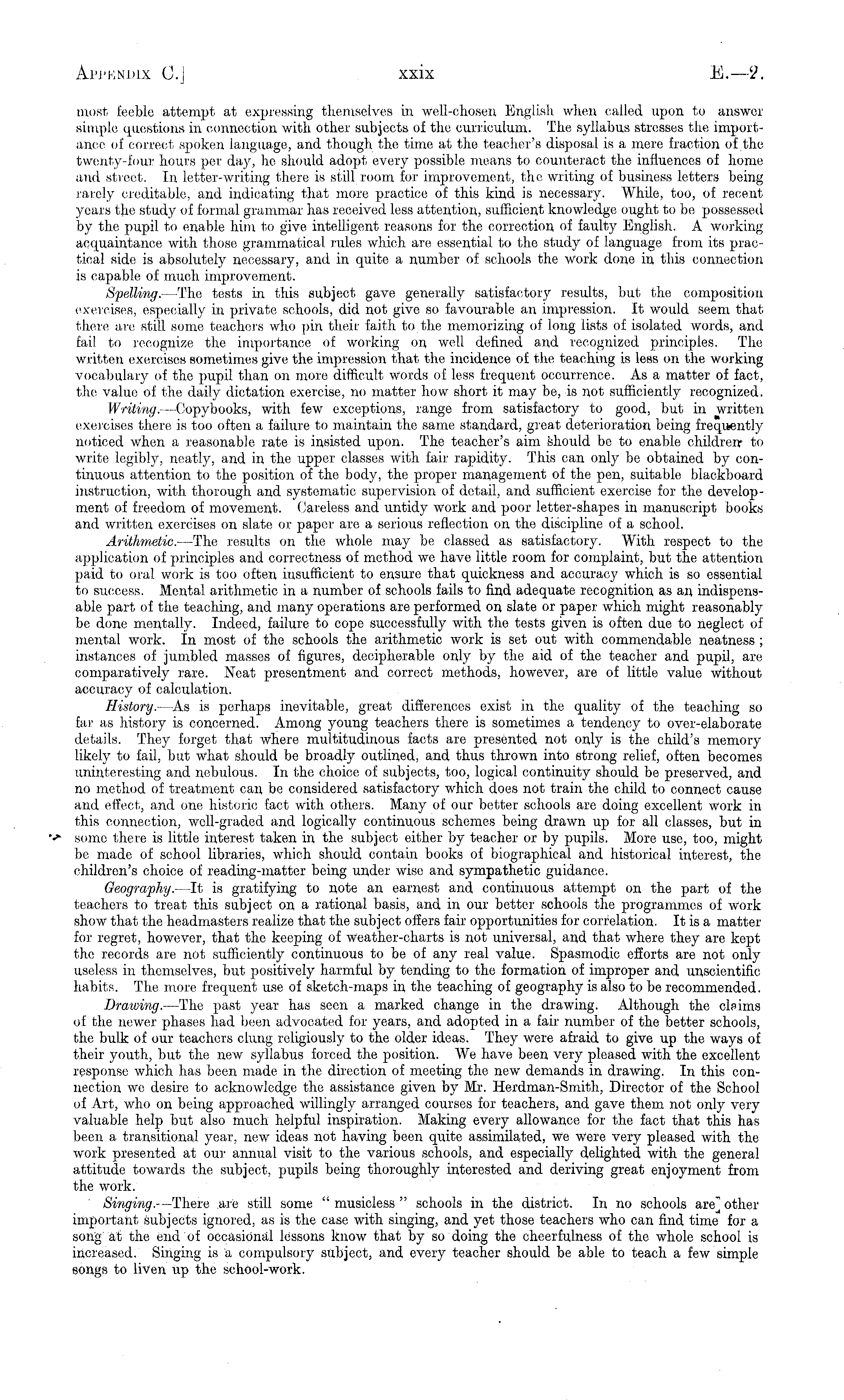 most feeble attempt at expressing themselves in well-chosen English when called upon to answer simple questions in connection with other subjects of the curriculum. The syllabus stresses the importance of correct spoken language, and though the time at the teacher's disposal is a mere fraction of the twenty-four hours per day, he should adopt every possible means to counteract the influences of home and street. In letter-writing there is still room for improvement, the writing of business letters being rarely creditable, and indicating that more practice of this kind is necessary. While, too, of recent years the study of formal grammar has received less attention, sufficient knowledge ought to be possessed by the pupil to enable him to give intelligent reasons for the correction of faulty English. A working acquaintance with those grammatical rules which are essential to the study of language from its practical side is absolutely necessary, and in quite a number of schools the work done in this connection is capable of much improvement. Spelling. —The tests in this subject gave generally satisfactory results, but the composition exercises, especially in private schools, did not give so favourable an impression. It would seem that there are still some teachers who pin their faith to the memorizing of long lists of isolated words, and fail to recognize the importance of working on well defined and recognized principles. The written exercises sometimes give the impression that the incidence of the teaching is less on the working vocabulary of the pupil than on more difficult Words of less frequent occurrence. As a matter of fact, the value of the daily dictation exercise, no matter how short it may be, is not sufficiently recognized. Writing. —Copybooks, with few exceptions, range from satisfactory to good, but in written exercises there is too often a failure to maintain the same standard, great deterioration being frequently noticed when a reasonable rate is insisted upon. The teacher's aim should be to enable children* to write legibly, neatly, and in the upper classes with fair rapidity. This can only be obtained by continuous attention to the position of the body, the proper management of the pen, suitable blackboard instruction, with thorough and systematic supervision of detail, and sufficient exercise for the development of freedom of movement. Careless and untidy work and poor letter-shapes in manuscript books and Written exercises on slate or paper arc a serious reflection on the discipline of a school. Arithmetic. -The results on the whole may bo classed as satisfactory. With respect to the application of principles and correctness of method we have little room for complaint, but the attention paid to oral work is too often insufficient to ensure that quickness and accuracy which is so essential to success. Mental arithmetic in a number of schools fails to find adequate recognition as an indispensable part of the teaching, and many operations are performed on slate or paper which might reasonably bo done mentally. Indeed, failure to cope successfully with the tests given is often due to neglect of mental work. In most of the schools the arithmetic work is set out with commendable neatness ; instances of jumbled masses of figures, decipherable only by the aid of the teacher and pupil, arc comparatively rare. Neat presentment and correct methods, however, are of little value without accuracy of calculation. History. —As is perhaps inevitable, great differences exist in the quality of the teaching so far as history is concerned. Among young teachers there is sometimes a tendency to over-elaborate details. They forget that where multitudinous facts are presented not only is the child's memory likely to fail, but what should be broadly outlined, and thus thrown into strong relief, often becomes uninteresting and nebulous. In the choice of subjects, too, logical continuity should bo preserved, and no method of treatment can be considered satisfactory which does not train the child to connect cause and effect, and one historic fact with others. Many of our better schools are doing excellent work in this connection, well-graded and logically continuous schemes being drawn up for all classes, but in '•*■ some there is little interest taken in the subject either by teacher or by pupils. More use, too, might be made of school libraries, which should contain books of biographical and historical interest, the children's choice of reading-matter being under wise and sympathetic guidance. Geography.- —lt is gratifying to note an earnest and continuous attempt on the part of the teachers to treat this subject on a rational basis, and in our better schools the programmes of work show that the headmasters realize that the subject offers fair opportunities for correlation. It is a matter for regret, however, that the keeping of weather-charts is not universal, and that where they are kept the records are not sufficiently continuous to be of any real value. Spasmodic efforts are not only useless in themselves, but positively harmful by tending to the formation of improper and unscientific habits. The more frequent use of sketch-maps in the teaching of geography is also to be recommended. Drawing. —The past year has seen a marked change in the drawing. Although the claims of the newer phases had been advocated for years, and adopted in a fair number of the better schools, the bulk of our teachers clung religiously to the older ideas. They were afraid to give up the ways of their youth, but the new syllabus forced the position. We have been very pleased with the excellent response which has been made in the direction of meeting the new demands in drawing. In this connection we desire to acknowledge the assistance given by Mr. Herdman-Smith, Director of the School of Art, who on being approached willingly arranged courses for teachers, and gave them not only very valuable help but also mu
