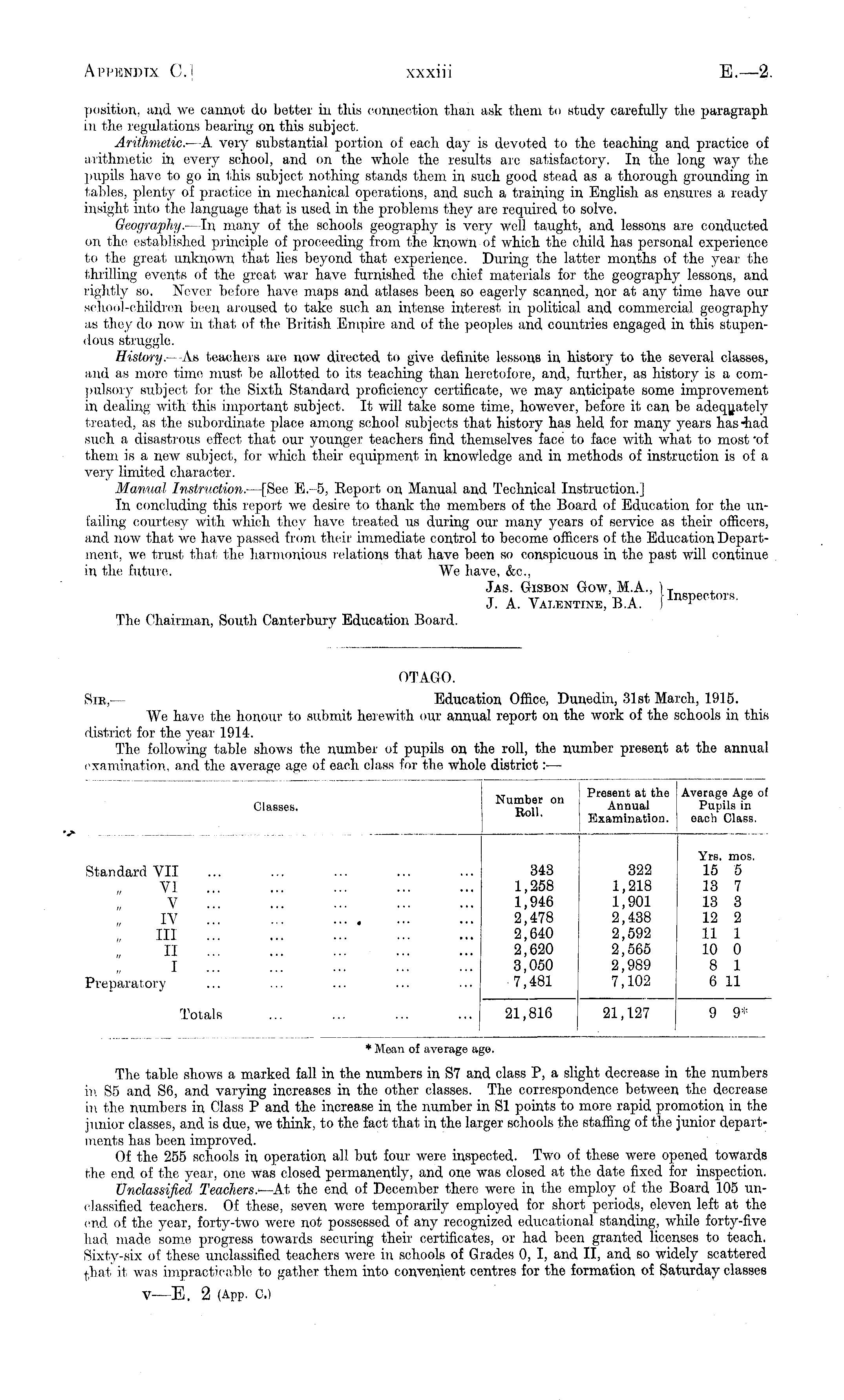 OTAGO. Sib, — Education Office, Dunedin, 31st March, 1915. We have the honour to submit herewith our annual report on the work of the schools in this district for the year 1914. The following table shows the number of pupils on the roll, the number present at the annual examination, and the average age of each class for the whole district :■ —