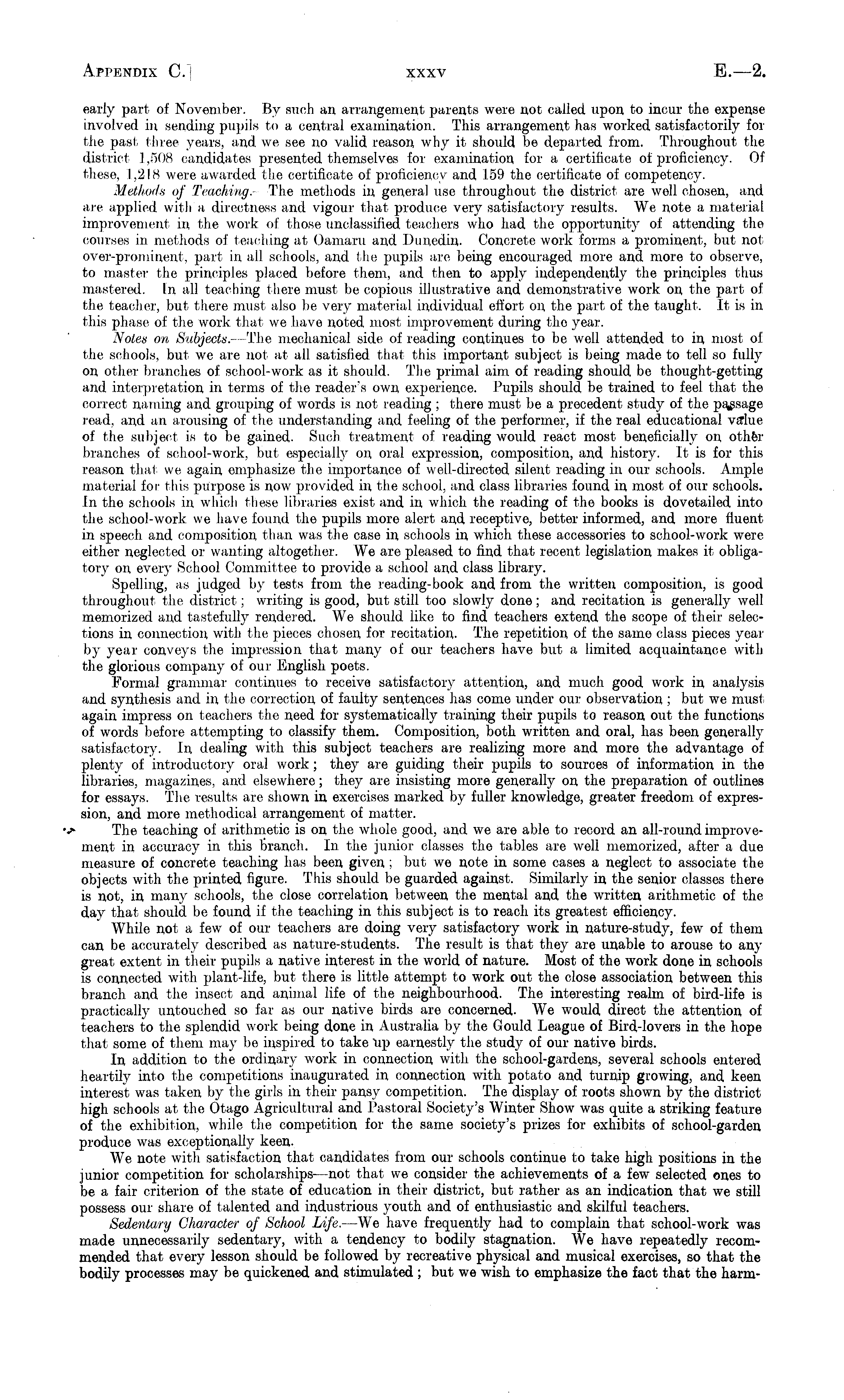 early part of November. By such an arrangement parents were not called upon to incur the expense involved in sending pupils to a central examination. This arrangement has worked satisfactorily for the past three years, and we see no valid reason why it should be departed from. Throughout the district 1,508 candidates presented themselves for examination for a certificate of proficiency. Of these, 1,218 were awarded the certificate of proficiency and 159 the certificate of competency. Methods of Teaching.- The methods in general use throughout the district are well chosen, and are applied with a directness and vigour that produce very satisfactory results. We note a material improvement in the work of those unclassified teachers who had the opportunity of attending the courses in methods of teaching at Oamaru and Dunedin. Concrete work forms a prominent, but not: over-prominent, part in all schools, and the pupils are being encouraged more and more to observe, to master the principles placed before them, and then to apply independently the principles thus mastered. In all teaching there must be copious illustrative and demonstrative work on the part of the teacher, but there must also be very material individual effort on, the part of the taught. It is in this phase of the work that we have noted most improvement during the year. Notes on Subjects. —The mechanical side of reading continues to be well attended to in most of the schools, but we are not at all satisfied that this important subject is being made to tell so fully on other branches of school-work as it should. The primal aim of reading should be thought-getting and interpretation in terms of the reader's own experience. Pupils should be trained to feel that the correct naming and grouping of words is not reading ; there must be a precedent study of the passage read, and an arousing of the understanding and feeling of the performer, if the real educational value of the subject is to be gained. Such treatment of reading would react most beneficially on other branches of school-work, but especially on oral expression, composition, and history. It is for this reason that we again emphasize the importance of well-directed silent reading in our schools. Ample material for this purpose is now provided in the school, and class libraries found in most of our schools. In the schools in which these libraries exist and in which the reading of the books is dovetailed, into the school-work we have found the pupils more alert and receptive, better informed, and more fluent in speech and composition than was the case in schools in which these accessories to school-work were either neglected or wanting altogether. We are pleased to find that recent legislation makes it obligatory on every School Committee to provide a school and class library. Spelling, as judged by tests from the reading-book and from the written composition, is good throughout the district; writing is good, but still too slowly done; and recitation is generally well memorized and tastefully rendered. We should like to find teachers extend the scope of their selections in connection, with the pieces chosen, for recitation. The repetition of the same class pieces year by year conveys the impression that many of our teachers have but a limited acquaintance with the glorious company of our English poets. Formal grammar continues to receive satisfactory attention, and much good work in analysis and synthesis and in the correction of faulty sentences has come under our observation ; but we must: again impress on teachers the need for systematically training their pupils to reason out the functions of words before attempting to classify them. Composition, both written and oral, has been generally satisfactory. In dealing with this subject teachers are realizing more and more the advantage of plenty of introductory oral work; they are guiding their pupils to sources of information in the libraries, magazines, and elsewhere; they are insisting more generally on the preparation of outlines for essays. The results are shown in exercises marked by fuller knowledge, greater freedom of expression, and more methodical arrangement of matter. ■-* The teaching of arithmetic is on the whole good, and we are able to record an all-round improvement in accuracy in this branch. In. the junior classes the tables are well memorized, after a due measure of concrete teaching has been given ; but we note in some cases a neglect to associate the objects with the printed figure. This should be guarded against. Similarly in the senior classes there is not, in many schools, the close correlation between the mental and the written arithmetic of the day that should be found if the teaching in this subject is to reach its greatest efficiency. While not a few of our teachers are doing very satisfactory work in nature-study, few of them can be accurately described as nature-students. The result is that they are unable to arouse to any great extent in their pupils a native interest in the world of nature. Most of the work done in schools is connected with plant-life, but there is little attempt to work out the close association between this branch and the insect and animal life of the neighbourhood. The interesting realm of bird-life is practically untouched so far as our native birds are concerned. We would direct the attention of teachers to the splendid work being done in Australia by the Gould League of Bird-lovers in the hope that some of them may be inspired to take up earnestly the study of our native birds. In addition to the ordinary work in connection with the school-gardens, several schools entered heartily into the competitions inaugurated in connection with potato and turnip growing, and keen interest was taken by the girls in their pansy competition. The display of roots shown by the district high schools at the Otago Agricultural and Pastoral Society's Winter Show was quite a striking feature o