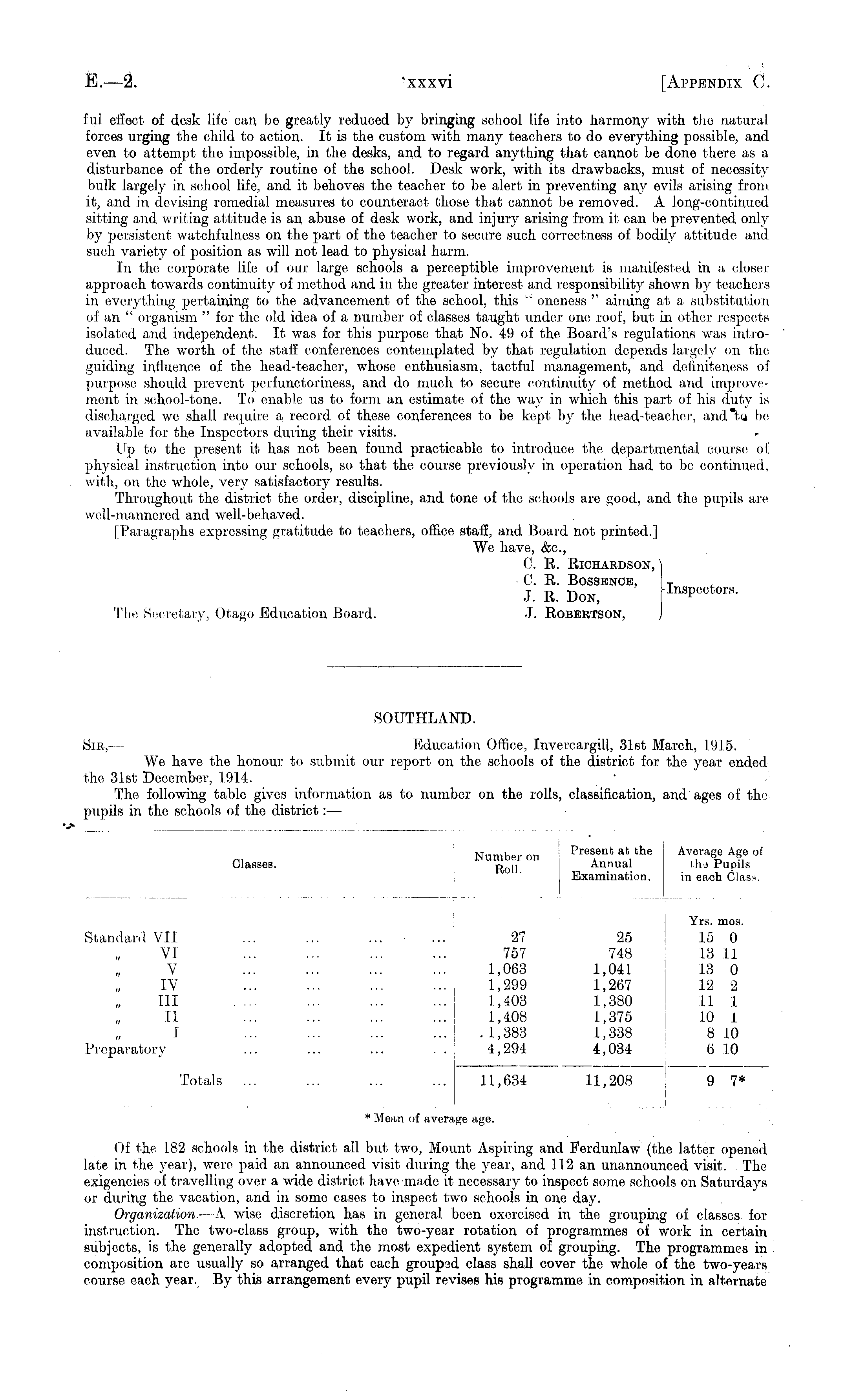 SOUTHLAND. Sir, — Education Office, Invercargill, 31st March, 191.5. We have the honour to submit our report on the schools of the district for the year ended the 31st December, 1914. The following tabic gives information as to number on the rolls, classification, and ages of the pupils in the schools of the district:— •-*■ ,