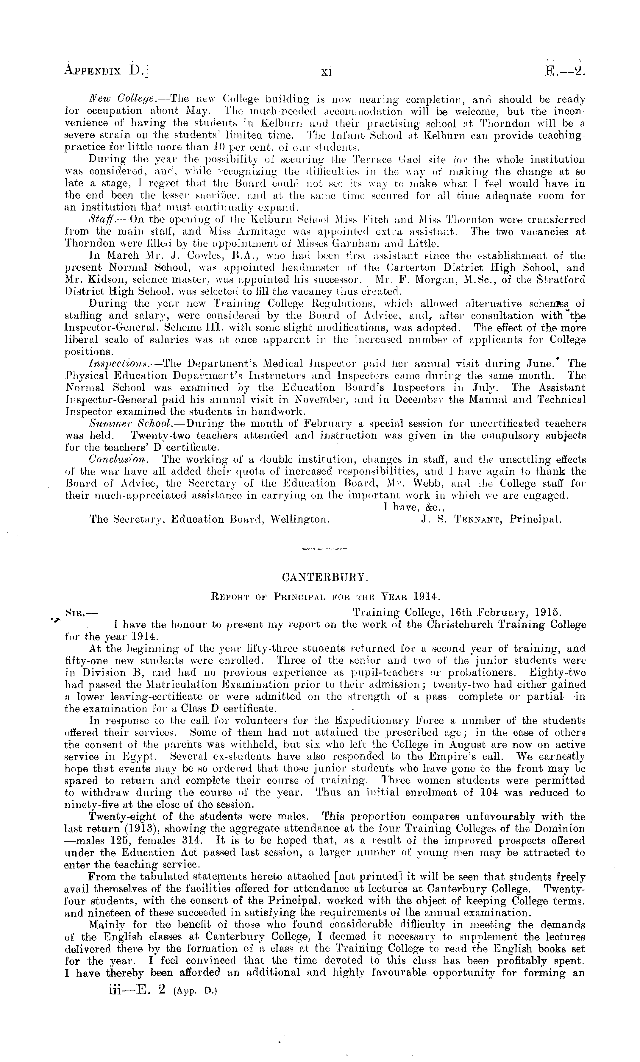 CANTERBURY. Report of Principal for the Year 1914. Sir, — Training College, 16th February, 1915. 1 have the honour to present my report on the work of the Christchuroh Training College for the year 1914. At the beginning of the year fifty-three students returned for a second year of training, and fifty-one new students were enrolled. Three of the senior and two of the junior students were in Division B, and had no previous experience as pupil-teachers or probationers. Eighty-two had passed the Matriculation Examination prior to their admission; twenty-two had either gained a lower leaving-certificate or were admitted on the strength of a, pass —complete or partial—in the examination for a. Class D certificate. In response to the call, for volunteers for the Expeditionary Force a number of the students offered their services. Some of them had not attained the prescribed age; in the case of others the consent of the parents was withheld, but six who left the College in August are now on active service in Egypt. Several ex-students have also responded to the Empire's call. We earnestly hope that events may be so ordered that those junior students who have gone to the front may be spared to return and complete their course of training. Three women students were permitted to withdraw during the course of the year. Thus an initial enrolment of 104 was reduced to ninety-five at the close of the session. Twenty-eight of the students were males. This proportion compares unfavourably with the last return (1913), showing the aggregate attendance at the four Training Colleges of the Dominion —males 125, females 314. It is to be hoped that, as a result of the improved prospects offered under the Education Act passed last session, a larger number of young men may be attracted to enter the teaching service. From the tabulated statements hereto attached [not printed] it will be seen that students freely avail themselves of the facilities offered for attendance at lectures at Canterbury College. Twentyfour students, with the consent of the Principal, worked with the object of keeping College terms, and nineteen, of these succeeded in satisfying the requirements of the annual examination. Mainly for the benefit of those who found considerable difficulty in meeting the demands of the English classes at Canterbury College, I deemed it necessary to supplement the lectures delivered there by the formation of a, class at the Training College to read the English books set for the year. I feel convinced that the time devoted to this class has been profitably spent. I have thereby been afforded an additional and highly favourable opportunity for forming an