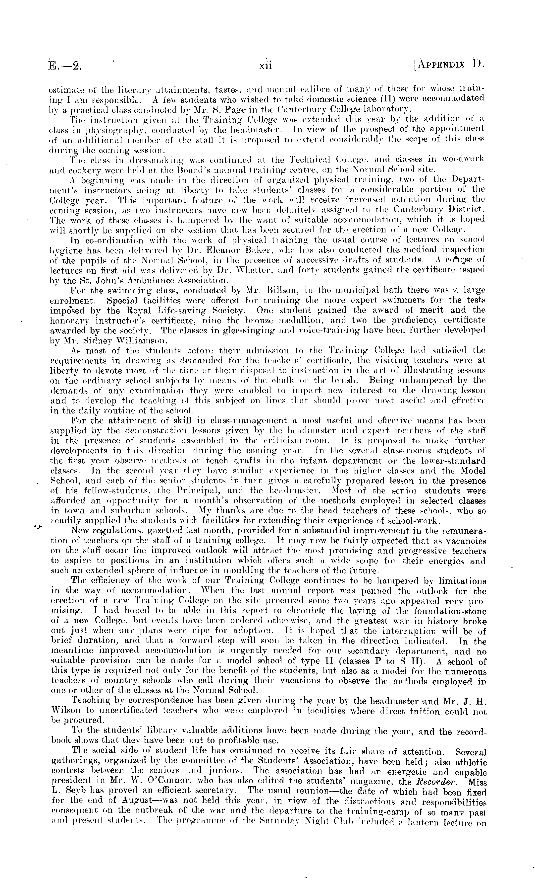 estimate of the literary attainments, tastes, and mental calibre of many of those for whose training lam responsible. A few students who wished to take domestic science (II) were accommodated by a practical class conduoted by Mr. S. Page in the Canterbury College laboratory. The instruction given at the Training College was extended this .year by the addition of a class in physiography, conducted by the headmaster. In view of the prospect of the appointment of an additional member of the staff it is proposed to extend considerably the soope of this class during the corning session. The class in dressmaking was continued at the Technical College, and classes in woodwork and cookery were held at the Board's manual training centre, on the Normal School site. A beginning was made in the direction of organized physical (raining, two of the Department's instructors being at liberty to take students' classes for a considerable portion of the College year. This important feature of the work will receive increased attention during the coming session, as two instructors have now been definitely assigned to the Canterbury District. The work of these classes is hampered by the want of suitable accommodation, which it is hoped will shortly be supplied on. the section that has been secured for the erection of a new College. In co-ordination with the work of physical training the usual course of lectures on school hygiene has been delivered by Dr. Eleanor Baker, who has also conducted the medical inspection of the pupils of the Normal School, in the presence of successive drafts of students. A course of lectures on first aid was delivered by Dr. Whetter. and forty students gained the certificate issued by the St. John's Ambulance Association. For the swimming class, conducted by Mr. Billson, in the municipal bath there was a large enrolment. Special facilities were offered for training the more expert swimmers for the tests imposed by the Royal Life-saving Society. One student gained the award of merit and the honorary instructor's certificate, nine the bronze medallion, and two the proficiency certificate awarded by the society. The classes in glee-singing and voice-training have been further developed by Mr. Sidney Williamson. As most of the students before their admission to the Training College had satisfied the requirements in drawing as demanded for the teachers' certificate, the visiting teachers were at liberty to devote most of the time at their disposal to instruction in the art of illustrating lessons on the ordinary school subjects by means of the chalk or the brush. Being unhampered by the demands of any examination the)' were enabled to impart new interest to the drawing-lesson and to develop the teaching of this subjeot on lines that should prove most useful and effective in the daily routine of the school. For the attainment of skill in class-management a most useful and effective means has been supplied by the demonstration lessons given by the headmaster and expert members of the staff in the presence of students assembled in the criticism-room. It is proposed to make further developments in this direction during the coming year. In the several class-rooms students of the first year observe methods or teach drafts in the infant department or the lower-standard classes. In the second year they have similar experience in the higher classes and the Model School, and each of the senior students in turn gives a carefully prepared lesson in the presence of his fellow-students, the Principal, and the headmaster. Most of the senior students were afforded an opportunity for a month's observation of the methods employed in selected classes in town and suburban schools. My thanks are due to the head teachers of these schools, who so readily supplied the students with facilities for extending their experience of school-work. New regulations, gazetted last month, provided for a substantial improvement in the remuneration of teachers qn the staff of a training college. It may now be fairly expected that as vacancies on the staff occur the improved outlook will attract the most promising and progressive teachers to aspire to positions in an institution which offers such a wide scope for their energies and such an extended sphere of influence in moulding the teachers of the future. The efficiency of the work of our Training College continues to be hampered by limitations in the way of accommodation. When the last annual report, was penned the outlook for the erection of a new Training College on the site procured some two years ago appeared very promising. I had hoped to be able in this report to chronicle the laying of the foundation-stone of a new College, but events have been ordered otherwise, and the greatest war in history broke out just when our plans were ripe for adoption. It is hoped that the interruption wiil be of brief duration, and that a forward step will soon be taken in the direction indicated. In the meantime improved accommodation is urgently needed for our secondary department, and no suitable provision can be made for a model school of type II (classes Pto S II). A school of this type is required not only for the benefit of the students, but also as a model for the numerous teachers of country schools who call during their vacations to observe the methods employed in one or other of the classes at the Normal School. Teaching by correspondence has been given during the year by the headmaster and Mr. J. H. Wilson to uncertificated teachers who were employed in localities where direct tuition could not be procured. To the students' library valuable additions have been made during the year, and the recordbook shows that they have been put to profitable use. The social side of student life has continued to receive its fail- share of attention. Several gatherings, organized by the committee of the Students' Association, have been held; also athletic contests between the seniors and jun