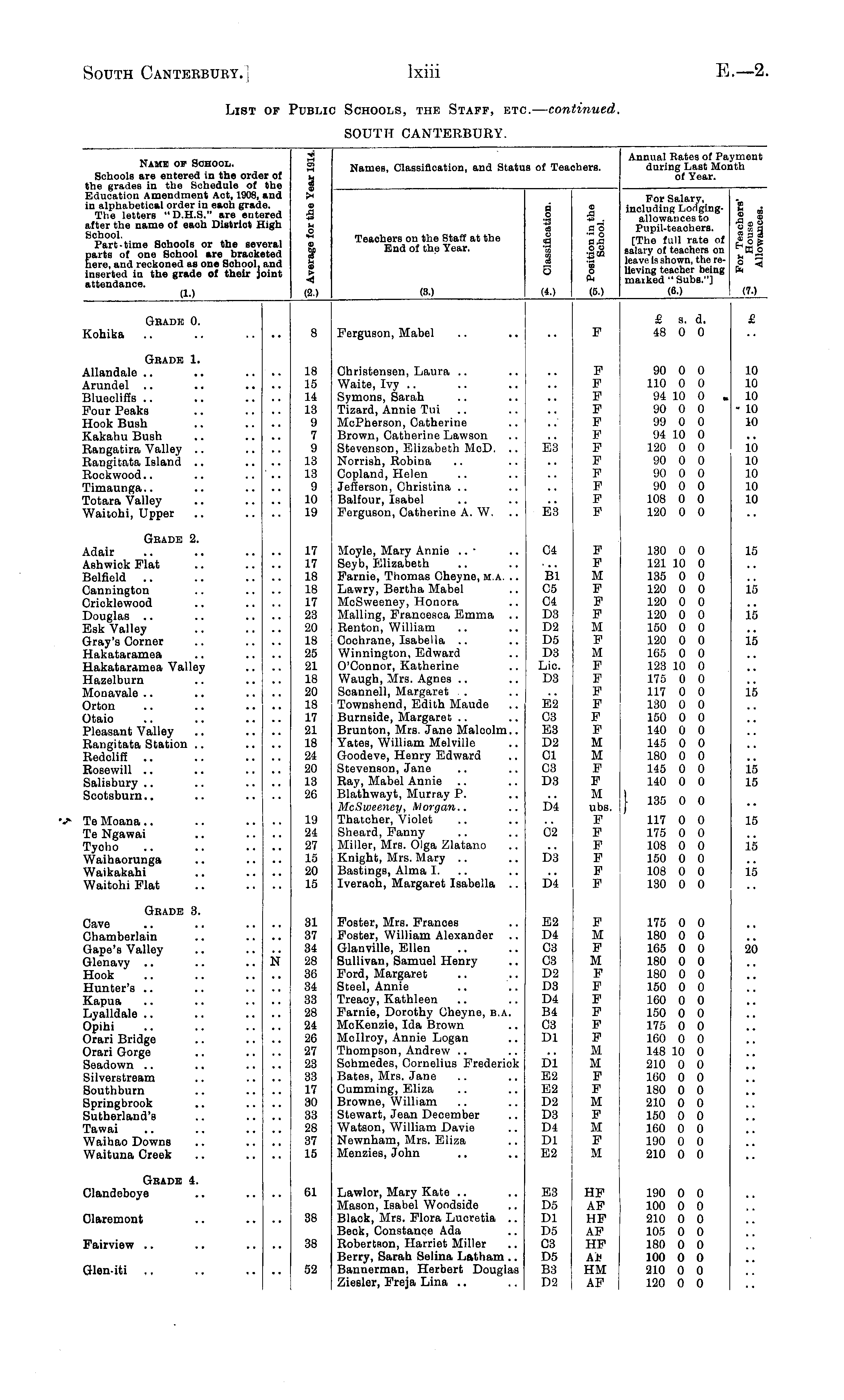 Name of School. Schools are entered in the ordc the grades in the Schedule of Education Amendment Act, 1908, in alphabetical order in each grad The letters " D.H.S." are entt after the name of each District £ School. Part-time Schools or the sev Earts of one School are brack, ere, and reckoned as one School, inserted in the grade of their ]< attendance. ler of the , and de. tered High a, s CD I* CD a u a •0 I g 3 (20 Names, Classification, and Stat is of Teai d c a CD .'5 to 3 5 ihers. CD & <-< . a o •» o o s O rH (5.) For Salary, including Lodgingallowances to Pupil-teachers. [The full rate of salary of teachers on leave is shown, the relieving teacher being marked " Subs."] (60 Annual Rates of Pa during Last Mo: of Year. itb I i 111 ft veral teted , and joint Teachers on the Staff at the End of the Year. (30 (40 (7.) (10 Grade 0. £ a. d. 48 0 0 £ Kohika 8 Ferguson, Mabel F Grade 1. 18 15 14 13 9 7 9 13 13 9 10 19 Christensen, Laura Waite, Ivy Symons, Sarah Tizard, Annie Tui McPherson, Catherine Brown, Catherine Lawson Stevenson, Elizabeth MoD. .. Norrish, Robina Copland, Helen Jefferson, Christina .. Balfour, Isabel Ferguson, Catherine A. W. F F F P F F F F F F P F 90 0 0 110 0 0 94 10 0 90 0 0 99 0 0 94 10 0 120 0 0 90 0 0 90 0 0 90 0 0 108 0 0 120 0 0 r. 10 10 10 • 10 10 Allandale Arundel Blueclifls Four Peaks Hook Bush Kakahu Bush Rangatira Valley .. Rangitata Island .. Rockwood.. Timaunga.. Totara Valley Waitohi, Upper E3 10 10 10 10 10 E3 Grade 2. 17 17 18 18 17 23 20 18 25 21 18 20 18 17 21 18 24 20 13 26 Moyle, Mary Annie Seyb, Elizabeth Farnie, Thomas Cheyne, m.a. .. Lawry, Bertha Mabel McSweeney, Honora Mailing, Francosca Emma .. Renton, William Cochrane, Isabella .. Winnington, Edward O'Connor, Katherine Waugh, Mrs. Agnes Scannell, Margaret Townshend, Edith Maude Burnside, Margaret Brunton, Mrs. Jane Malcolm.. Yates, William Melville Goodeve, Henry Edward Stevenson, Jane Ray, Mabel Annie Blathwayt, Murray P. McSweeney, Morgan.. Thatcher, Violet Sheard, Fanny Miller, Mrs. Olga Zlatano Knight, Mrs. Mary Bastings, Alma I. Iveraoh, Margaret Isabella .. C4 F F M F F F M P M P F F F P P M M P F M ubs. P F F F F F 130 0 0 121 10 0 135 0 0 120 0 0 120 0 0 120 0 0 150 0 0 120 0 0 165 0 0 123 10 0 175 0 0 117 0 0 130 0 0 150 0 0 140 0 0 145 0 0 180 0 0 145 0 0 140 0 0 15 Adair Ashwiok Flat Belfield .. Cannington Cricklewood Douglas .. Esk Valley Gray's Corner Hakataramea Hakataramea Valley Hazelburn Monavale Orton Otaio Pleasant Valley Rangitata Station .. Redclifi Rosewill Salisbury Scotsburn.. Bl 05 04 D3 D2 D5 D3 Lie. D3 is ih 15 is E2 03 E3 D2 Cl C3 D3 is 15 D4 I 135 0 0 Te Moana Te Ngawai Tyoho Waihaorunga Waikakahi Waitohi Flat l'J 24 27 15 20 15 02 D3 117 0 0 175 0 0 108 0 0 150 0 0 108 0 0 130 0 0 15 15 D4 15 Grade 3. 31 37 34 28 86 34 88 28 24 26 27 23 88 17 30 33 28 37 15 Foster, Mrs. Frances Foster, William Alexander .. Glanville, Ellen Sullivan, Samuel Henry Ford, Margaret Steel, Annie Treaoy, Kathleen Farnie, Dorothy Oheyne, b.a. McKenzie, Ida Brown Mcllroy, Annie Logan Thompson, Andrew .. Sohmedes, Cornelius Frederiok Bates, Mrs. Jane Cumming, Eliza Browne, William Stewart, Jean December Watson, William Davie Newnham, Mrs. Eliza Menzies, John E2 D4 C3 03 D2 D3 D4 B4 03 Dl F M F M F P F F F F M M F F M P M F M 175 0 0 180 0 0 165 0 0 180 0 0 180 0 0 150 0 0 160 0 0 150 0 0 175 0 0 160 0 0 148 10 0 210 0 0 160 0 0 180 0 0 210 0 0 150 0 0 160 0 0 190 0 0 210 0 0 Cave Chamberlain Gape's Valley Glenavy Hook Hunter's Kapua Lyalldale Opihi Orari Bridge Orari Gorge Soadown Silverstream Southburn Springbrook Sutherland's Tawai Waihao Downs Waituna Creek N 20 Dl E2 E2 D2 D3 D4 Dl E2 Grade 4. Clandeboye 61 Lawlor, Mary Kate Mason, Isabel Woodside Black, Mrs. Flora Lucretia .. Beck, Constance Ada Robertson, Harriet Miller Berry, Sarah Selina Latham .. Bannerman, Herbert Douglas Ziesler, Freja Lina .. E3 D5 Dl D5 03 D5 B3 D2 HF AP HF AP HP A* HM AP 190 0 0 100 0 0 210 0 0 105 0 0 180 0 0 100 0 0 210 0 0 120 0 0 Olaremont 88 Fairview 88 Glen-iti .. 52