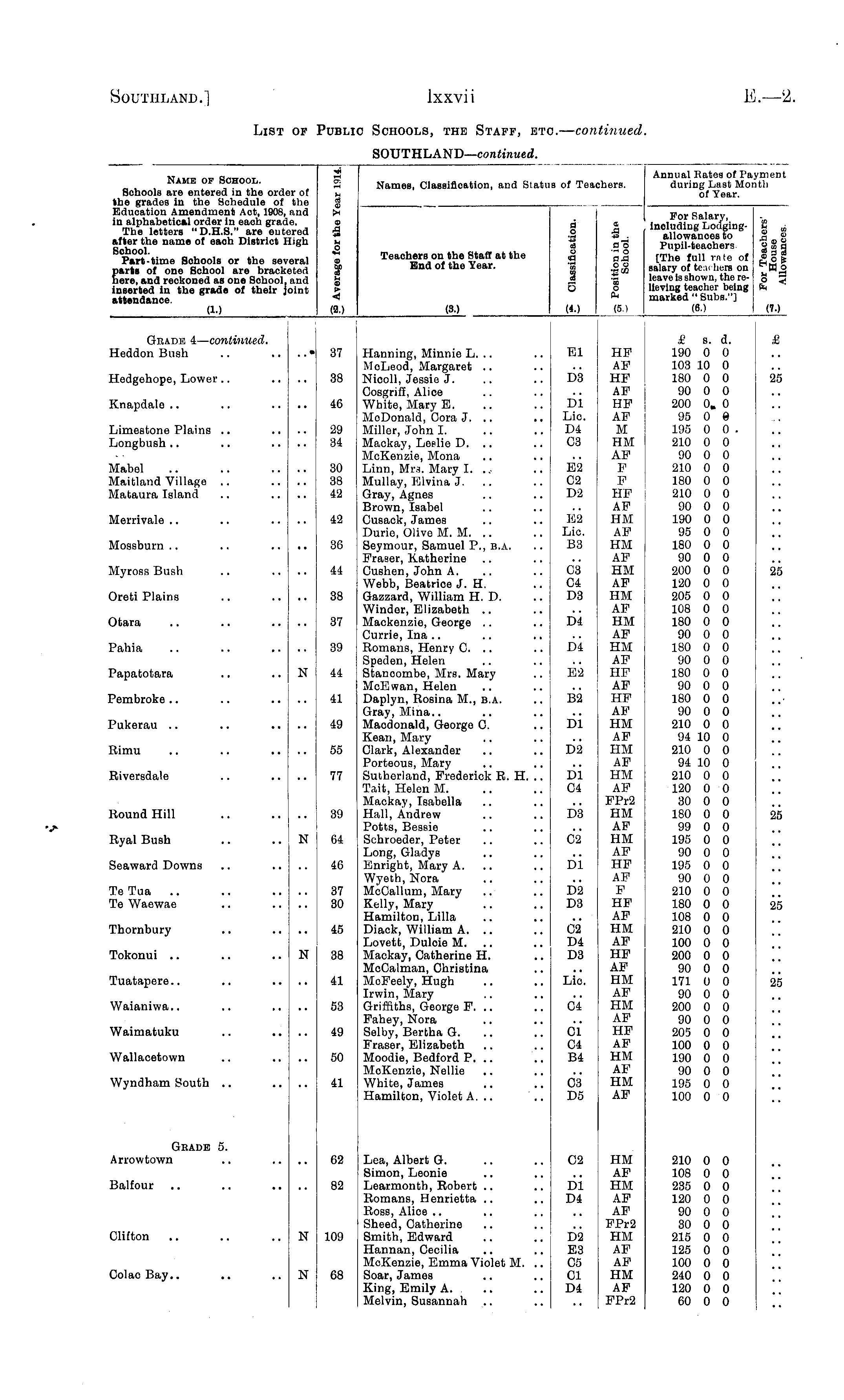 Name op School. Schools are entered in the ordei the grades in the Schedule of Education Amendment Act, 1908, t in alphabetical order in each gradt The letters "D.H.S." are ente after the name of eaoh District H School. Part-time Sohoolh or the seve Earts of one School are bracke ere, and reckoned as one Sohool, t inserted in the grade of their Jo attendance. Br of the and le. ered ligh (T. H ei 9 ■i) fl +=> u o o a c $ > (2.) Names, Classification, and Stat s of Teai a o as CD 2 ttj at o ihers. a fl ■» . fl o '* Q flfl O o *£cB tc O rH (5.) For Salary, including Lodgingallowances to Pupil-teachers [The full rate of salary of temhera on leave is shown, the relieving teacher being marked " Subs."] (60 Annual Hates of Pa; during Last Mor of Year. /ment i tii "co y c r, £ Hi te a r° < HH 'eral eted and oint Teachers on the Staff at the End of the Year. (3.) (4.) (7.) . (L) Geade 4— continued. Heddon Bush 37 Planning, Minnie L. .. McLeod, Margaret .. Niooll, Jessio J. Oosgriff, Alioe White, Mary E. McDonald, Oora J. .. Miller, John I. Mackay, Leslie D. .. McKenzie, Mona Linn, Mrs. Mary I. ... Mullay, Elvina J. Gray, Agnes Brown, Isabel Cusack, James Durio, Olive M. M. .. Seymour, Samuol P., B.A. Eraser, Kathorine Cushen, John A. Webb, Beatrice J. H. Gazzard, William H. D. Winder, Elizabeth .. Mackenzie, George Currie, Ina Romans, Henry G. .. Speden, Helen Stanoombe, Mrs. Mary McEwan, Helen Daplyn, Rosina M., b.a. Gray, Mina.. Macdonald, George C. Kean, Mary Clark, Alexander Porteous, Mary Sutherland, Froderick R. H. .. Tait, Helen M. Mackay, Isabella Hall, Andrew Potts, Bessie Schroeder, Peter Long, Gladys Enright, Mary A. Wyeth, Nora McCallum, Mary Kelly, Mary Hamilton, Lilla Diack, William A. .. Lovett, Dulcie M. .. Mackay, Catherine H. McCalman, Christina MoFeely, Hugh Irwin, Mary Griffiths, George F. .. Fahey, Nora Selby, Bertha G. Fraser, Elizabeth Moodie, Bedford P. .. McKenzie, Nellie White, James Hamilton, Violet A. .. El HF AF HF AF HF AF M HM AF F P HF AP HM AF HM AF HM AF HM AF HM AP HM AF HF AF HF AF HM AP HM AF HM AF FPr2 HM AP HM AP HF AF F HF AF HM AF HF AF HM AP HM AF HF AF HM AF HM AP £ a. d. 190 0 0 103 10 0 180 0 0 90 0 0 200 0. 0 95 0 6 195 0 0 210 0 0 90 0 0 210 0 0 180 0 0 210 0 0 90 0 0 190 0 0 95 0 0 180 0 0 90 0 0 200 0 0 120 0 0 205 0 0 108 0 0 180 0 0 90 0 0 180 0 0 90 0 0 180 0 0 90 0 0 180 0 0 90 0 0 210 0 0 94 10 0 210 0 0 94 10 0 210 0 0 120 0 0 30 0 0 180 0 0 99 0 0 195 0 0 90 0 0 195 0 0 90 0 0 210 0 0 180 0 0 108 0 0 210 0 0 100 0 0 200 0 0 90 0 0 171 0 0 90 0 0 200 0 0 90 0 0 205 0 0 100 0 0 190 0 0 90 0 0 195 0 0 100 0 0 £ Hedgehope, Lower 38 D3 25 Knapdale Limestone Plains Longhush 46 29 34 Di Lie. D4 03 Mabel Maitland Village .. Mataura Island 30 38 42 E2 02 D2 Merrivale 42 E2 Lie. B3 Mossburn 36 Myross Bush 44 C3 04 D3 25 Oreti Plains 38 Otara 37 D4 Pahia 39 D4 Papatotara N 44 FJ2 Pembroke 41 B2 Pukerau 49 Di Rimu 55 D2 Riversdale 77 Dl 04 Round Hill 39 D3 25 Ryal Bush N 64 02 Seaward Downs 40 Di Te Tua .. Te Waewae 37 80 D2 D3 25 Thornbury 45 C2 D4 D3 Tokonui N 38 Tuatapere.. 41 Lio. 25 Waianiwa.. 58 04 Waimatuku 49 Cl C4 B4 Wallacetown 50 Wyndham South 41 08 D5 Geade 5. Arrowtown Lea, Albert G. Simon, Leonie Learmonth, Robert .. Romans, Honrietta .. Ross, Alioe Sheed, Catherine Smith, Edward Hannan, Cecilia McKenzie, Emma Violet M. .. Soar, James King, Emily A. Melvin, Susannah 210 0 0 108 0 0 235 0 0 120 0 0 90 0 0 30 0 0 215 0 0 125 0 0 100 0 0 240 0 0 120 0 0 60 0 0 62 C2 HM AF HM AF AF FPr2 HM AF AF HM AP PPr2 Balfour 82 Di D4 Clifton .. 109 D2 E3 05 Cl D4 Colac Bay.. 68