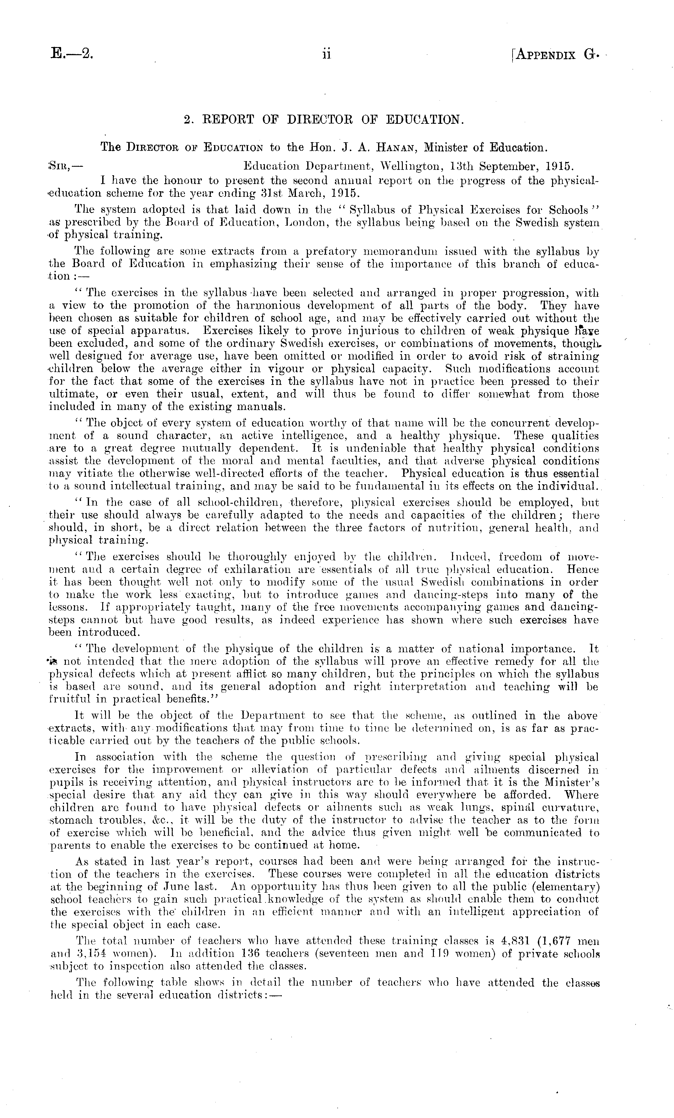 2. REPORT OF DIRECTOR OF EDUCATION. The Director of Education to the Hon. J. A. Hanan, Minister of Education. Sir, — Education Department, Wellington, 13th September, 1915. I have the honour to present the second annual report on the progress of the physical■eduoation scheme for the year ending 31st March, 1915. The system adopted is that laid down in the "Syllabus of Physical Exercises for Schools" as prescribed by the Board of Education, London, the syllabus being based on the Swedish system of physical training. The following are some extracts from a prefatory memorandum issued with the syllabus by the Board of Education in emphasizing their sense of the importance of this branch of education : — " The exercises in the syllabus have been selected and arranged in proper progression, with a view to the promotion of the harmonious development of all parts of the body. They have been chosen as suitable for children of school age, and may be effectively carried out without the use of special apparatus. Exercises likely to prove injurious to children of weak physique h*aye been excluded, and some of the ordinary Swedish exercises, or combinations of movements, though, well designed for average use, have been omitted or modified in order to avoid risk of straining •children below the average either in vigour or physical capacity. Such modifications account for the fact that some of the exercises in the syllabus have not in practice been pressed to their ultimate, or even their usual, extent, and will thus be found to differ somewhat from those included in many of the existing manuals. " The object of every system of education worthy of that name will be the concurrent development of a sound character, an active intelligence, and a health}' physique. These qualities are to a great degree mutually dependent. It is undeniable that healthy physical conditions assist the development of the moral and mental faculties, and that adverse physical conditions may vitiate the otherwise well-directed efforts of the teacher. Physical education is thus essential to a sound intellectual training, and may be said to be fundamental iv its effects on the individual. " In the case of all school-children, therefore, physical exercises should be employed, but their use should always be carefully adapted to the needs and capacities of the children; there should, in short, be a. direct relation between the three factors of nutrition, general health, and physical training. "The exercises should be thoroughly enjoyed by the, children. Indeed, freedom of movement and a certain degree of exhilaration are essentials of all true physical education. Hence it has been thought well not only to modify some of the usual Swedish combinations in order to make the work less exacting, but to introduce games and dancing-steps into many of the lessons. If appropriately taught, many of the free movements accompanying games and dancingsteps cannot but have good results, as indeed experience has shown where such exercises have been introduced. " The development of the physique of the children is a matter of national importance. It •i* not intended that the mere adoption of the syllabus will prove an effective remedy for all the physical defects which at present afflict so many children, but the principles on which the syllabus is based are sound, and its general adoption and right interpretation and teaching will be fruitful in practical benefits." It will be the object of the Department to see that the scheme, as outlined in the above ■extracts, with-any modifications that may from time to time be determined on, is as far as practicable carried out by the teachers of the public schools. In association with the scheme the question of prescribing and giving special physical exercises for the improvement or alleviation of particular defects and ailments discerned in pupils is receiving attention, and physical instructors are to be informed that it is the Minister's special desire that any aid they can give in this way should everywliere be afforded. Where children are found to have physical defects or ailments such as weak lungs, spinal curvature, stomach troubles, &c, it will be the duty of the instructor to advise the teacher as to the form of exercise which will bo beneficial, and the advice thus given might well "he communicated to parents to enable the exercises to be continued at home. As stated in last year's report, courses had been and were being arranged for the instruction of the teachers in the exercises. These courses were completed in all the education districts at the beginning of June last. An opportunity lias thus been given to all the public (elementary) school teachers to gain such practical .knowledge of the system as should enable them to conduct the exercises with the" children in an efficient manner and with an intelligent appreciation of the special object in each ease. The total number of teachers who have attended these training classes is 4,831 (1,677 men and 3,154 women). In addition 136 teachers (seventeen men and 119 women) of private schools subject to inspection also attended the classes. The following table shows in detail the number of teachers who have attended the classes held in the several education districts: —