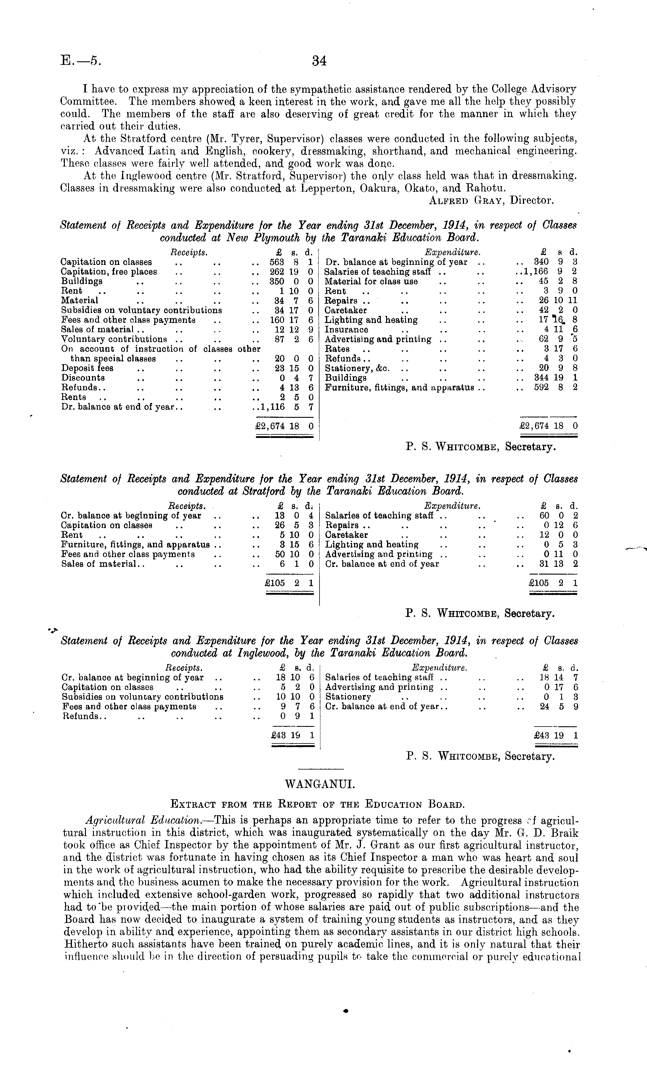 I have to express my appreciation of the sympathetic assistance rendered by the College Advisory Committee. The members showed a keen interest in the work, and gave me all the help they possibly could. The members of the staff are also deserving of great credit for the manner in which they carried out their duties. At the Stratford centre (Mr. Tyrer, Supervisor) classes were conducted in the following subjects, viz. : Advanced Latin and English, cookery, dressmaking, shorthand, and mechanical engineering. These classes were fairly well attended, and good work was done. At the Inglewood centre (Mr. Stratford, Supervisor) the only class held was that in dressmaking. Classes in dressmaking were also conducted at Lepperton, Oakura, Okato, and Rahotu. Alfred Gray, Director. Statement of Receipts and Expenditure for the Year ending 31st December, 1914, in respect of Classes conducted at New Plymouth by the Taranaki, Education Board. Receipts. £ s. d. Expenditure. £ s d. Capitation on classes .. .. .. 563 8 1 Dr. balance at beginning of year .. .. 340 9 3 Capitation, free places .. .. .. 262 19 0 Salaries of teaching stall .. .. ..1,166 9 2 Buildings .. .. .. .. 350 0 0 Material for class use .. .. .. 45 2 8 Rent .. .. .. .. .. 1 10 0 Rent .. .. .. .. .. 3 9 0 Material .. .. .. 34 7 6 Repairs .. .. .. .. 26 10 11 Subsidies on voluntary contributions .. 34 17 0 Caretaker .. .. .. 42 2 0 Fees and other class payments .. .. 160 17 6 Lighting and heating .. .. 17 16. 8 Sales of material .. .. .. .. 12 12 9 Insurance .. .. .. .. 411 6 Voluntary contributions .. .. .. 87 2 6 Advertising and printing .. .. ... 62 9 5 On account of instruction of classes other Rates .. .. .. .. .. 3 17 6 than special classes .. .. .. 20 0 0 Refunds.. .. .. .. .. 4 3 0 Deposit fees .. .. .. 23 15 0 Stationery, &c. .. .. .. 20 9 8 Discounts .. .. .. .. 0 4 7 Buildings .. .. .. .. 344 19 1 Refunds.. .. .. .. .. 4 13 6 Furniture, fittings, and apparatus .. .. 592 8 2 Rents .. .. .. .. .. 250 Dr. balance at end of year.. .. ..1,116 5 7 £2,674 18 0 £2,674 18 0 P. S. Whitcombe, Secretary. Statement of Receipts and Expenditure for the Year ending 31st December, 1914, in respect of Classes conducted at Stratford by the Taranaki Education Board. Receipts. £ s. d. Expenditure. £ s. d. Or. balance at beginning of year .. .. 13 0 4 Salaries of teaching staff .. .. .. 60 0 2 Capitation on classes .. .. .. 26 5 3 Repairs .. .. .. .. .. 012 6 Rent .. .. .. .. .. 510 0 Caretaker .. .. .. ..1200 Furniture, fittings, and apparatus .. .. 315 6 Lighting and heating .. .. .. 0 5 3 Fees and other class payments .. .. 50 10 0 Advertising and printing .. .. .. 011 0 Sales of material.. .. .. .. 6 10 Cr. balance at end of year .. .. 31 13 2 £105 2 1 £105 2 1 P. S. Whitcombe, Secretary. Statement of Receipts and Expenditure for the Year ending 31st December, 1914, in respect of Classes conducted at Inglewood, by the Taranaki Education Board. Receipts. £ s. d. Expenditure. £ s. d. Cr. balance at beginning of year .. .. 18 10 6 Salaries of teaching staff .. .. .. 18 14 7 Capitation on classes .. .. .. 5 2 0 Advertising and printing .. .. .. 017 6 Subsidies on voluntary contributions .. 10 10 0 Stationery .. .. .. .. 0 13 Fees and other class payments .. .. 9 7 6 Cr. balance at end of year.. .. .. 24 5 9 Refunds.. .. .. .. .. 0 9 1 £43 19 1 £43 19 1 P. S. Whitcombe, Secretary. WANGANUI. Extract from the Report of the Education Board. Agricultural Education. —This is perhaps an appropriate time to refer to the progress r{ agricultural instruction in this district, which was inaugurated systematically on the day Mr. G. D. Braik took office as Chief Inspector by the appointment of Mr. J. Grant as our first agricultural instructor, and the district was fortunate in having chosen as its Chief Inspector a man who was heart and soul in the work of agricultural instruction, who had the ability requisite to prescribe the desirable developments and the business acumen to, make the necessary provision for the work. Agricultural instruction which included extensive school-garden work, progressed so rapidly that two additional instructors had to "be piovided—the main portion of whose salaries are paid out of public subscriptions—and the Board has now decided to inaugurate a system of training young students as instructors, and as they develop in ability and experience, appointing them as secondary assistants in our district high schools. Hitherto such assistants have been trained on purely academic lines, and it is only natural that their influence should be in the direction of persuading pupils to take the commercial or purely educational