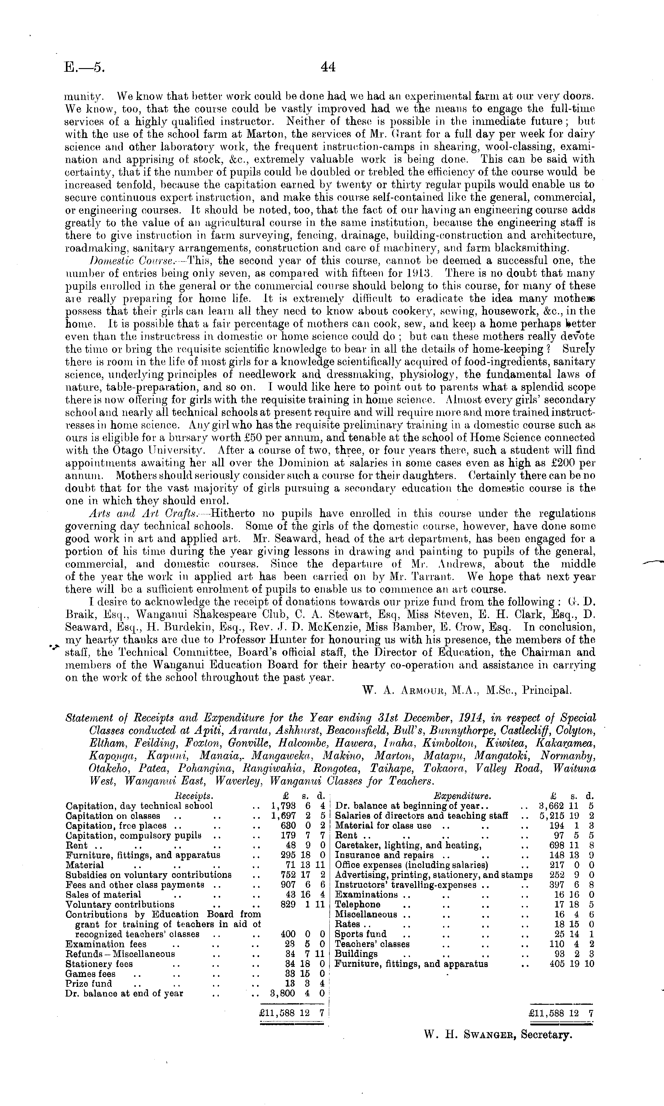 munity. We know that bettor work could be done had we had an experimental farm at our very doors. We know, too, that the course could be vastly improved had we the means to engage the full-time services of a highly qualified instructor. Neither of these is possible in the immediate future ; but with the use of the school farm at Marton, the services of Mr. Grant for a full day per week for dairy science and other laboratory work, the frequent instructi on -camps in shearing, woof-classing, examination and apprising of stock, &c, extremely valuable work is being done. This can be said with certainty, that if the number of pupils could be doubled or trebled the efficiency of the course would be increased tenfold, because the capitation earned by twenty or thirty regular pupils would enable us to secure continuous expert instruction, and make this course self-contained like the general, commercial, or engineering courses. It should be noted, too, that the fact of our having an engineering course adds greatly to the value of an agricultural course in the same institution, because the engineering staff is there to give instruction in farm surveying, fencing, drainage, buiiding-construction and architecture, roadmaking, sanitary arrangements, construction and care of machinery, and farm blacksmithing. Domestic, Course. —This, the second year of this course, cannot be deemed a successful one, the number of entries being only seven, as compared with fifteen for 1913. There is no doubt that many pupils enrolled in the general or the commercial course should belong to this course, for many of these are really preparing for home life. It is extremely difficult to eradicate the idea many mothers possess that their- girls can learn all they need to know about cookery, sowing, housework, &c.,inthe home. It is possible that a fair percentage of mothers can cook, sew, and keep a home perhaps better even than the instructress in domestic or home science could do ; but can these mothers really devote the time or bring the requisite scientific knowledge to bear in all the details of home-keeping ? Surely there is room in the life of most girls for a knowledge scientifically acquired of food-ingredients, sanitary science, underlying principles of needlework and dressmaking, physiology, the fundamental laws of nature, table-preparation, and so on. I would like here to point out to parents what a splendid scope there is now offering for girls with the requisite training in home science. Almost every girls' secondary school and nearly all technical schools at present require and will require more and more trained instructresses in home science. Any girl who has the requisite preliminary training in a domestic course such as ours is eligible for a bursary worth £50 per annum, and tenable at the school of Home Science connected with the Otago University. After a course of two, three, or four years there, such a student will find appointments awaiting her all over the Dominion at salaries in some cases even as high as £200 per annum. Mothers should seriously consider such a course for their daughters. Certainly there can be no doubt that for the vast majority of girls pursuing a secondary education the domestic course is the one in which they should enrol. Arts and Art Crafts. Hitherto no pupils have enrolled in this course under the regulations governing day technical schools. Some of the girls of the domestic course, however, have done some good work in art and appiied art. Mr. Seaward, head of the art department, has been engaged for a portion of his time during the year giving lessons in drawing and painting to pupils of the general, commercial, and domestic courses. Since the departure of Mr. Andrews, about the middle of the year the work in applied art has been carried on by Mr. Tarrant. We hope that next year there will bo a sufficient enrolment of pupils to enable us to commence an art course. I desire to acknowledge the receipt of donations towards our prize fund from the following : G. D. Braik, Esq., Wanganui Shakespeare Club, C. A. Stewart, Esq, Miss Steven, E. H. Clark, Esq., D. Seaward, Esq., H. Burdekin, Esq., Rev. J. D. McKenzie, Miss Bamber, E. Crow, Esq. In conclusion, my hearty thauks are due to Professor Hunter for honouring us with his presence, the members of the staff, the Technical Committee, Board's official staff, the Director of Education, the Chairman and members of the Wanganui Education Board for their hearty co-operation and assistance in carrying on the work of the school throughout the past year. W. A.. Armour, M.A., M.Sc, Principal. Statement of Receipts and Expenditure for the Year ending 31sl December, 1914, in respect of Special Classes conducted at Apiti, Ararata, Ashhurst, Beacousfleld, Bull's, Bunnythorpe, Castlecliff, Colyton, Eltham, Feilding, Foxton, Gonville, Halcombe, Hawera, Inaha, Kimbolton, Kiwitea, Kakaramea, Kapojtga, Kapuni, Manaia,. Mangaweka, Makino, Marton, Matapu, Mangatoki, Normanby, Otakeho, Patea, Pohangina, Rangiwahia, Rongotea, Taihape, Tokaora, Valley Road, Waituna West, Wanganui East, Waverley, Wanganui Classes for Teachers. Receipts. £ s. d. Expenditure. £ s. d. Capitation, day technical school .. 1,793 6 4 ] Dr. balance at beginning of year.. .. 3,662 11 5 Capitation on olasses .. .. .. 1,697 2 5 ' Salaries of directors and teaching staff .. 5,215 19 2 Capitation, free places .. .. .. 630 0 2 i Material for class use .. .. .. 194 1 3 Capitation, compulsory pupils .. .. 179 7 7 Rent .. .. .. .. .. 97 5 5 Bent .. .. .. .. .. 48 9 0 Caretaker, lighting, and hoating, .. 698 11 8 Furniture, fittings, and apparatus .. 295 18 0 Insurance and repairs .. .. .. 148 18 9 Material .. .. .. .. 71 13 11 Offioe expenses (including salaries) .. 217 0 0 Subsidies on voluntary contributions .. 752 17 2 j Advertising, printing, stationery, and stamps 252 9 0 Pees and other class payments .. .. 907 6 6 ] Instructors' travelling-oxponses .. .. 397 6 8 Sales of mate