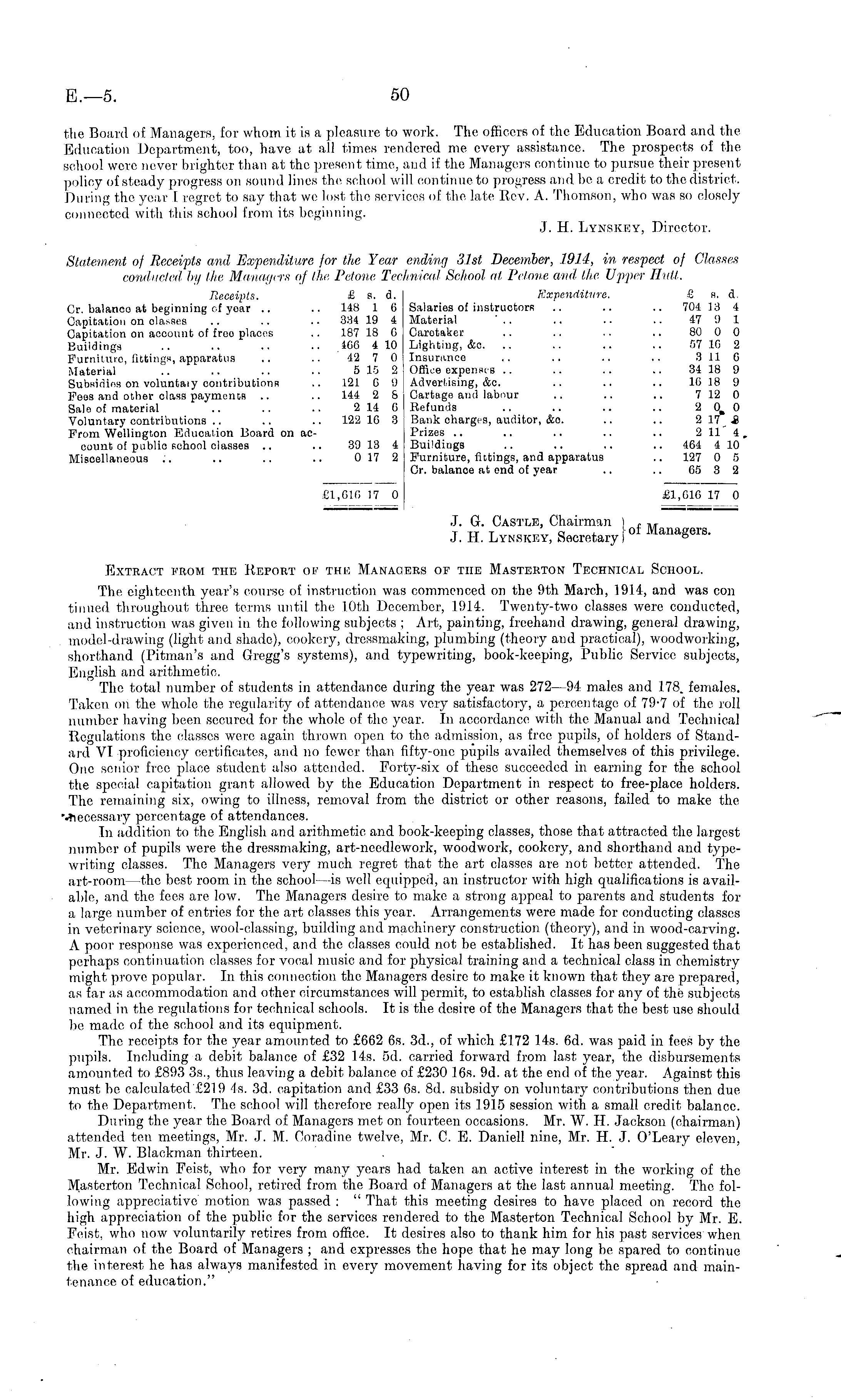 the Board of Managers, for whom it is a pleasure to work. The officers of the. Education Board and the Education Department, too, have at all times rendered me every assistance. The prospects of the school were never brighter than at the present time, and if the Managers continue to pursue their present policy of steady progress on sound lines the school will continue to progress ami be a credit to the district. Daring the year I regret to say that we lost the services of the late Rev. A. Thomson, who was so closely connected with this school from its beginning. ,). H. Lynskey, Director. Statement oj Receipts and Expenditure for the Year ending 31st December, 1911, in respect of Classes conducted by the Managers of the Petone Technical School al Petone and the Upper Hull. Receipts. £ s. d. Expenditure, £ h. d. Cr. balaneo at beginning of voar .. .. 148 1 6 Salaries of instructors .. .. .. 704 13 4 Capitation on olasses ~ .. .. 334 19 4 Material ' .. .. .. .. 47 9 1 Capitation on account of froo places .. 187 18 6 Caretaker .. .. .. .. 80 0 0 Buildings .. .. .. .. .400 410 Lighting, &o. .. .. .. .. 57 16 2 Furniture, fittings, apparatus .. .. 42 7 0 Insurance .. .. .. .. 3 11 6 Material .. .. .. .. 5 15 2 Office expenses .. .. .. .. 34 18 9 Subsidies on voluntary contributions .. 121 69 j Advertising, &c. .. .. .. 16 18 9 Pees and other class payments .. .. 144 2 8 i Cartage and labour .. .. .. 712 0 Sale of material .. .. .. 2 14 6 Befunds .. .. .. .. 2 0. 0 Voluntary contributions .. .. .. 122 16 3 Bank charges, auditor, &o. .. .. 217 £ Prom Wellington Education Board on ac- Prizes .. .. .. .. .. 2 11 4 oount of public school classes .. .. 39 13 4 Buildings .. .. .. .. 464 410 Miscellaneous .. .. .. .. 017 2 Furniture, fittings, and apparatus .. 127 0 5 Cr. balance at end of year .. .. 65 3 2 £1,616 17 0 £1,616 17 0 J. G. Castle, Chairman ) „ , T J. 11. Lynskey, Secretary! ol Manfl « ers - Extract from the Report oi thm Managers of the M'asterton Technical School. The eighteenth year's course of instruction was commenced on the 9th March, 1914, and was con tinned throughout three terms until the I.oth December, 1914. Twenty-two classes were conducted, and instruction was given in the following subjects ; Art, painting, freehand drawing, general drawing, model-drawing (light and shade), cookery, dressmaking, plumbing (theory and practical), woodworking, shorthand (Pitman's and Gregg's systems), and typewriting, book-keeping, Public Service subjects, English and arithmetic. The total number of students in attendance during the year was 272 —94 males and 178. females. Taken on the whole the regularity of attendance was very satisfactory, a percentage of 79-7 of the roll number having been secured for the whole of the year. In accordance with the Manual and Technical Regulations the classes were again thrown open to the admission, as tree pupils, of holders of Standard VI proficiency certificates, and no fewer than fifty-one pupils availed themselves of this privilege. One senior free place student also attended. Forty-six of these succeeded in earning for the school the special capitation grant allowed by the Education Department in respect to free-place holders. The remaining six, owing to illness, removal from the district or other reasons, failed to make the '.Tiecessary percentage of attendances. Tn addition to the English and arithmetic and book-keeping classes, those that attracted the largest number of pupils were the dressmaking, art-needlework, woodwork, cookery, and shorthand and typewriting classes. The Managers very muo;h regret that the art classes are not better attended. The art-room —the best room in the school —is well equipped, an instructor with high qualifications is available, and the fees are low. The Managers desire to make a strong appeal to parents and students for a large number of entries for the art classes this year. Arrangements were made for conducting classes in veterinary science, wool-classing, building and machinery construction (theory), and in wood-carving. A poor response was experienced, and the classes could not be established. It has been suggested that perhaps continuation classes for vocal music and for physical training and a technical class in chemistry might prove popular. In this connection the Managers desire to make it known that they are prepared, as far as accommodation and other circumstances will permit, to establish classes for any of the subjects named in the regulations for technical schools. It is the desire of the Managers that the best use should be made of the school and its equipment. The receipts for the year amounted to £662 6s. 3d., of which £172 14s. 6d. was paid in fees by the pupils. Including a debit balance of £32 Ms. sd. carried forward from last year, the disbursements amounted to £893 35., thus leaving a debit balance of £230 16s. 9d. at the end of the year. Against this must be oaloulated'£2l9 -Is. 3d. capitation and £33 6s. Bd. subsidy on voluntary contributions then due to the Department. The school will therefore really open its 1915 session with a small credit balance. During the year the Board of Managers met on fourteen occasions. Mr. W. H. Jackson (chairman) attended ten meetings, Mr. J. M. Coraoline twelve, Mr. C. E. Daniell nine, Mr. H. I. O'Leary eleven, Mr. J. W. Blackman thirteen. Mr. Edwin Feist, who for very many years had taken an active interest in the working of the Masterton Technical School, retired from the Board of Managers at the last annual meeting. The, following appreciative motion was passed : " That this meeting desires to have placed on record the high appreciation of the public for the services rendered to the Masterton Technical School by Mr. E. Feist, who now voluntarily retires from office. It desires also to thank him for his past services when chairman of the Board of Managers ; and expresses the hope that he may long be spared to continue the interest he has alwa